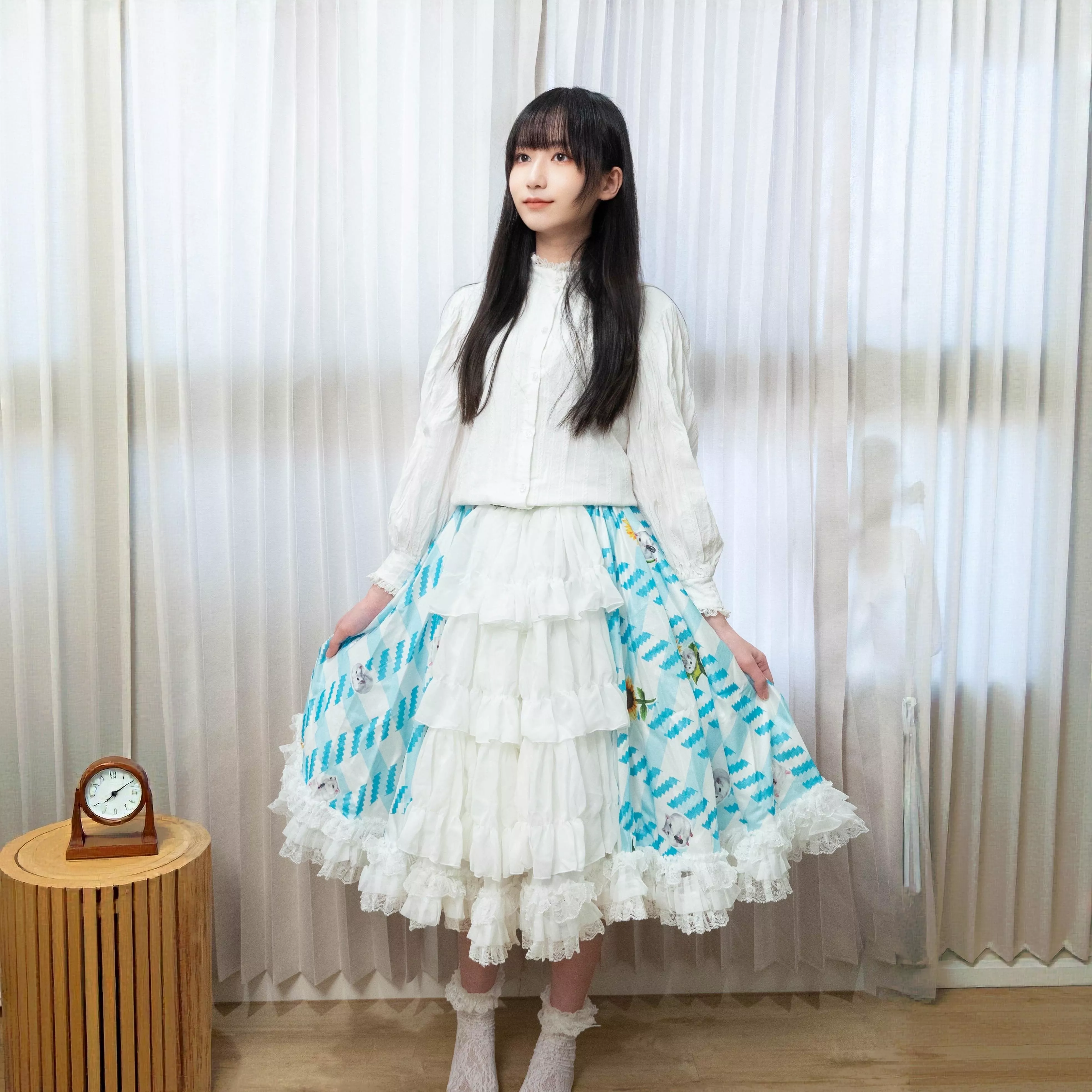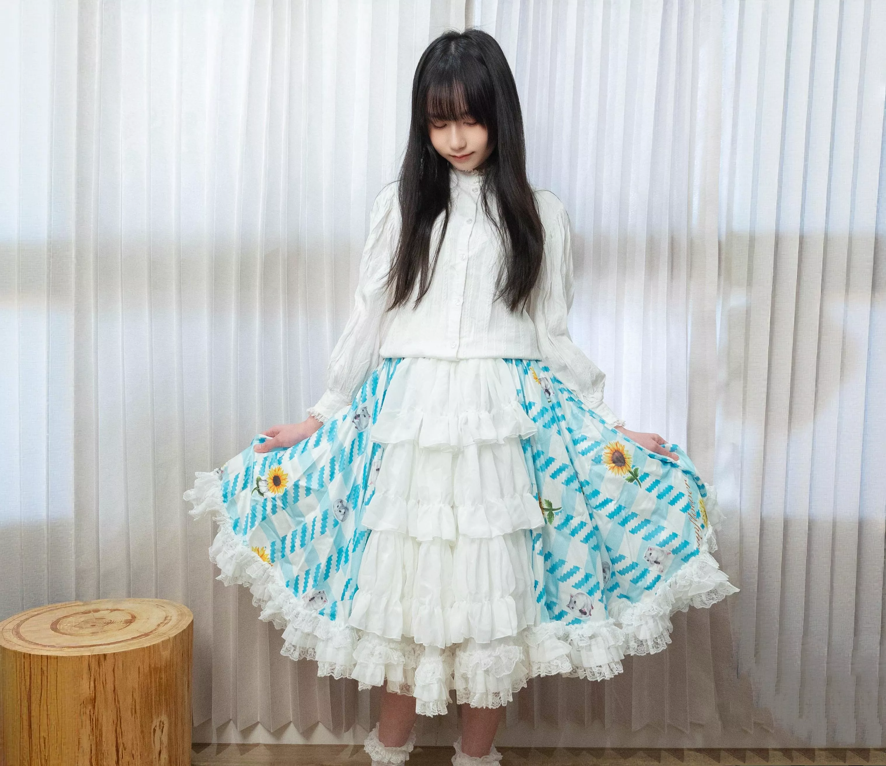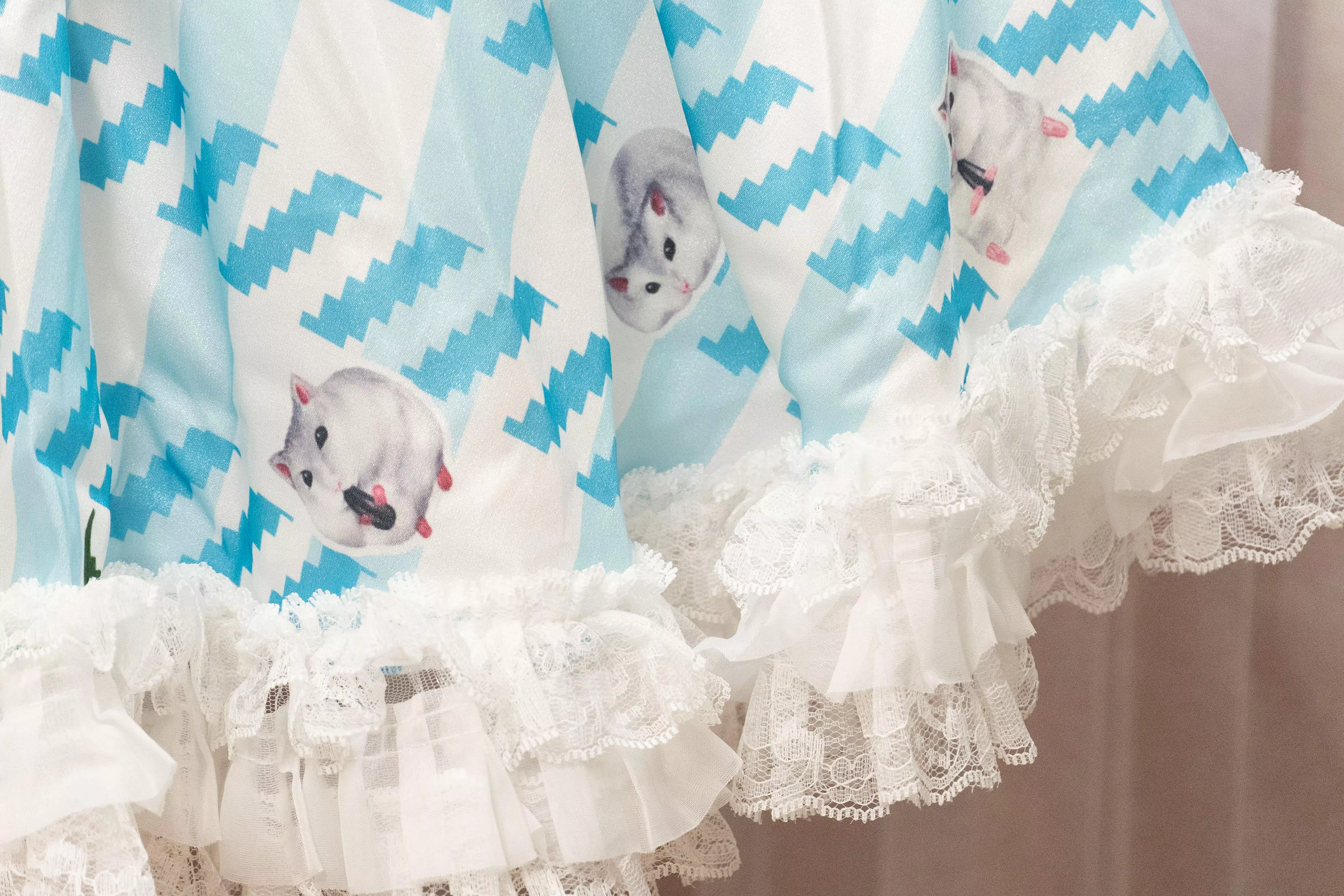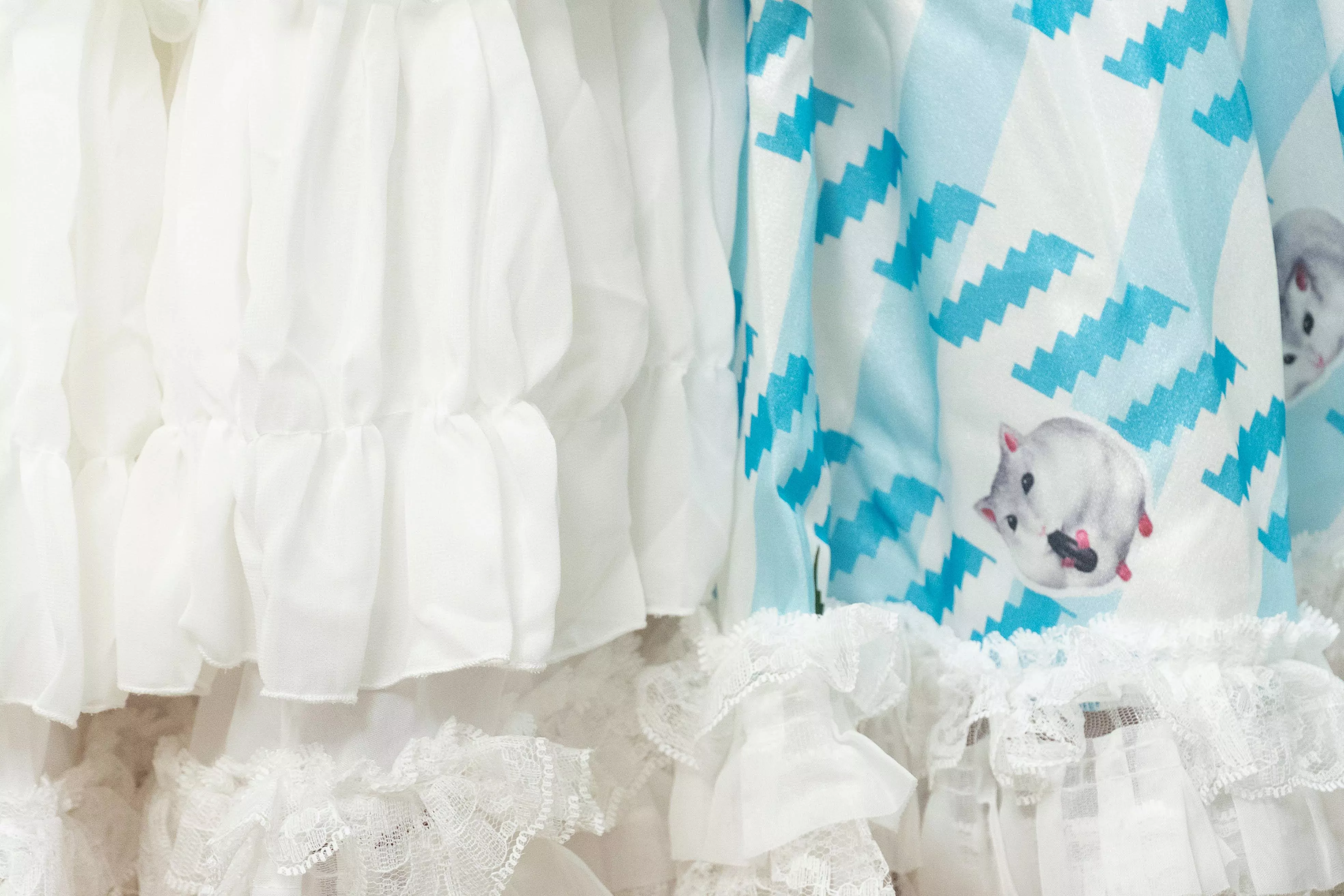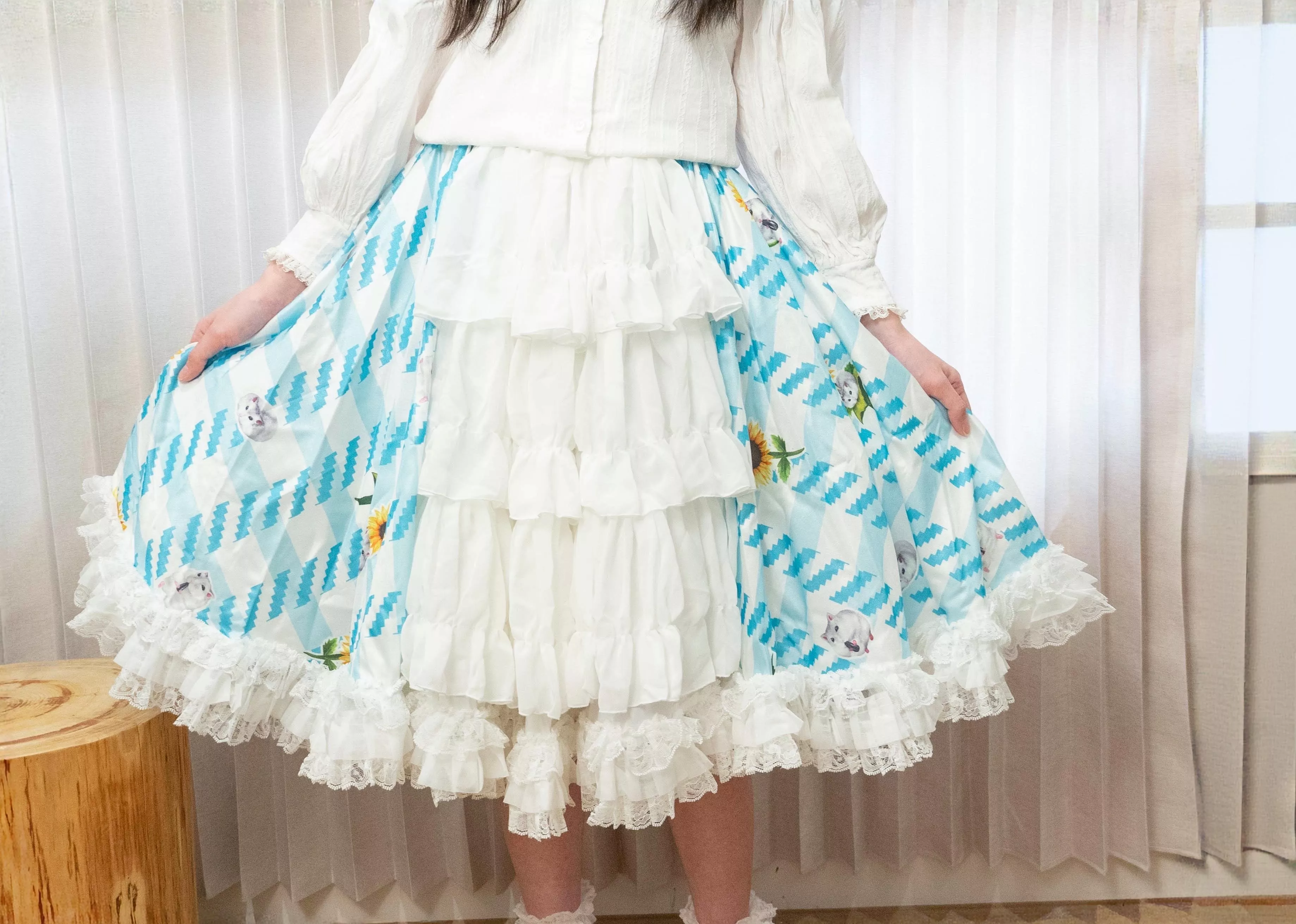 茉紡獨家印花布料製作,搭配層層柔紗與蕾絲裙襬,呈現甜美又不失細緻的手作感。