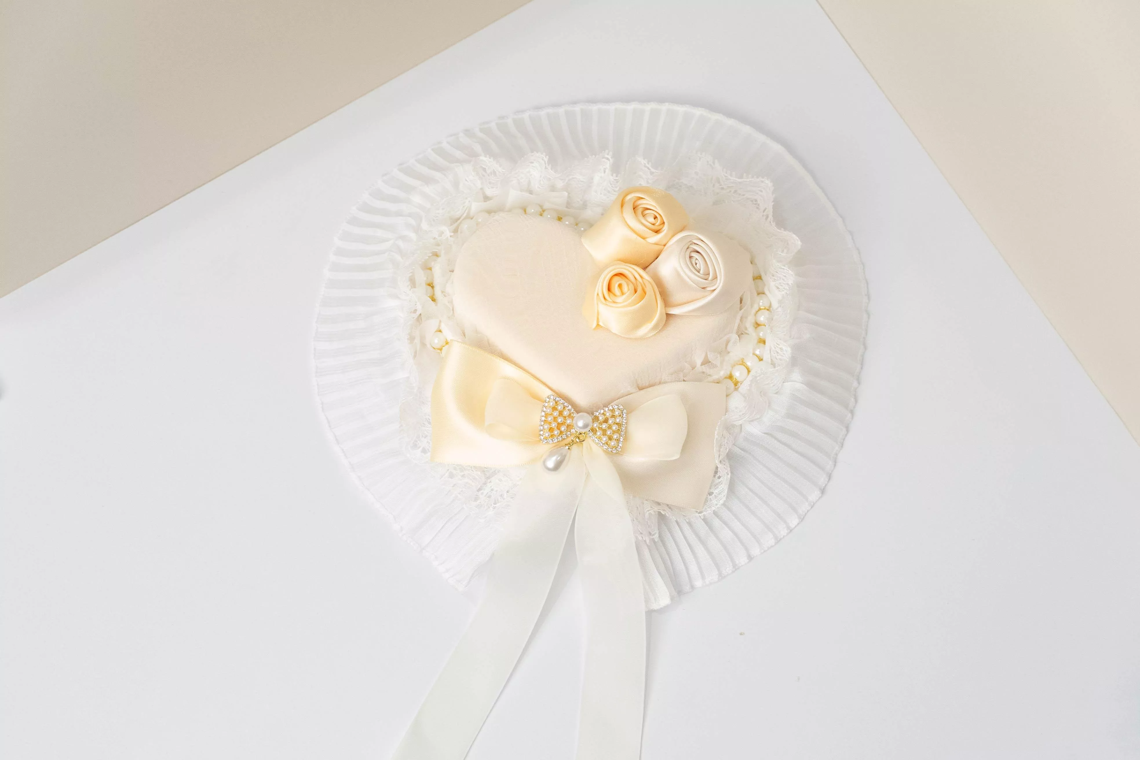 玫瑰花與珍珠滾邊 愛心蕾絲小禮帽髮夾|奶油白