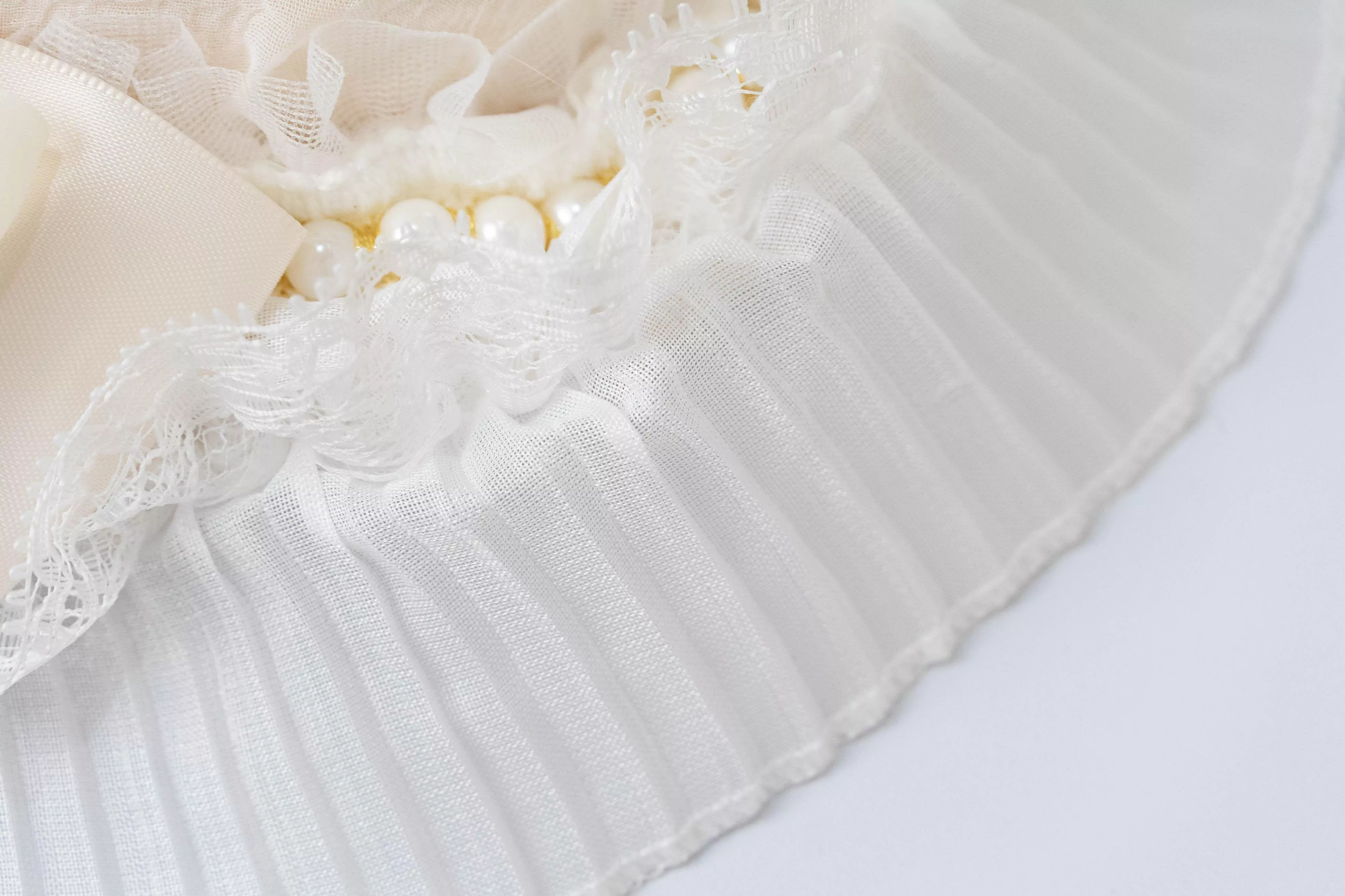 層層堆疊的蕾絲與百褶紗,搭配細緻珍珠滾邊,將立體緞帶玫瑰的高雅氣質完美襯托。