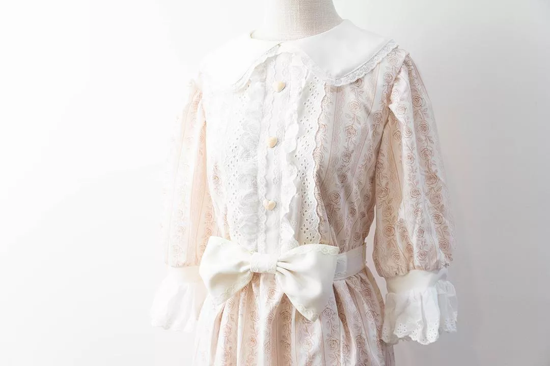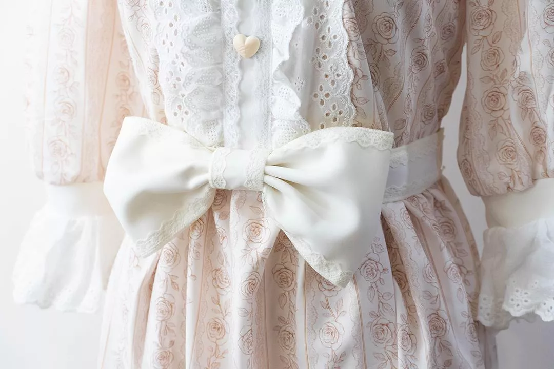貝蕾帽蕾絲邊OP是米色,咖啡色處換成與腰帶同款米色(此照片為JSK咖啡色蕾絲邊)