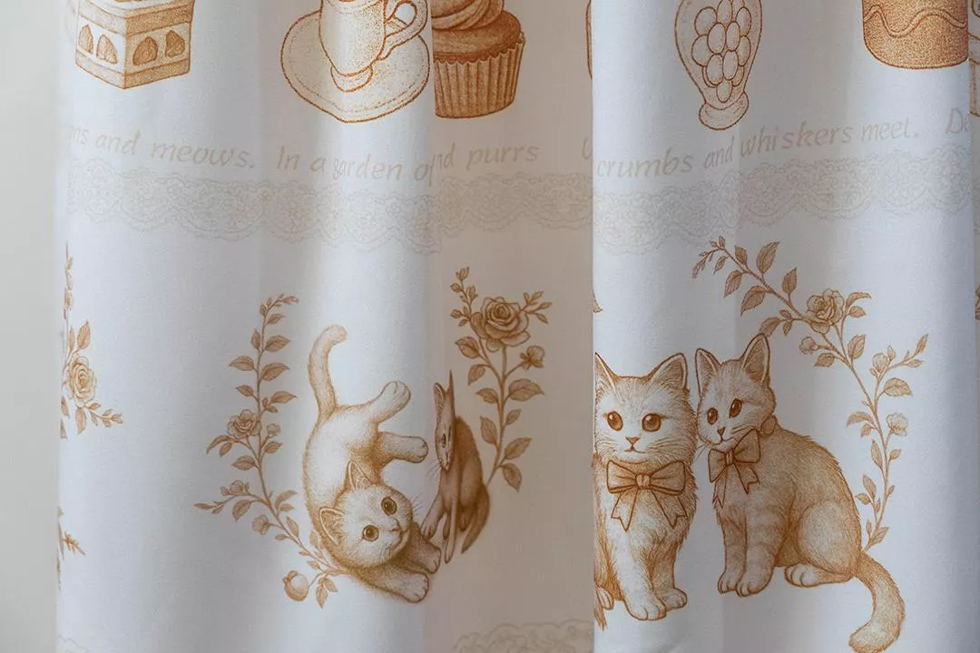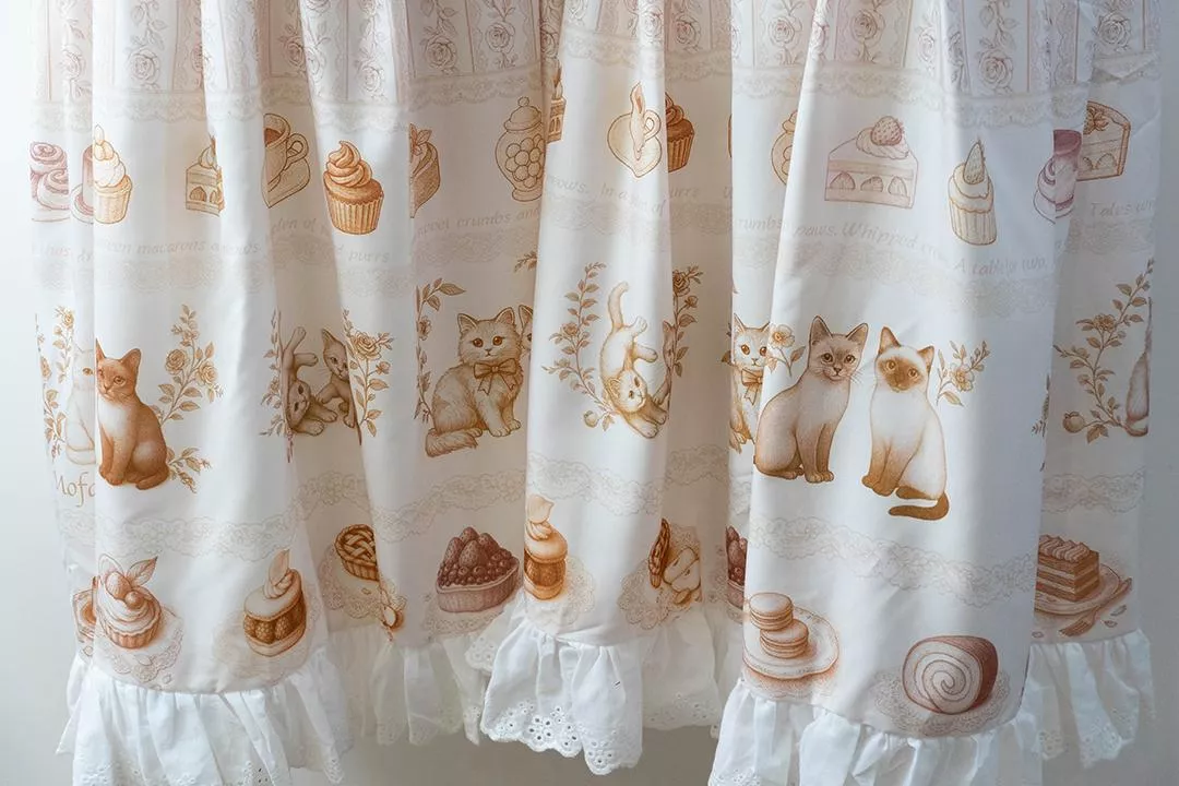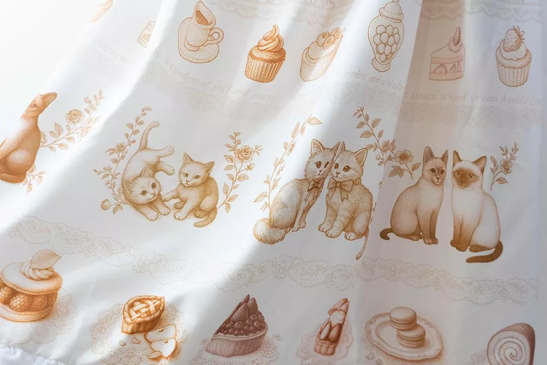 裙襬為高密度印花,點綴可愛小貓與奶油花卉,層次豐富。