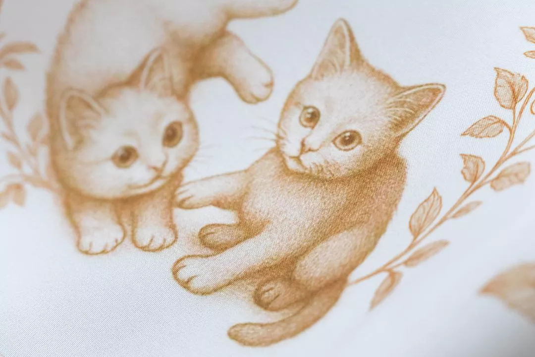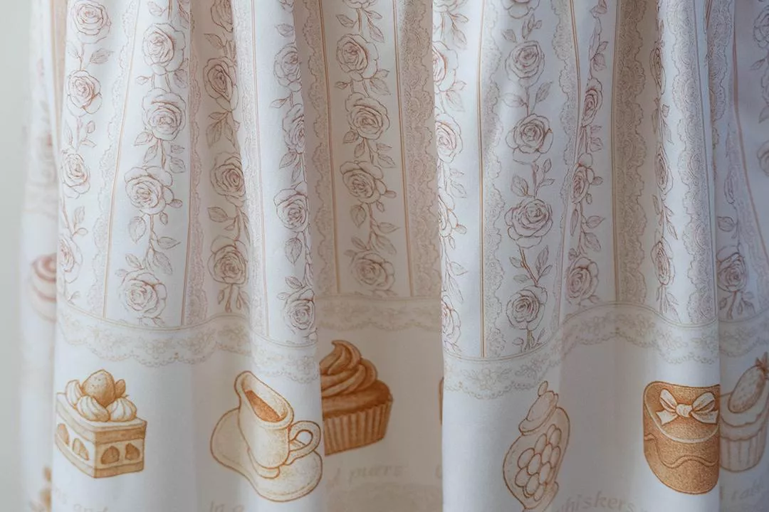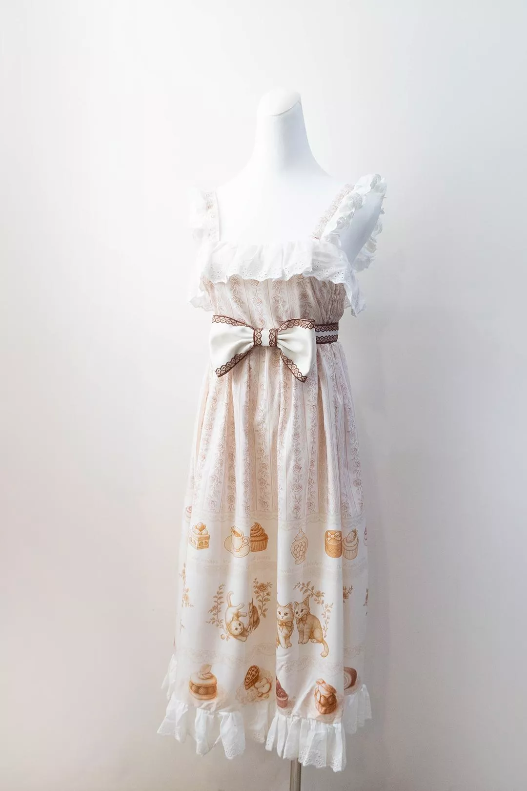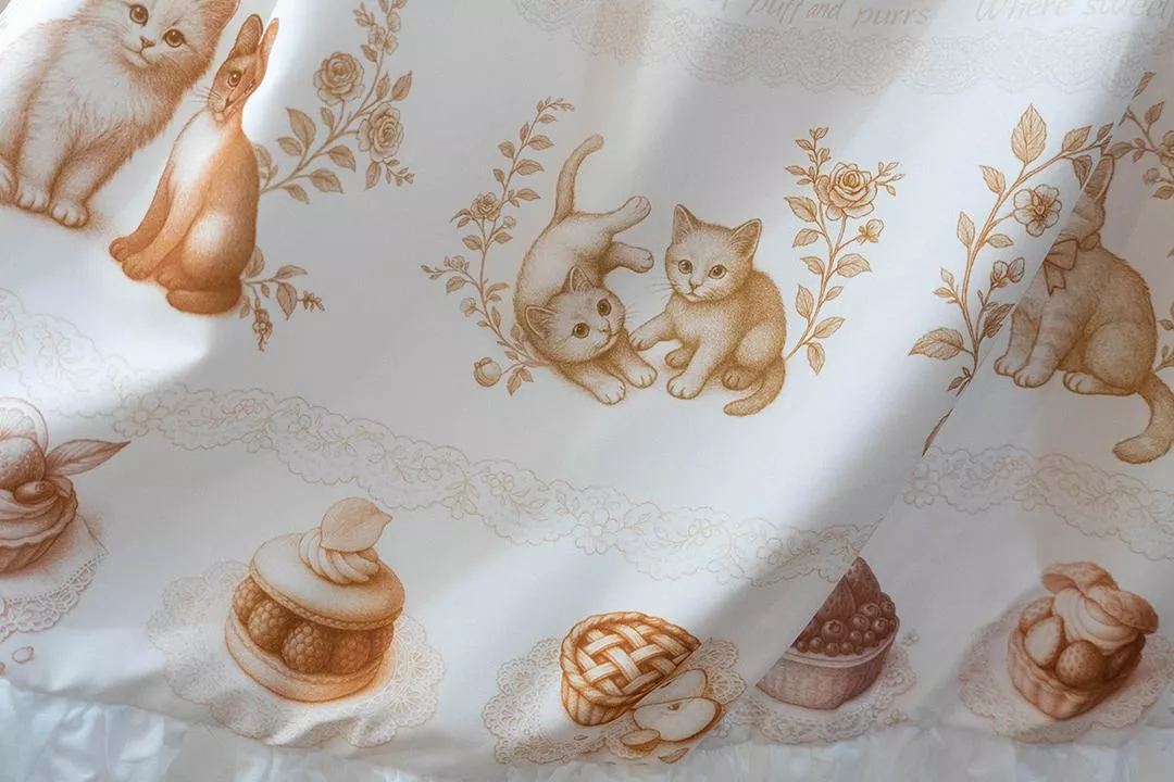 裙襬為高密度印花,點綴可愛小貓與奶油花卉,增添甜美氛圍。