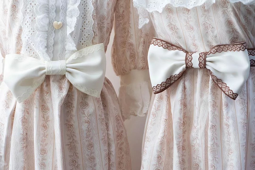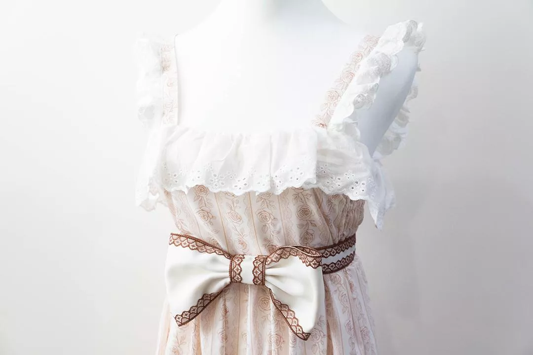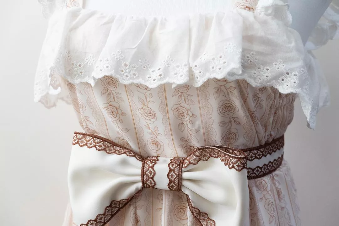 貝蕾帽蕾絲邊OP是米色,咖啡色處換成與腰帶同款米色(此照片為JSK咖啡色蕾絲邊)