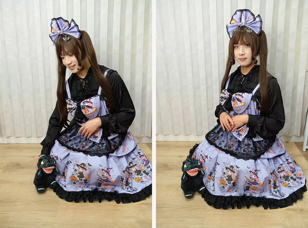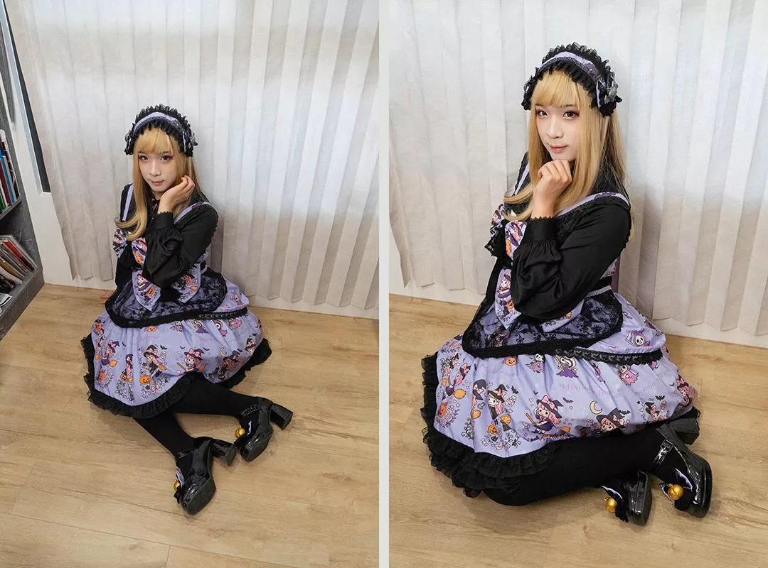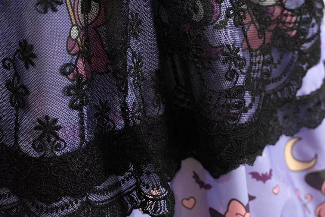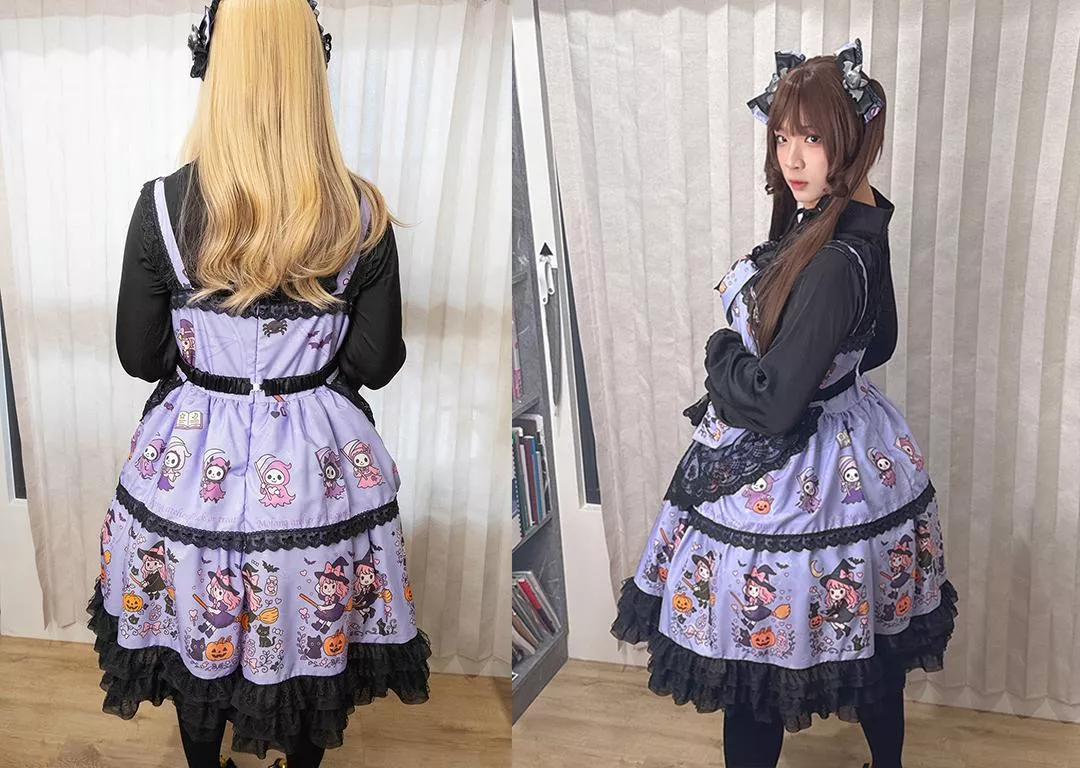 裙身設計為雙層裙擺,下層搭配黑色蕾絲裝飾,讓層次更豐富。兩側設有鬆緊帶,背後為隱形拉鍊設計,拉鍊高度經過特別調整,方便自己穿脫。