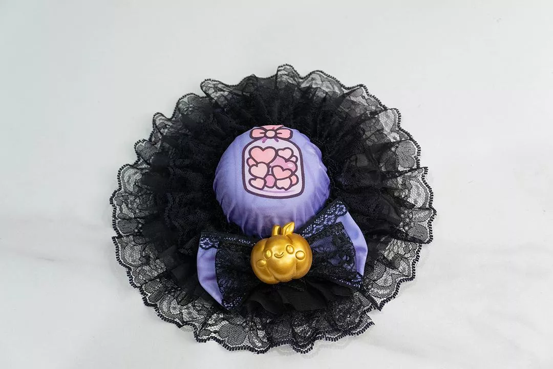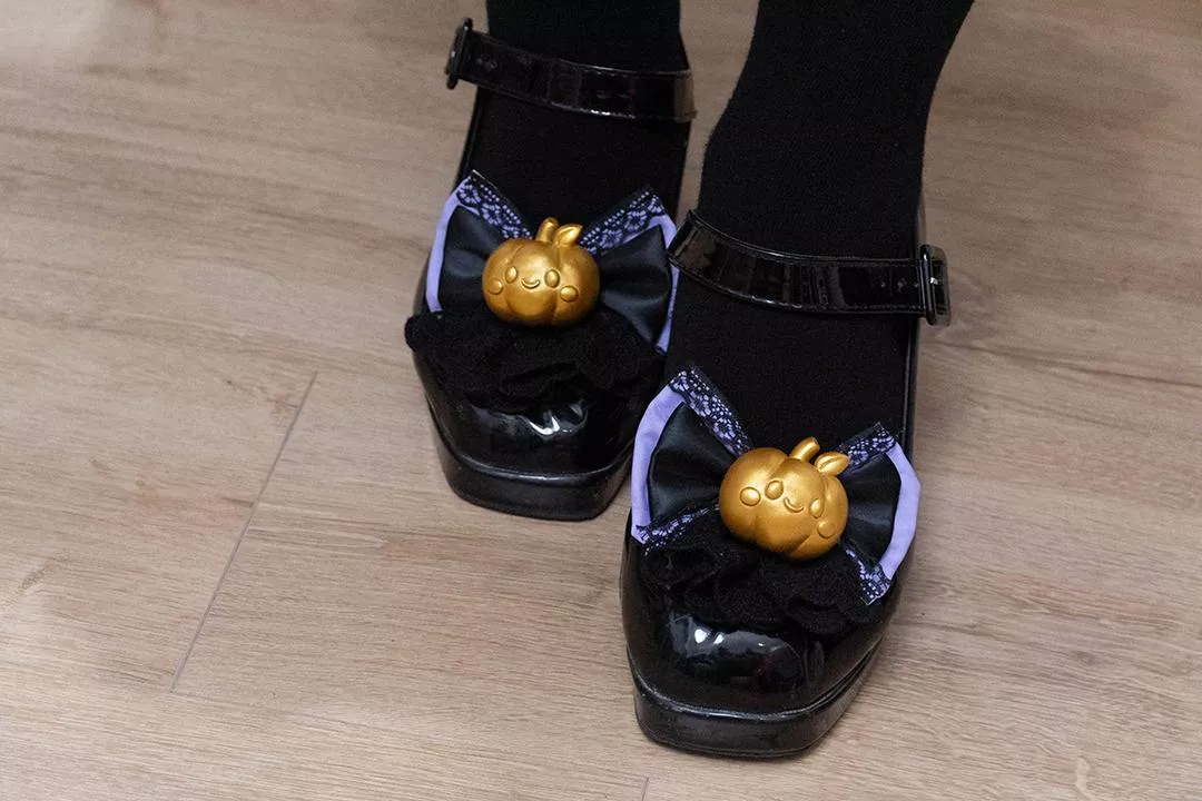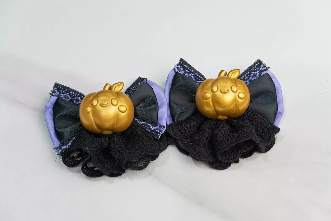 迷你南瓜立體裝飾搭配黑蕾絲底座,夾於鞋頭即瞬間呼應整套萬聖主題。