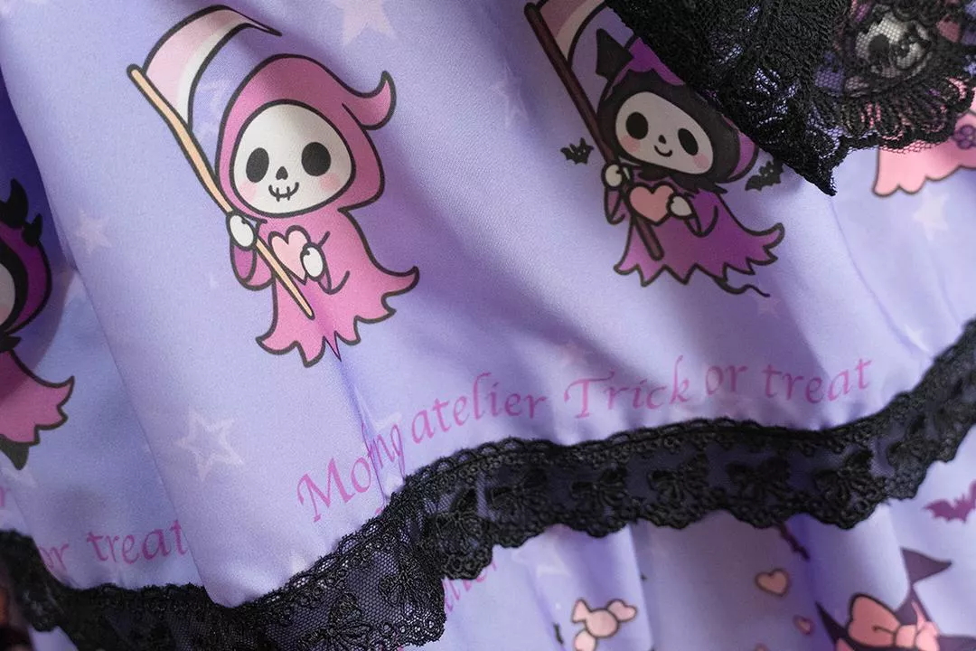以紫色夜空為主調,點綴可愛小女巫、黑貓、南瓜、骷髏與魔法瓶,