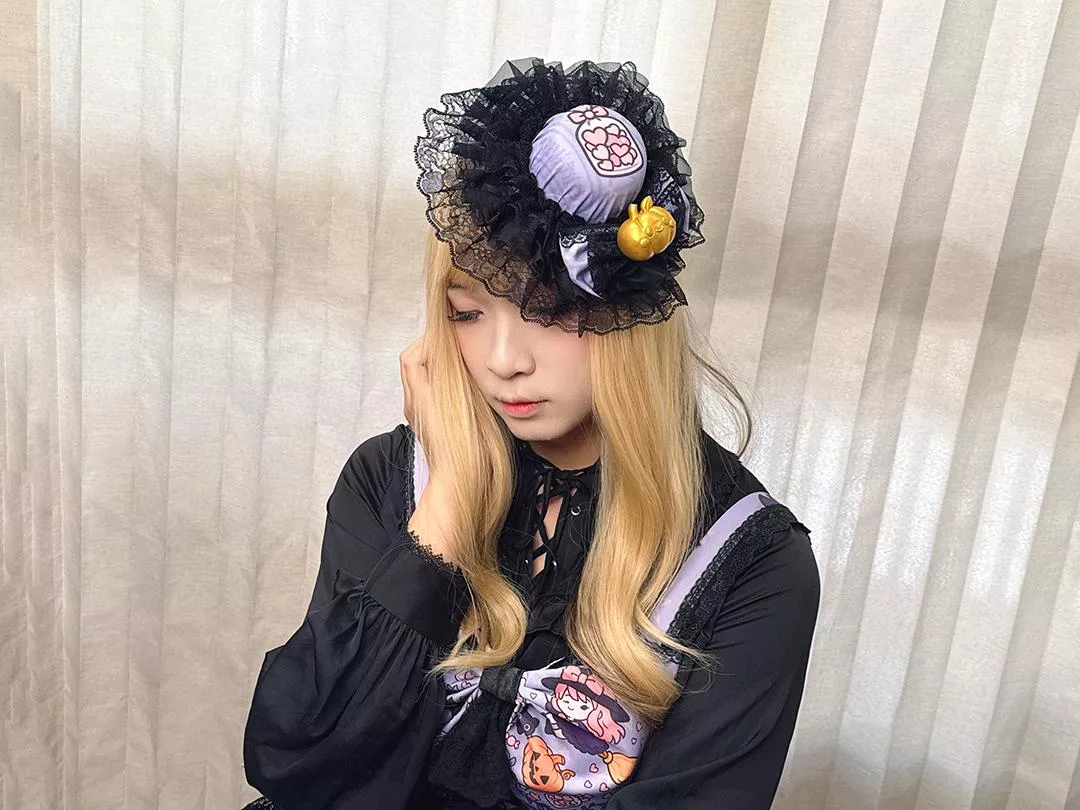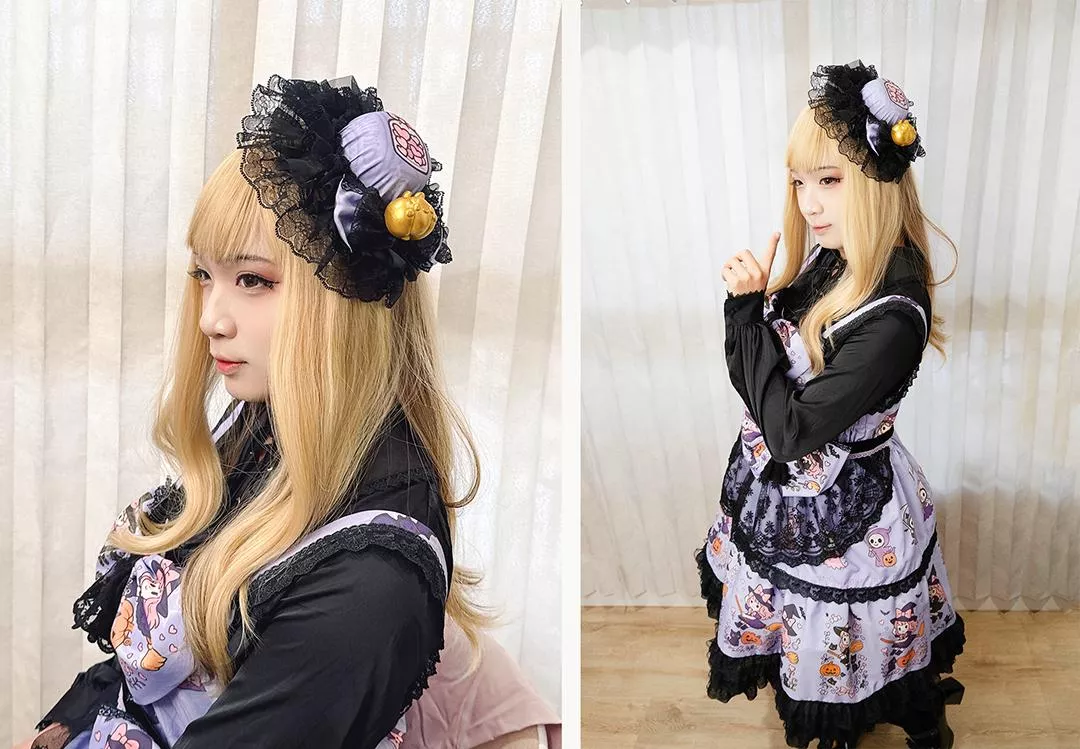 外圈堆疊黑蕾絲,搭配南瓜裝飾與品牌印花布,