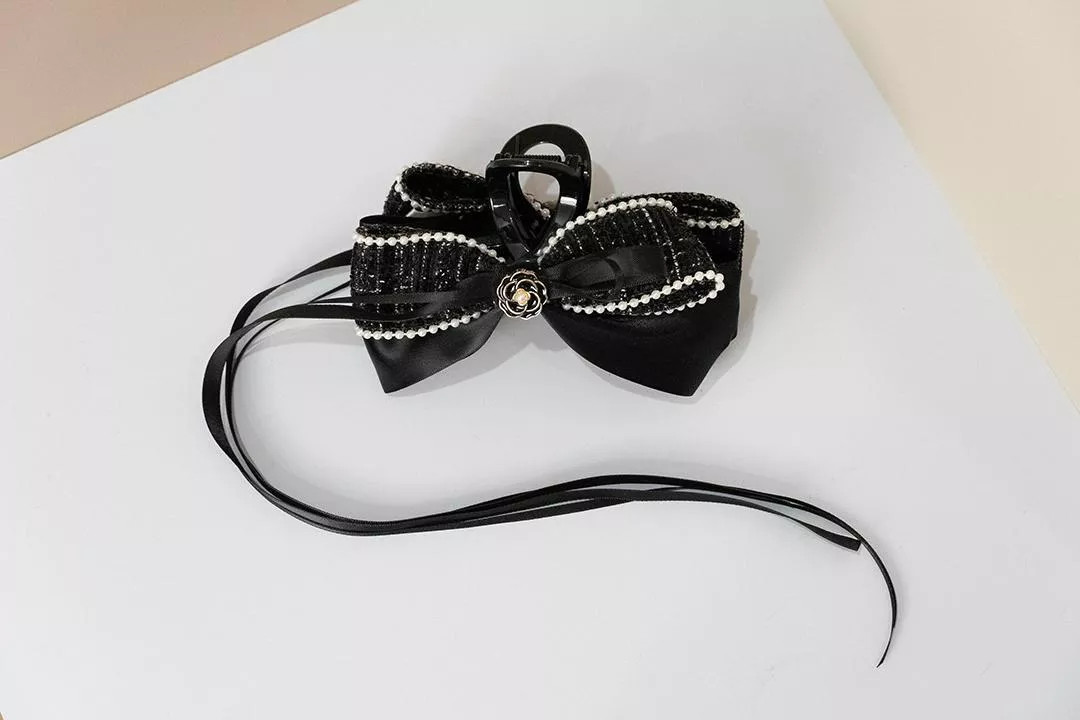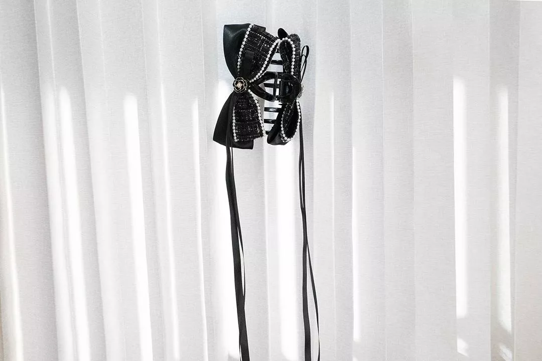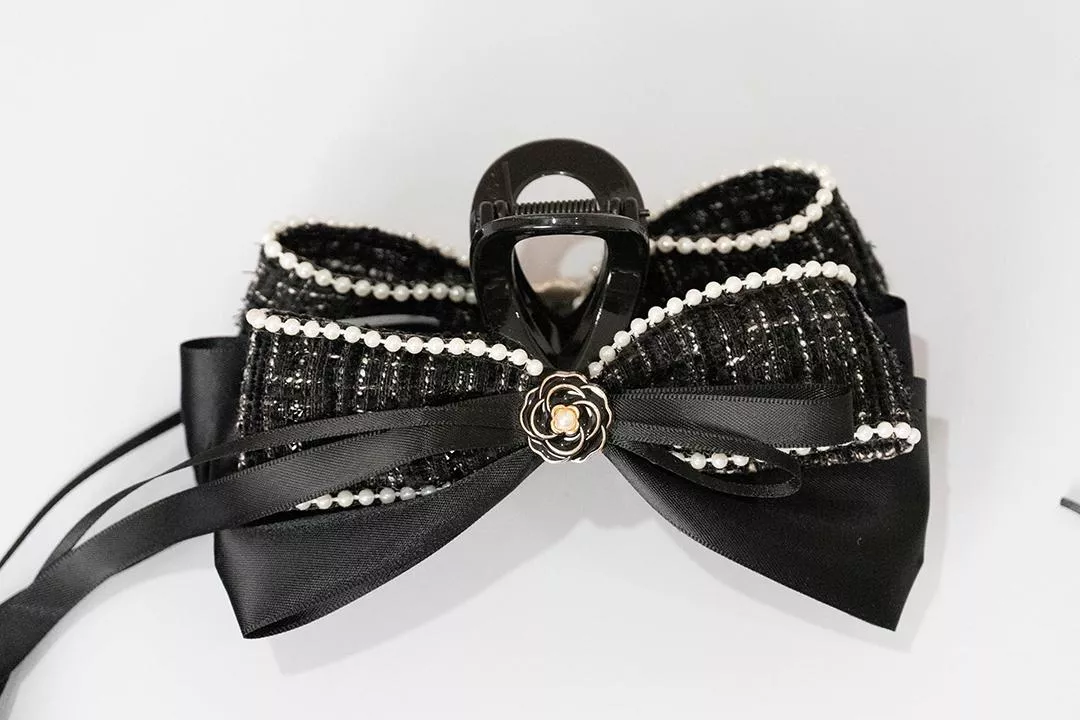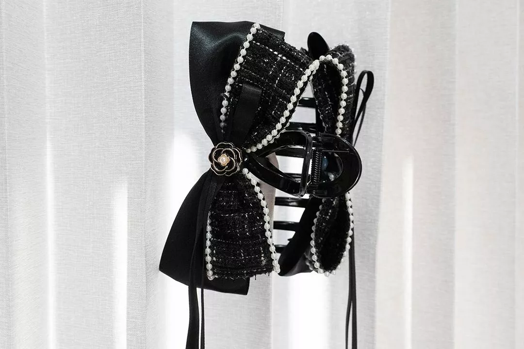 黑色小香風布料結合珍珠點綴,低調中帶著成熟與份量感。黑緞蝴蝶結讓整體線條更加俐落,呈現優雅又冷靜的氣勢。
