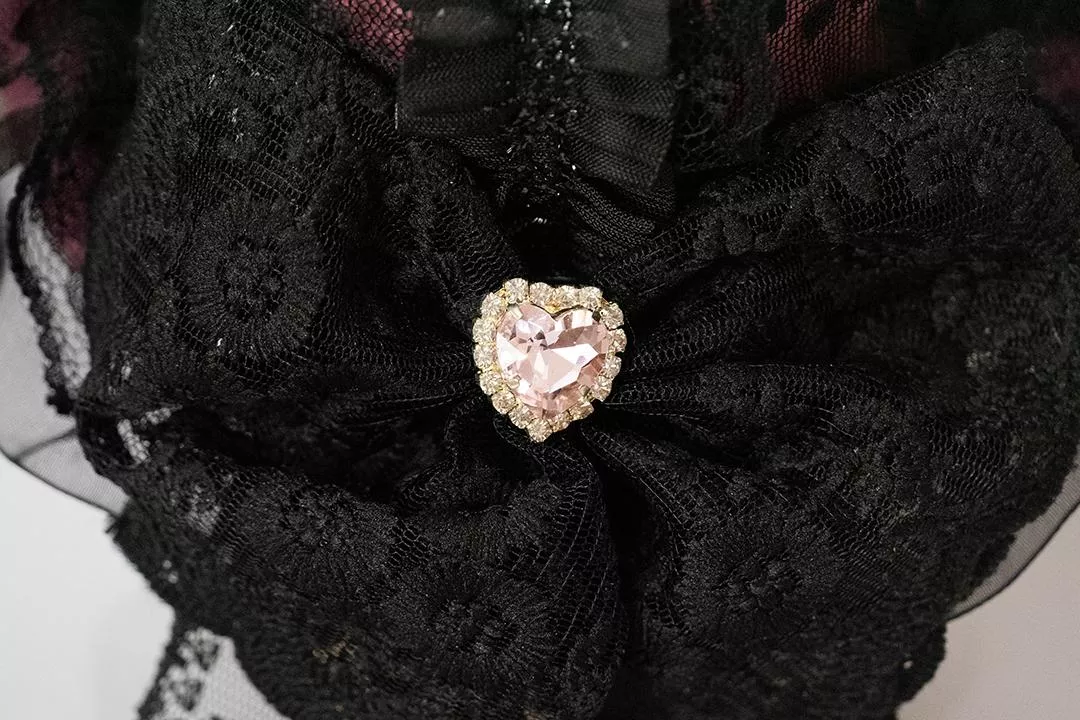 中央以粉色心形寶石作為視覺焦點,溫柔中帶著一絲脆弱感,讓整體不只停留在暗黑,而是保留了屬於茉紡的細膩與浪漫。垂落的蕾絲線條自然延伸,讓造型在靜止時仍保有流動感。