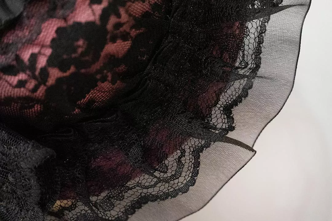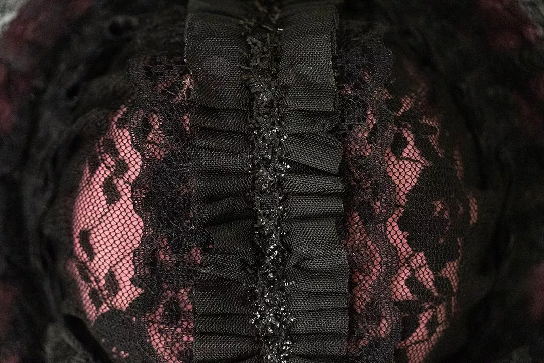 以深黑薄紗與層疊蕾絲構成的圓頂輪廓,包覆著低調卻濃烈的情緒。黑色蕾絲在光影中透出細緻紋理,內層隱約透出的玫瑰粉色,像是藏在夜色裡的柔軟心事,不張揚,卻無法忽視。