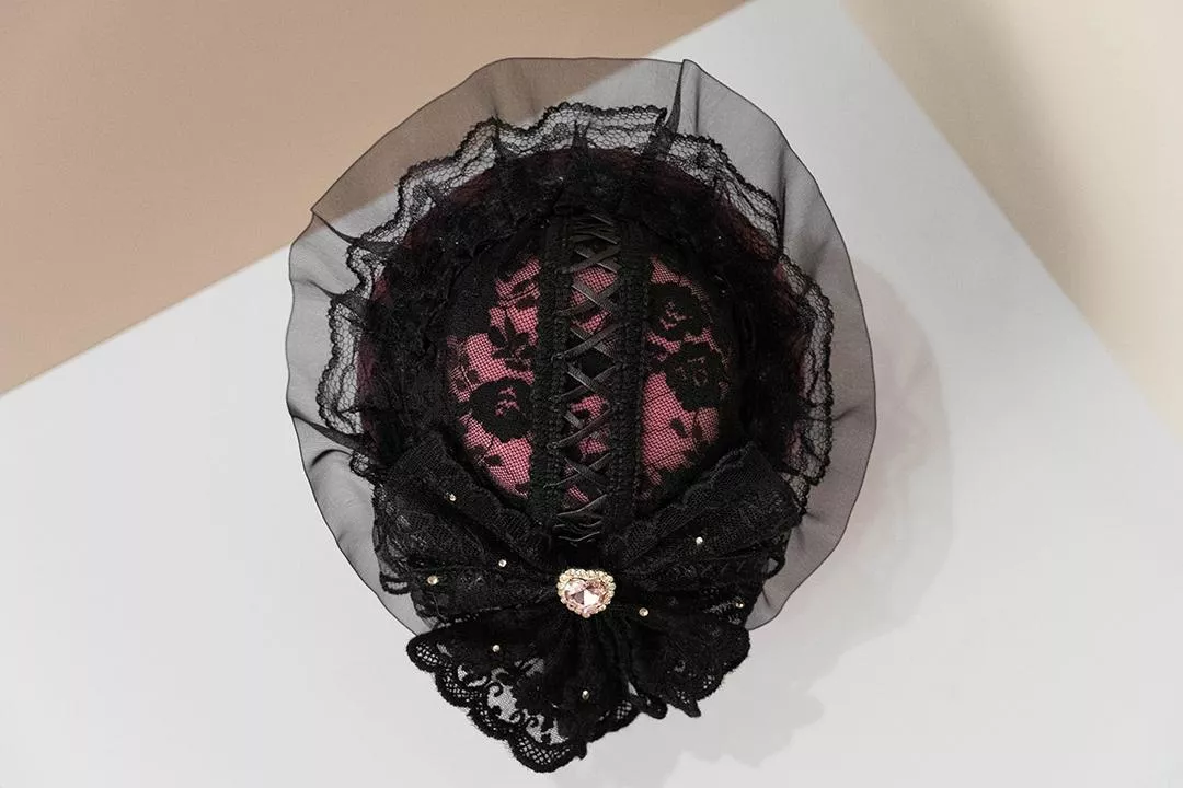 帽體中央以立體打褶與交錯線條構成立面結構,使整體輪廓更為集中且立體,視覺上自然向中心收攏。表面覆以細緻蕾絲,邊緣以輕柔黑紗勾勒,讓帽型在光線下呈現柔和的層次變化。