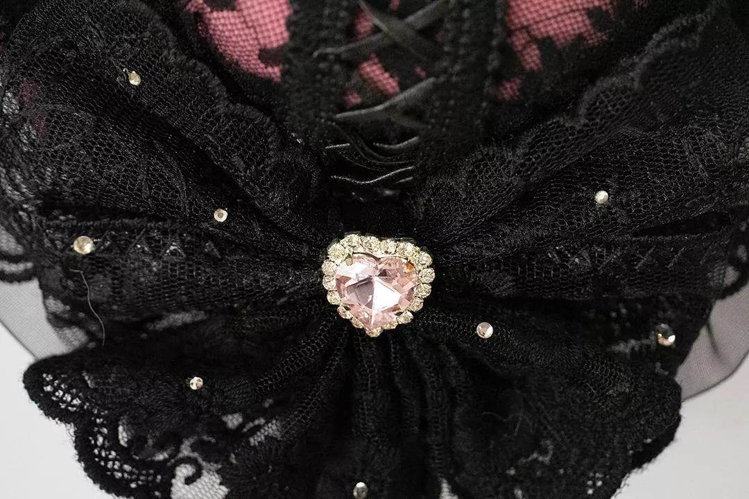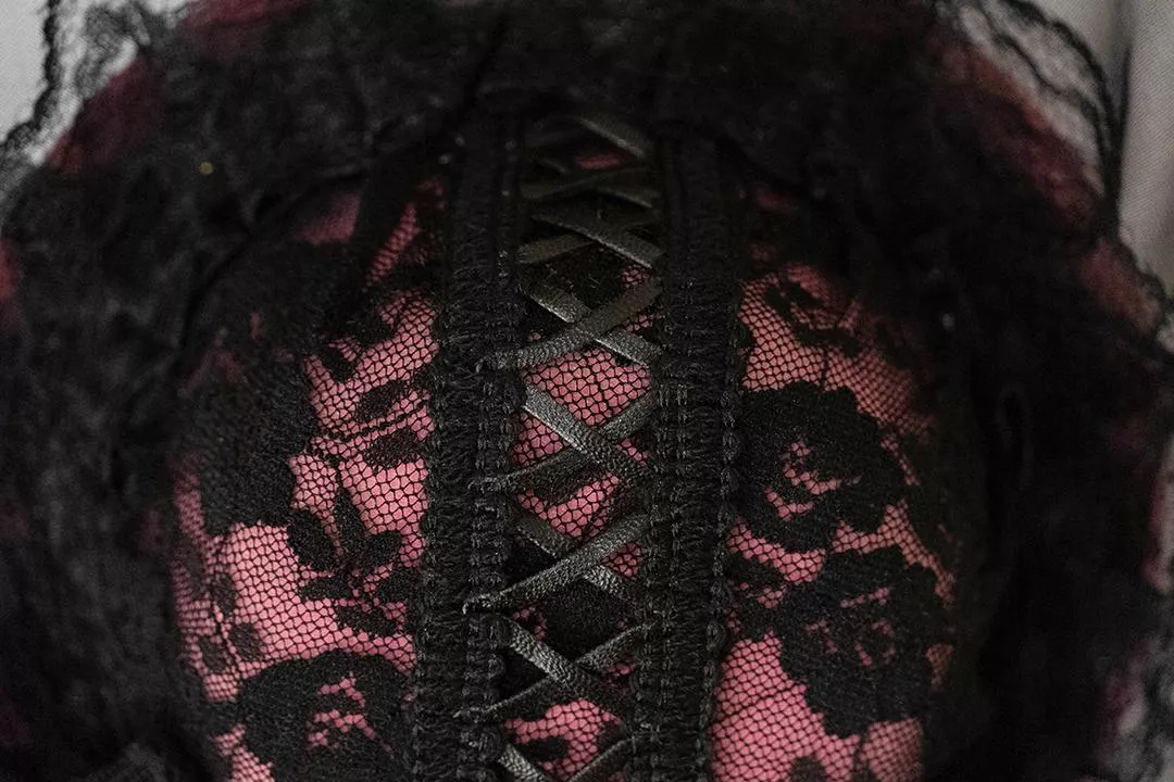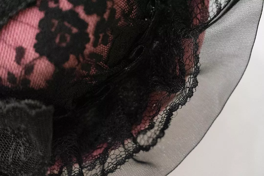 以深黑薄紗層層堆疊,包覆內層粉色薔薇紋理布料,透出若隱若現的對比層次。黑與粉的交錯並非甜美取向,而是帶有成熟氣息的暗色浪漫,呈現低調卻難以忽視的存在感。