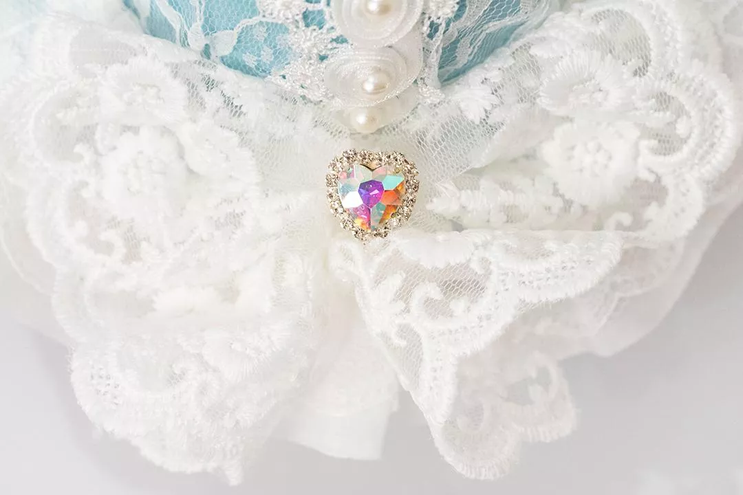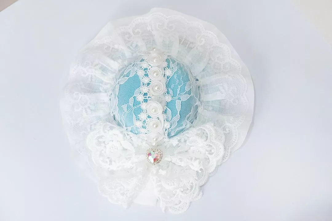 帽身中央以白色蕾絲花飾與珍珠排列作為縱向重心,細節層層堆疊,營造出優雅而不張揚的節奏。正面搭配白色蕾絲蝴蝶結與彩光心形寶石,在清淡基調中留下微微閃爍的光感,使作品更具精緻層次。