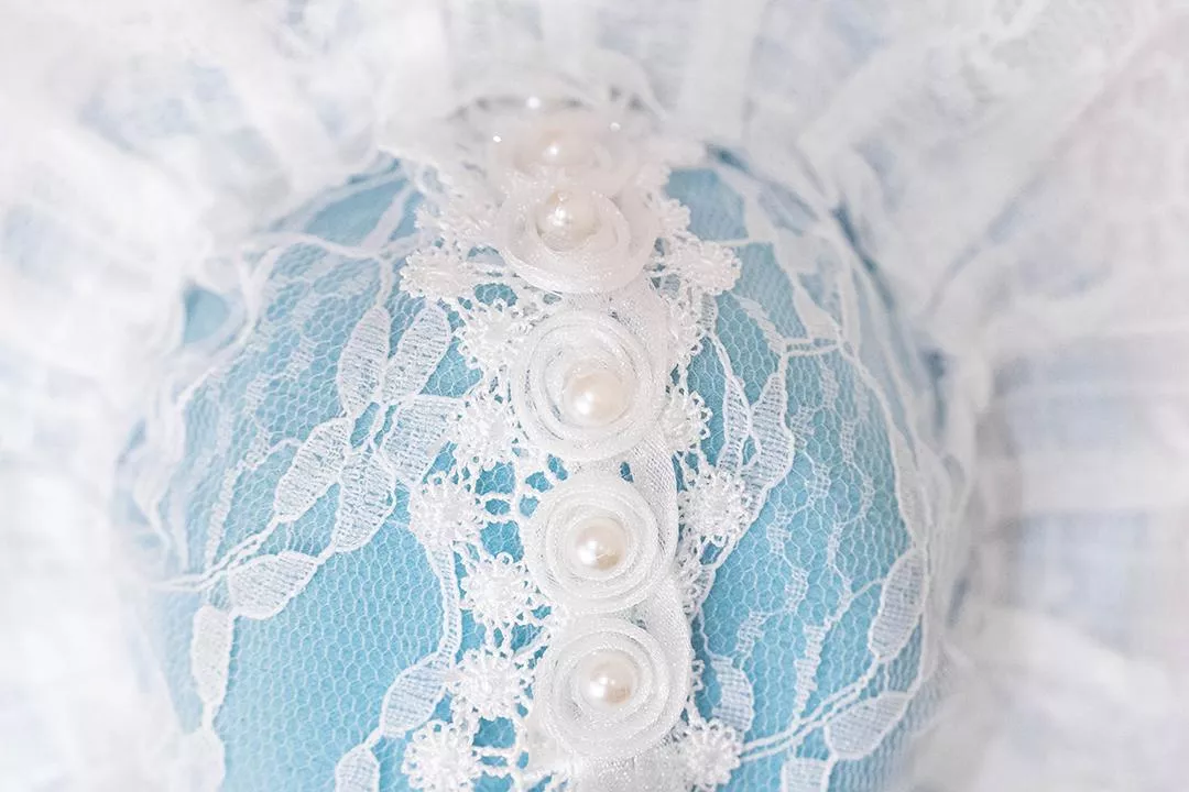 以霧藍色帽身作為主體,外層覆上白色蕾絲,色彩如晨光下的天空,柔和而安靜。蕾絲沿帽緣自然展開,形成輕盈的輪廓,讓整體視覺帶有空氣感與純淨氣息。