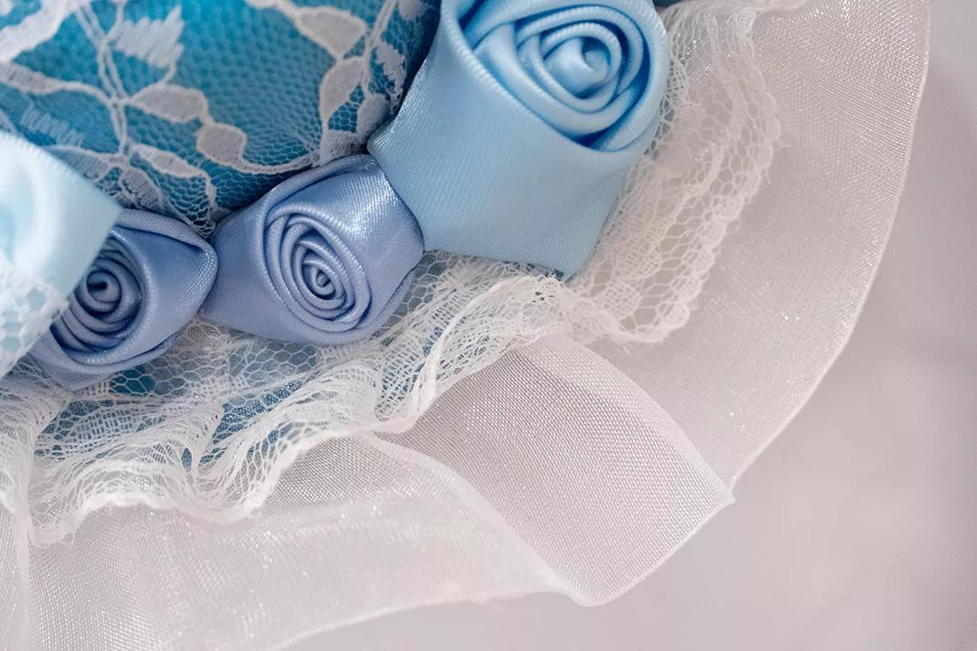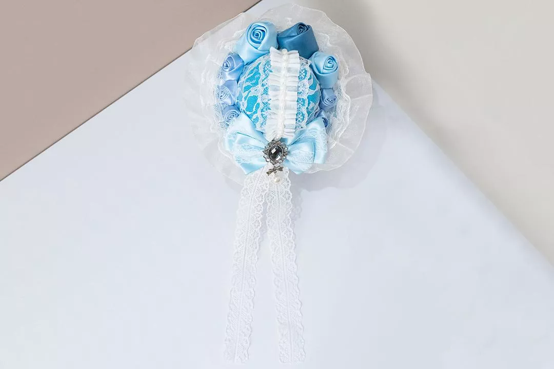 以澄澈的湖藍色為主調,帽身覆上細緻白色蕾絲,色彩如晨霧中映照的天空,柔和而清亮。外圈以藍色緞面玫瑰圍繞,層層堆疊出花環般的立體輪廓,使整體在輕盈中保有豐富層次。