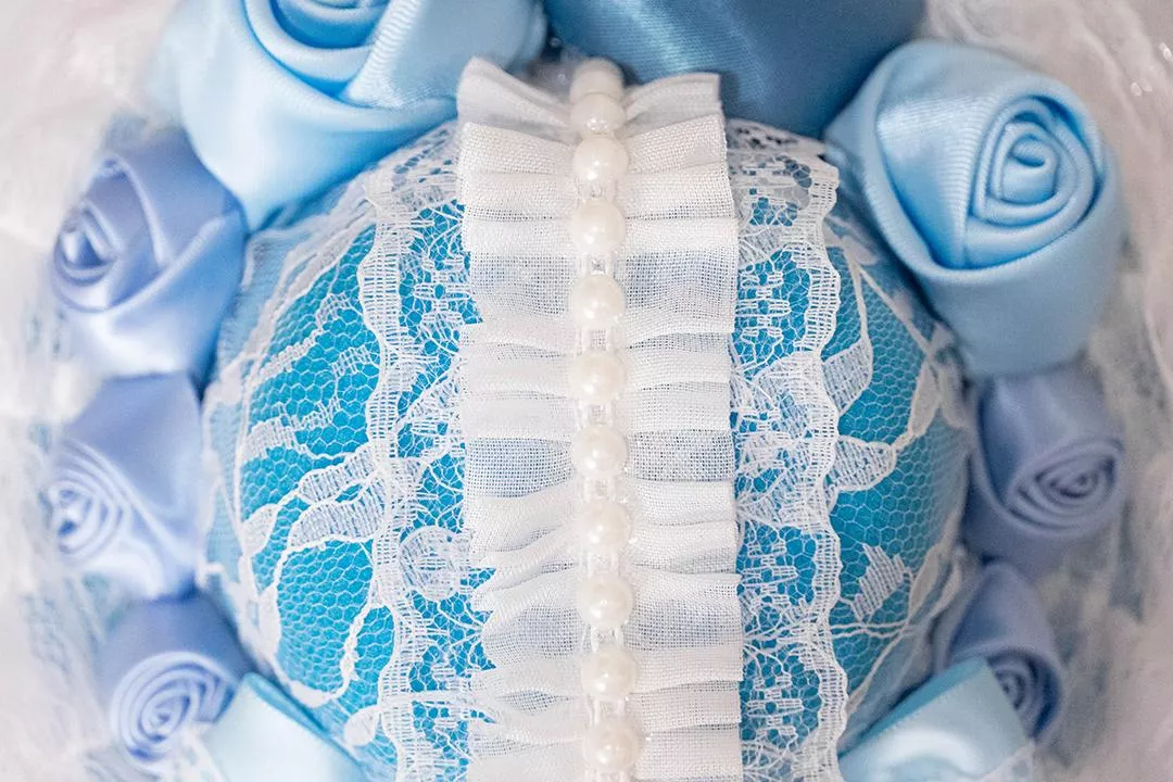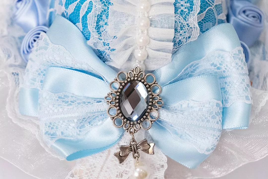 正中央以白色抓褶與珍珠縱向排列,搭配藍色蝴蝶結與復古銀框寶石,彷彿一首被珍藏的晨間詩句,在光線下靜靜閃爍。垂落的蕾絲與珍珠裝飾延伸視覺比例,增添優雅與儀式感。