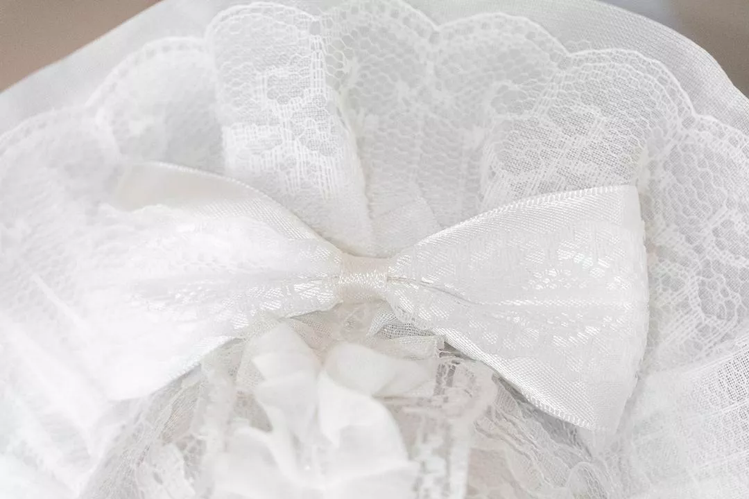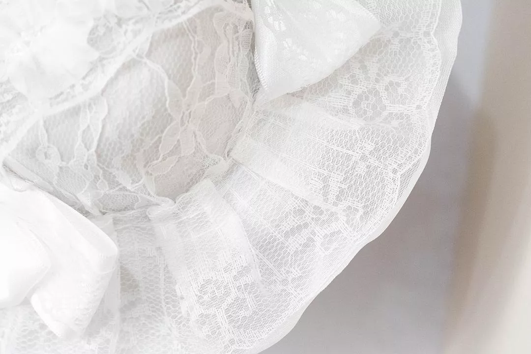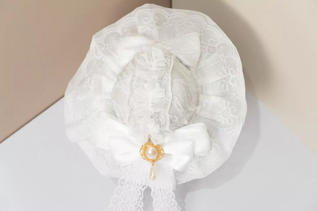 以純白為唯一主調,帽身覆以細緻蕾絲,層層疊合出柔軟而安靜的輪廓。整體沒有加入對比色,讓白在光線下呈現出不同深淺與質感,視覺上乾淨、克制,卻不單薄。
