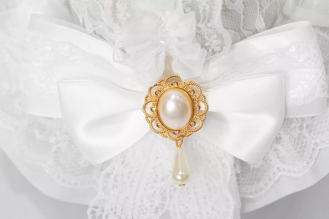 正面以白色緞帶蝴蝶結作為視覺核心,中央搭配金框珍珠垂飾,線條簡潔而優雅,在極簡之中保留一點儀式感。整體氛圍偏向純白系、婚禮或聖潔主題,也適合搭配同色系蘿莉塔造型,讓整體穿搭顯得柔和而完整。