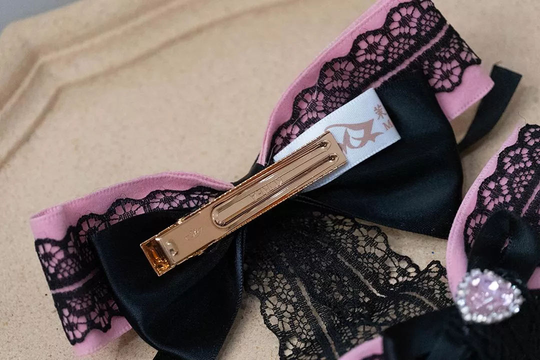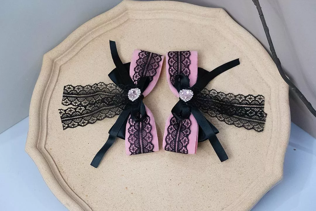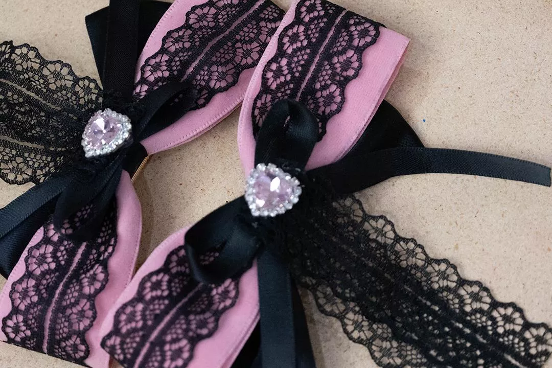 雙馬尾正位夾 愛心黑蕾(粉)|茉紡 手作飾品