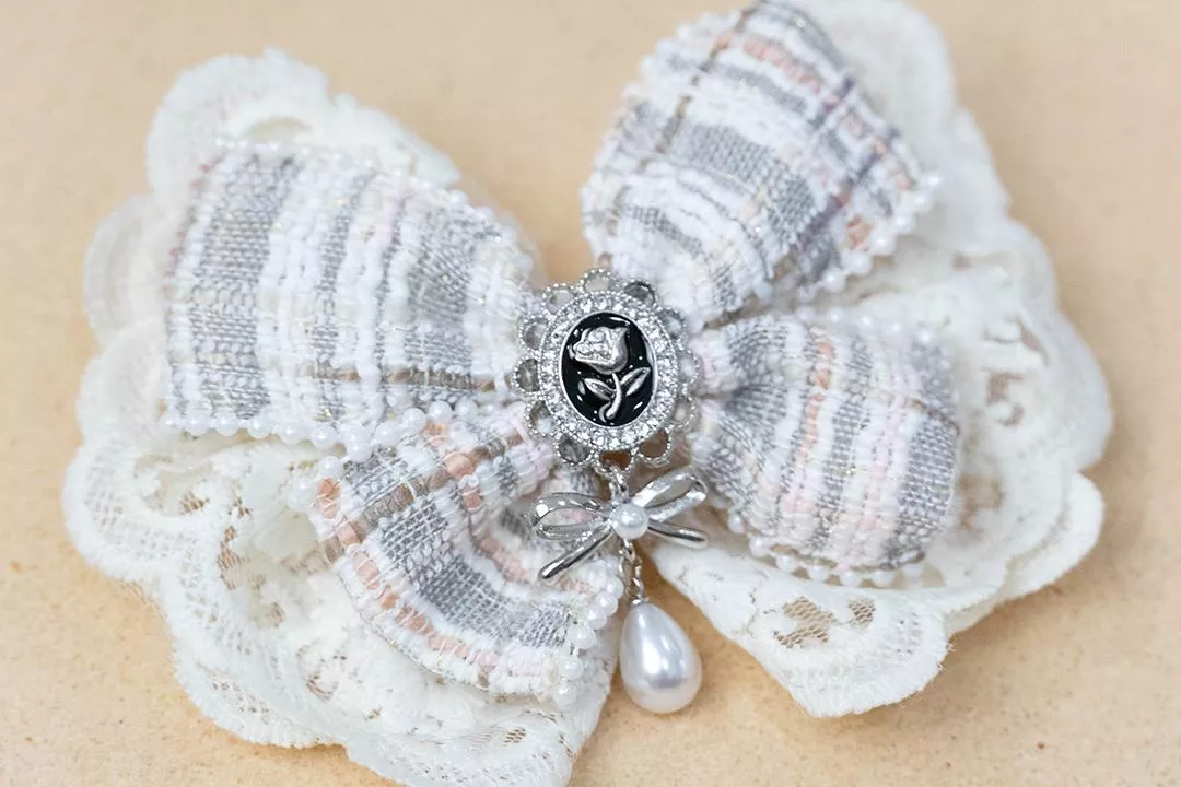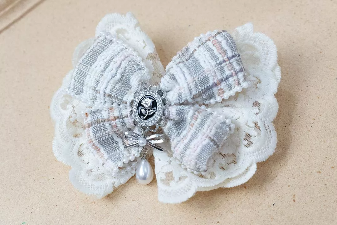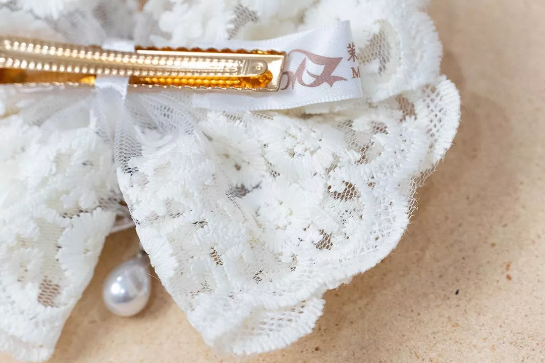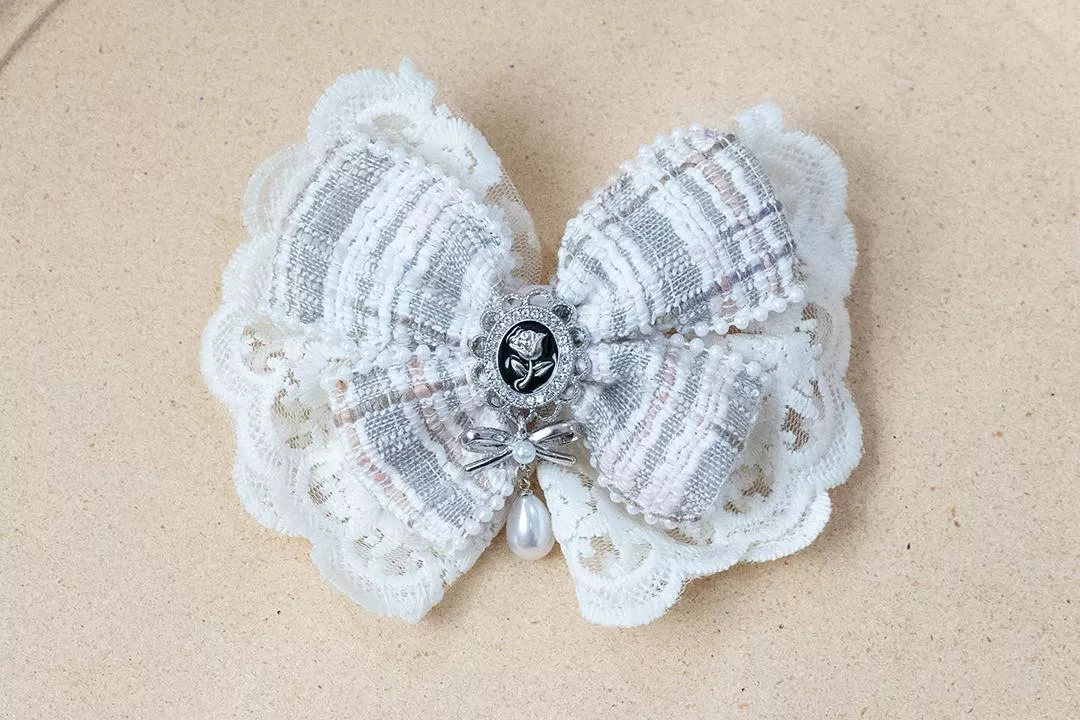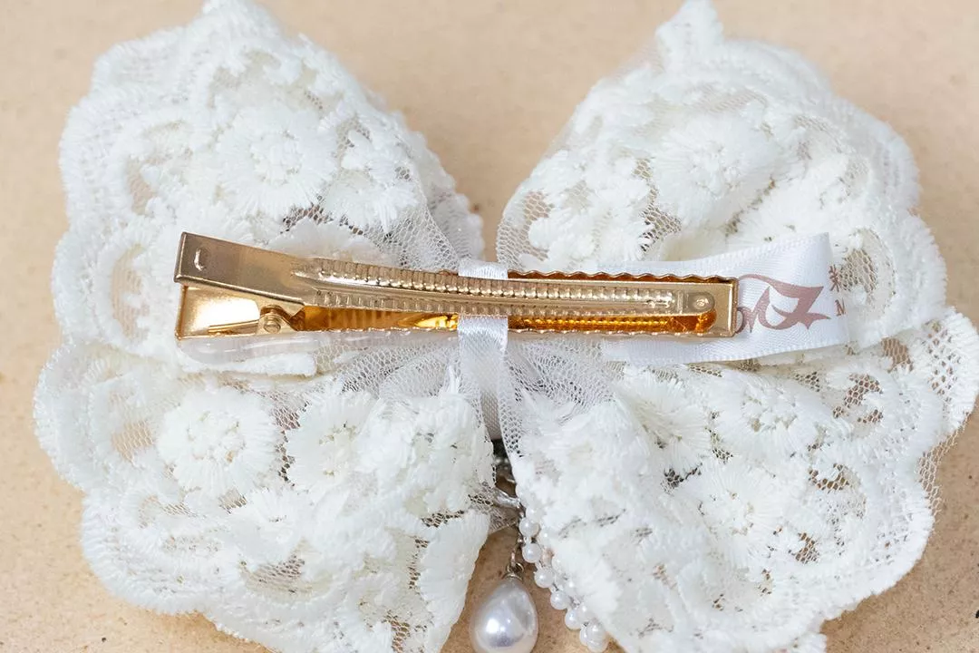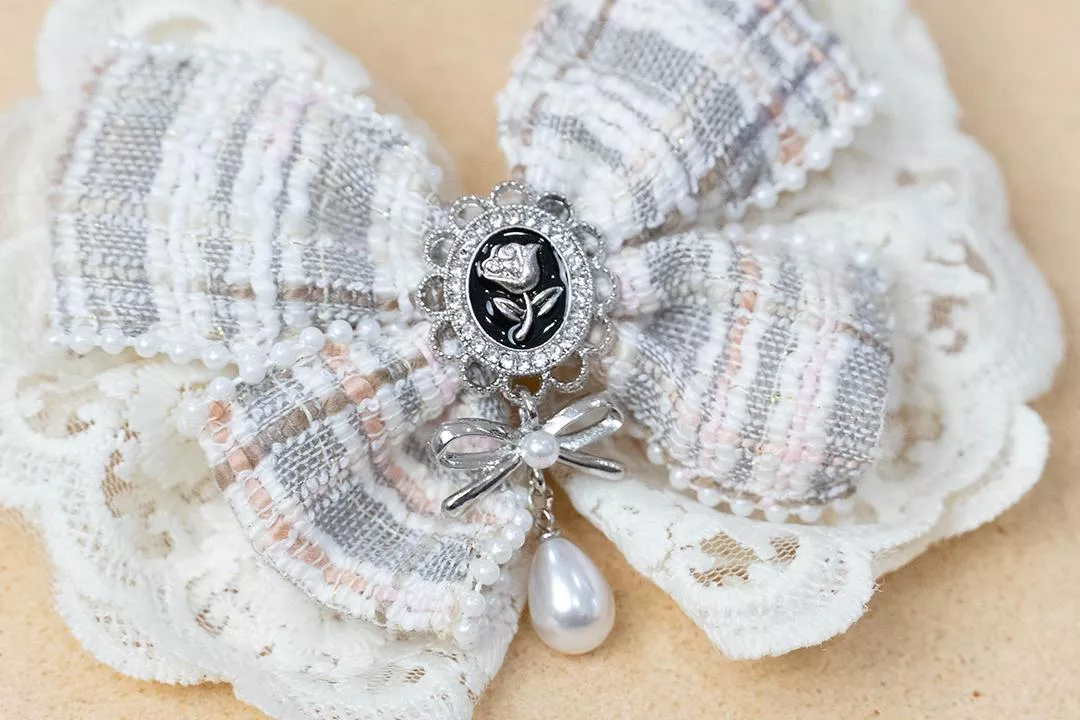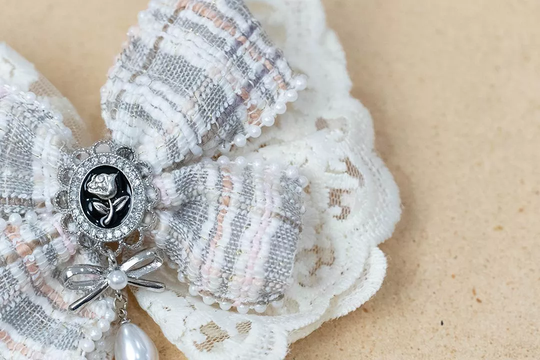 以柔白蕾絲為基底,搭配織紋布料蝴蝶結與銀色玫瑰飾章,垂墜珍珠細節如序曲般低聲展開。整體色調溫柔內斂,在細節中保留層次與光澤感。
