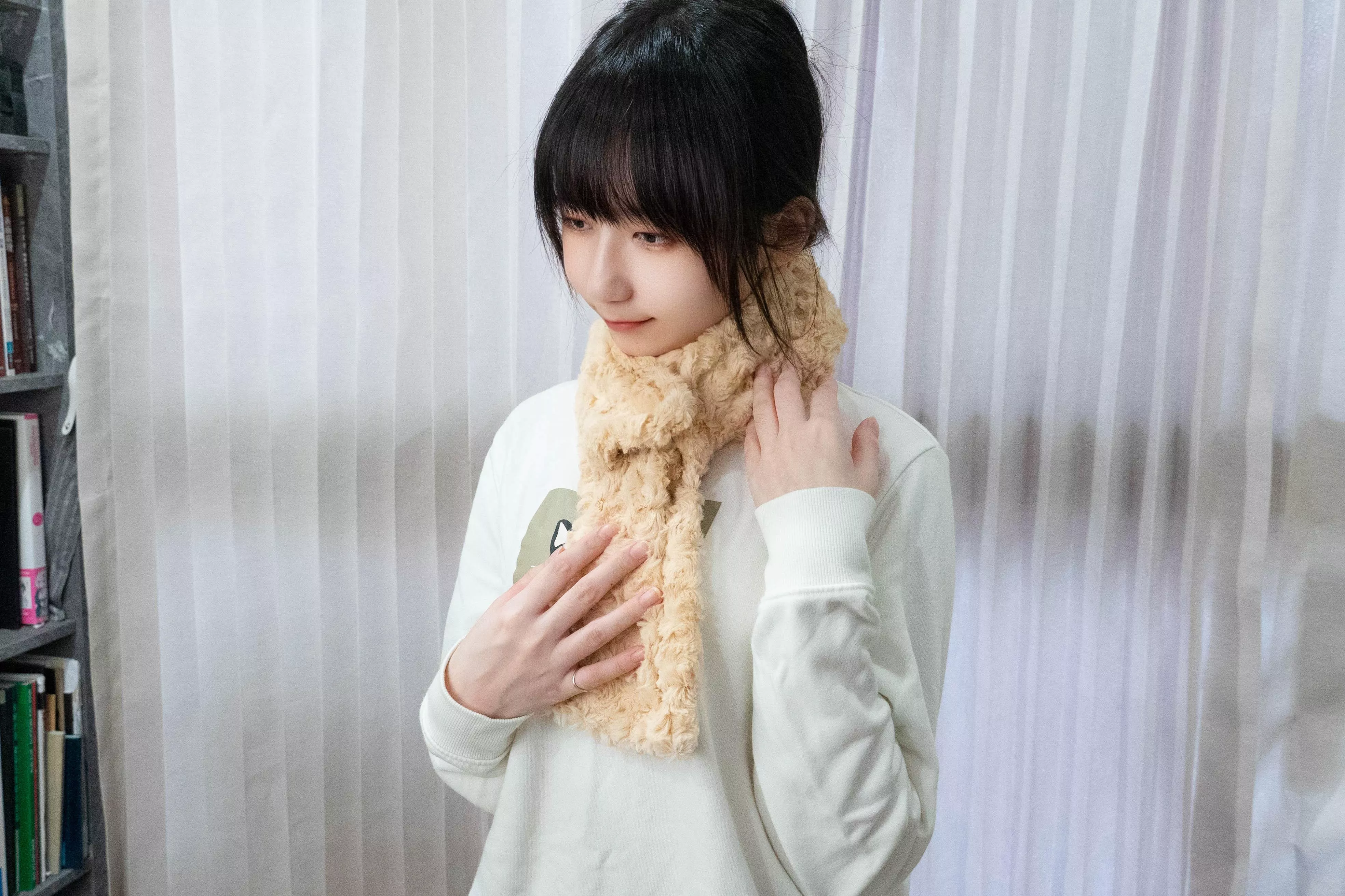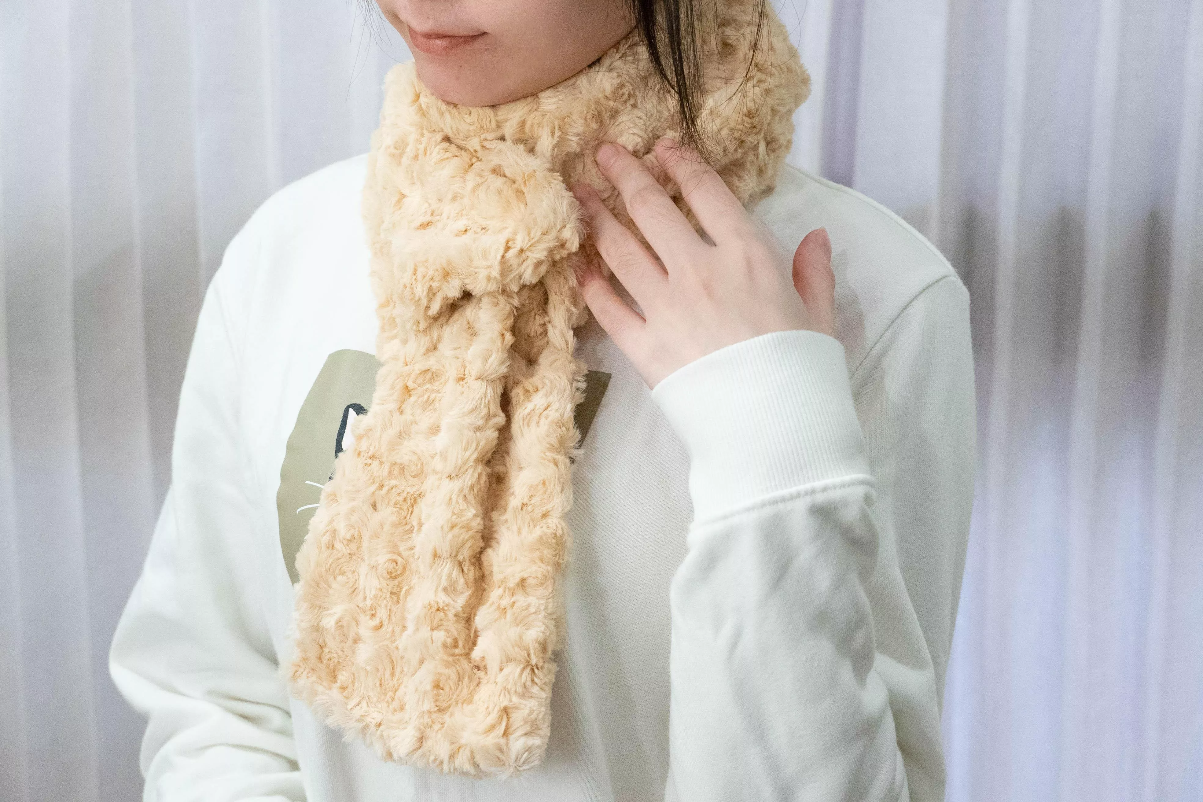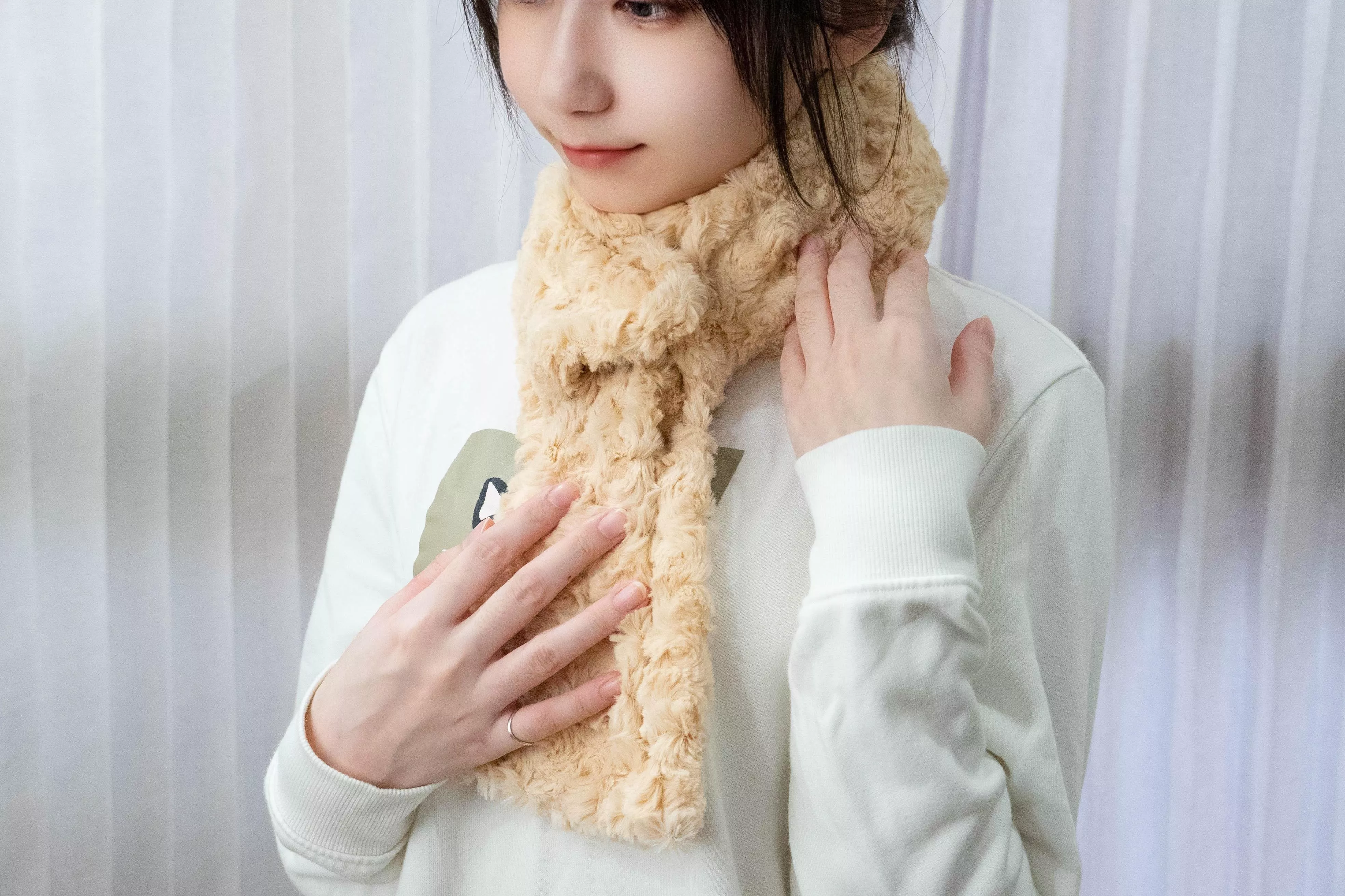 將圍巾繞脖子一圈後,將其中一端套入另一端即可完成固定,簡單好整理,日常使用方便。
