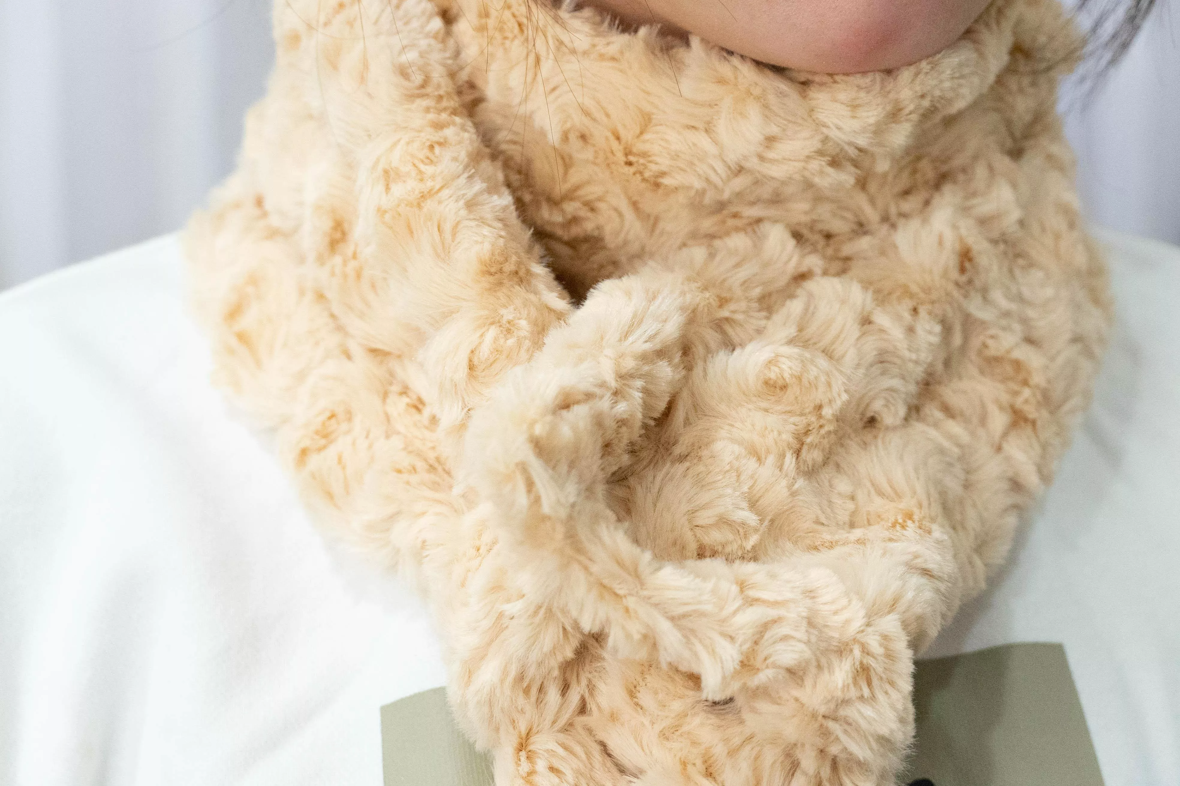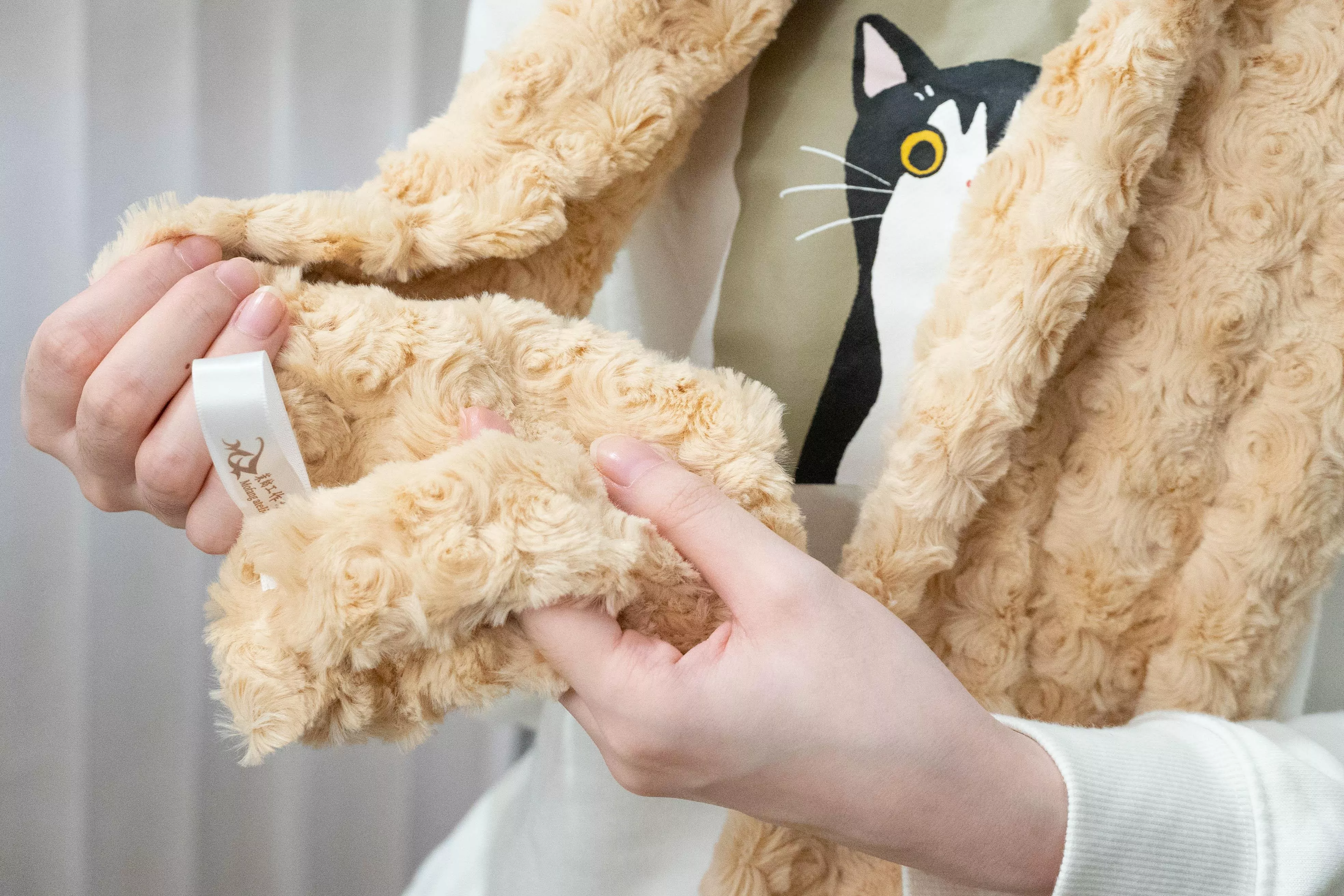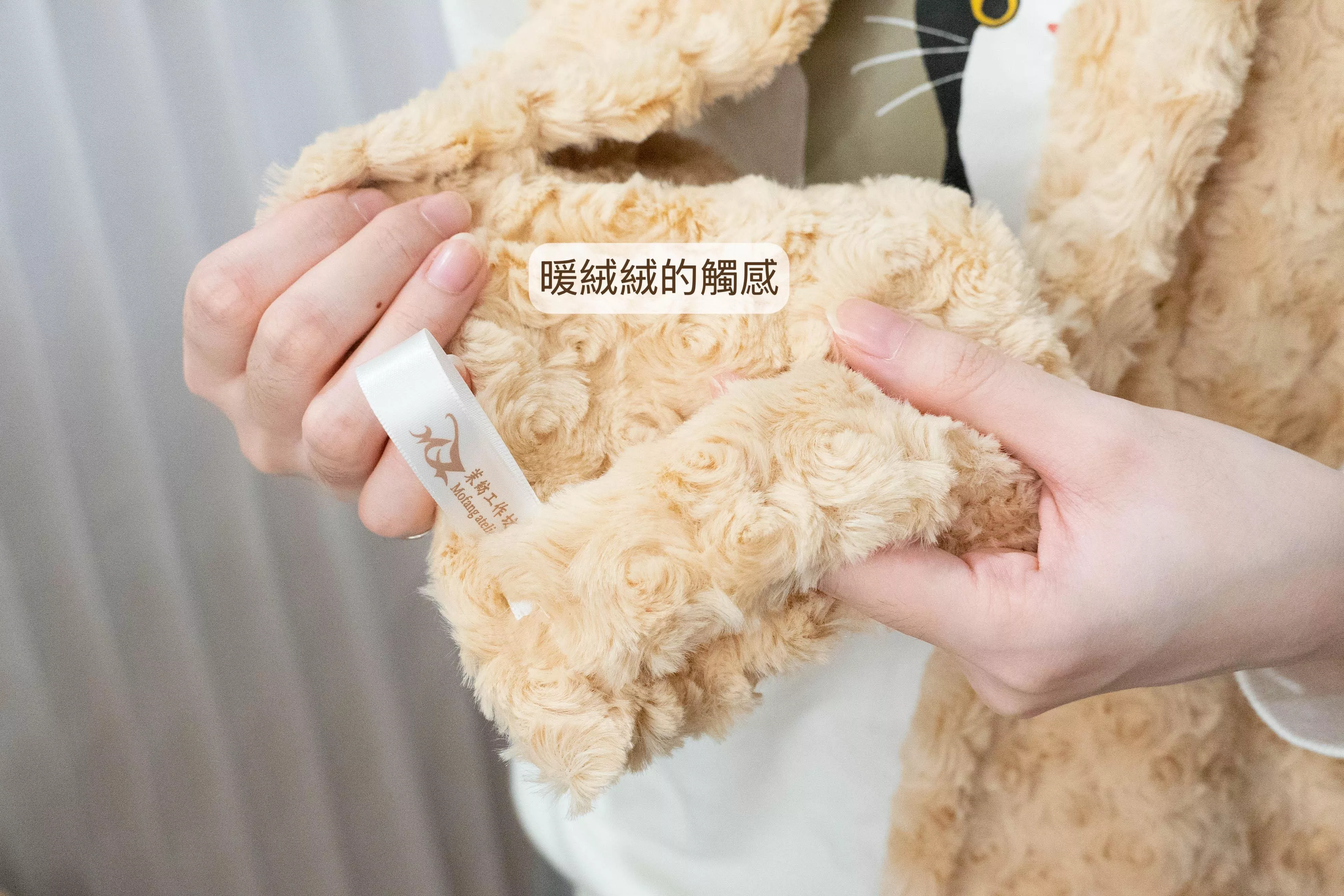 選用立體泰迪絨布料製作,觸感柔軟蓬鬆,貼近肌膚時帶來溫和且安心的包覆感。