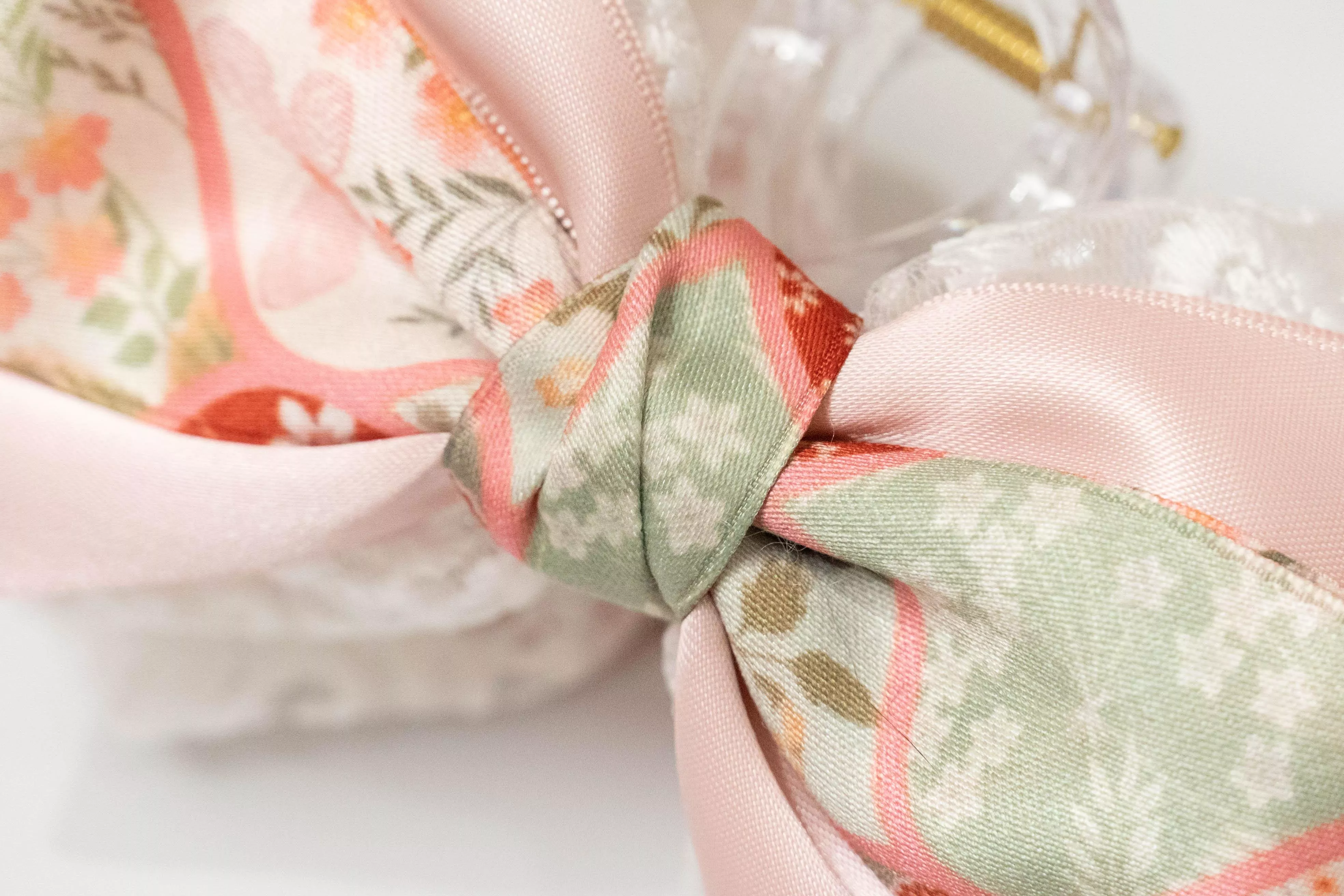 以柔霧粉色緞面搭配淡花紋布料,