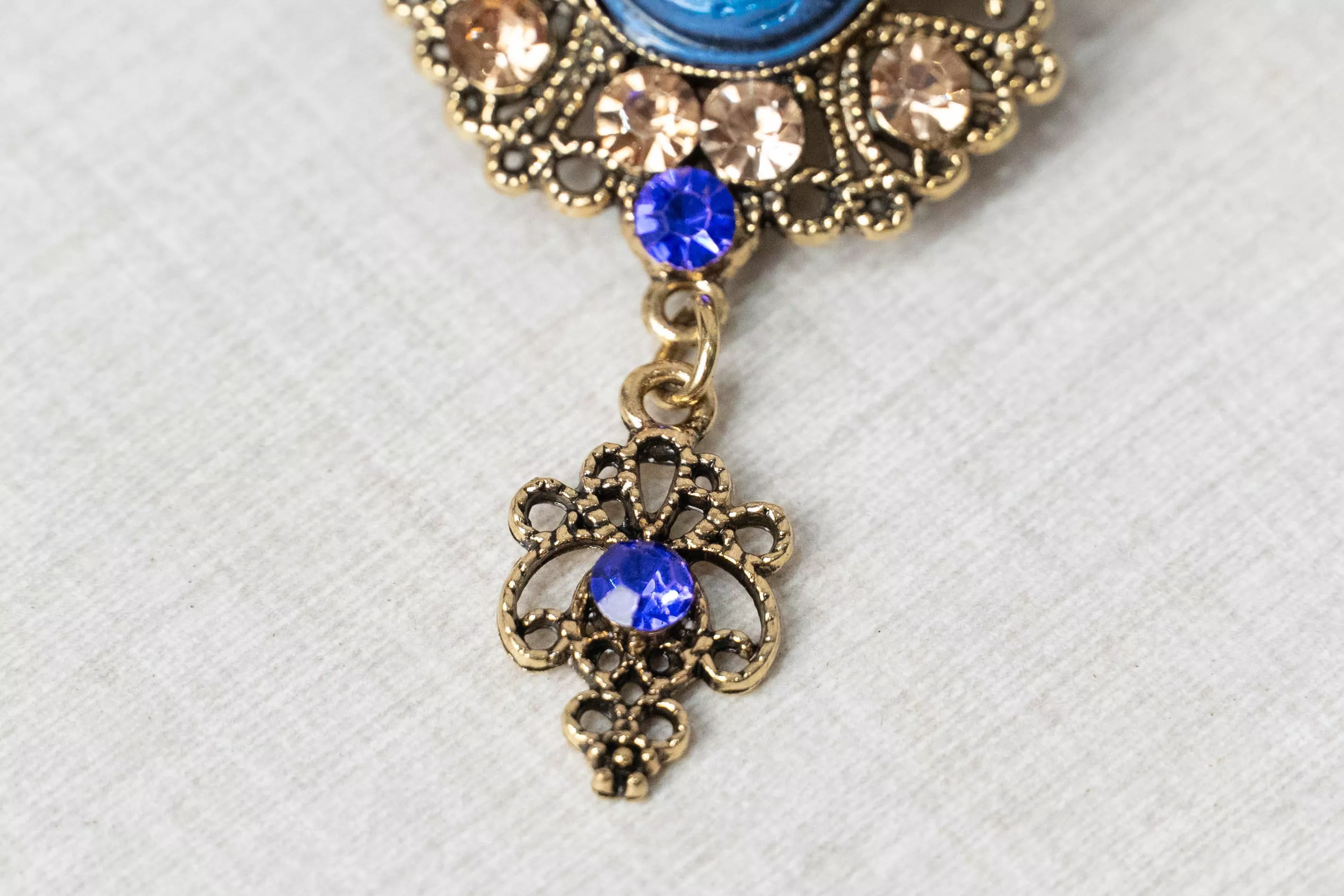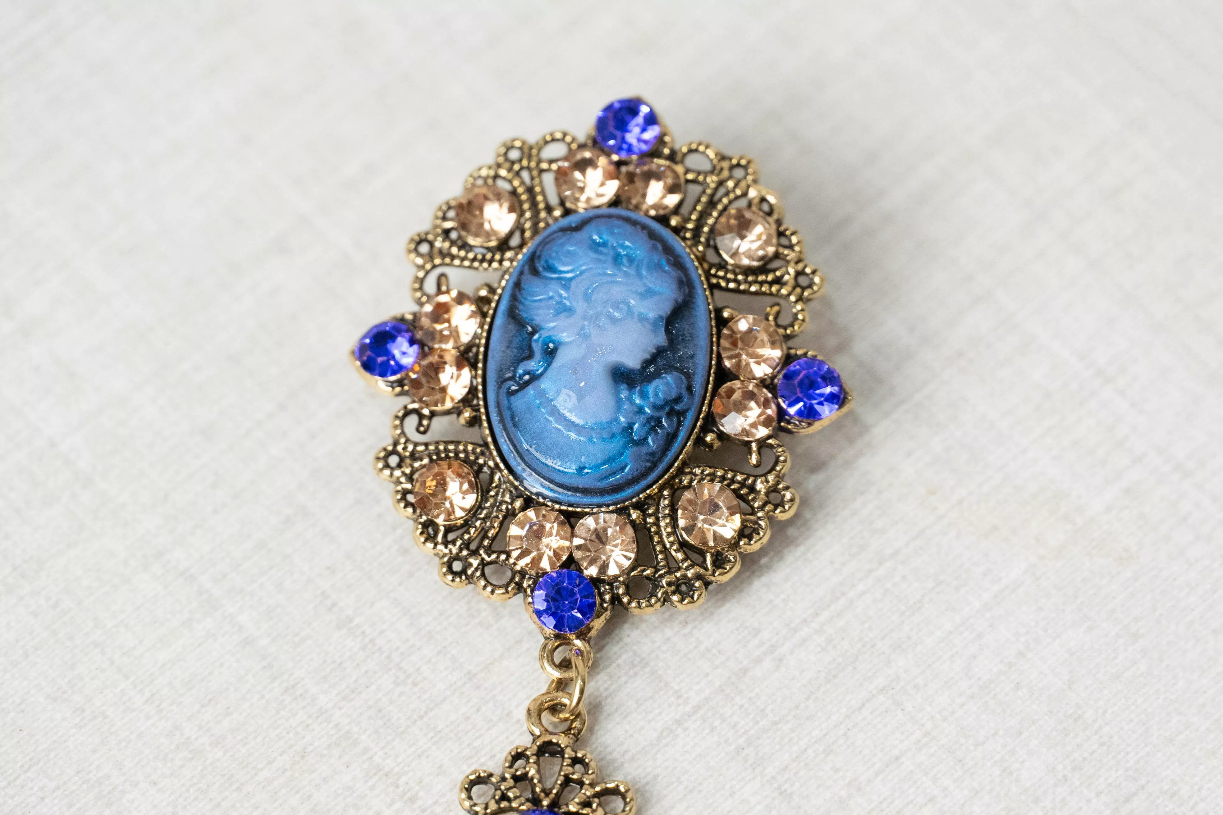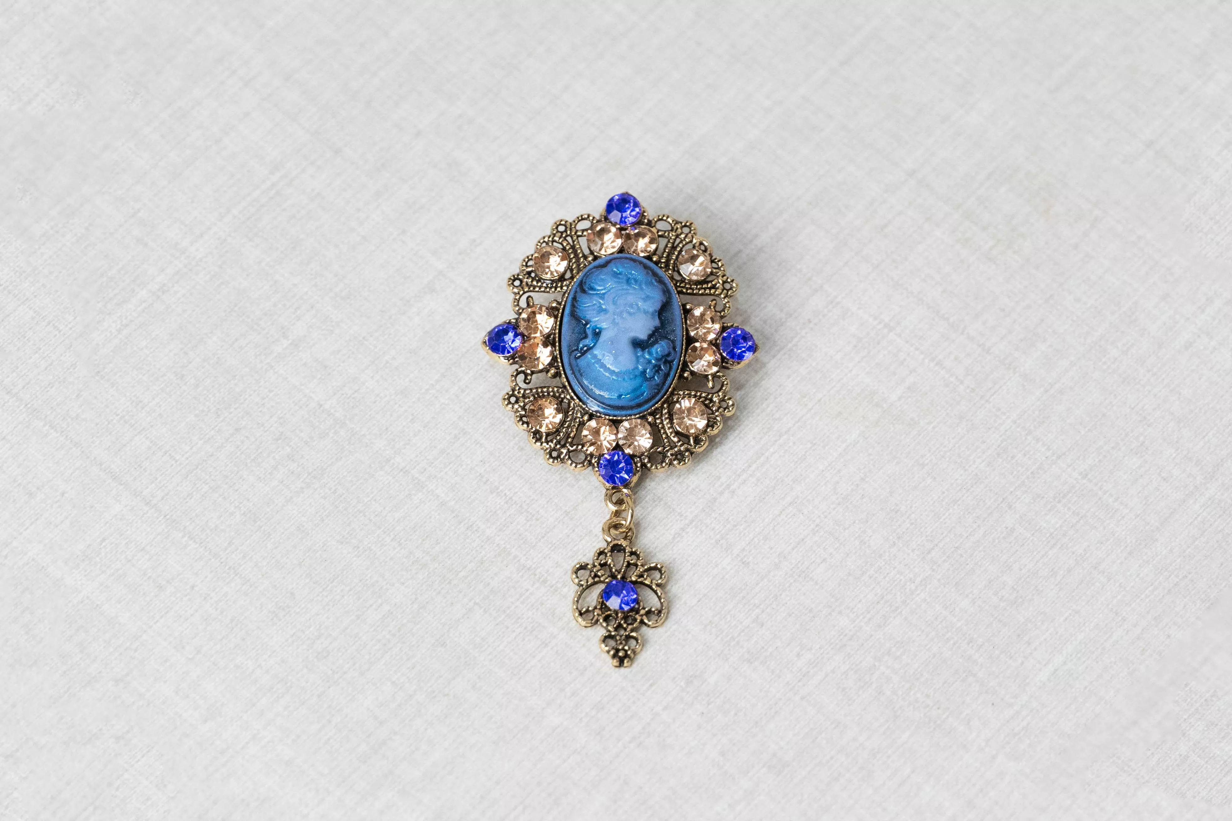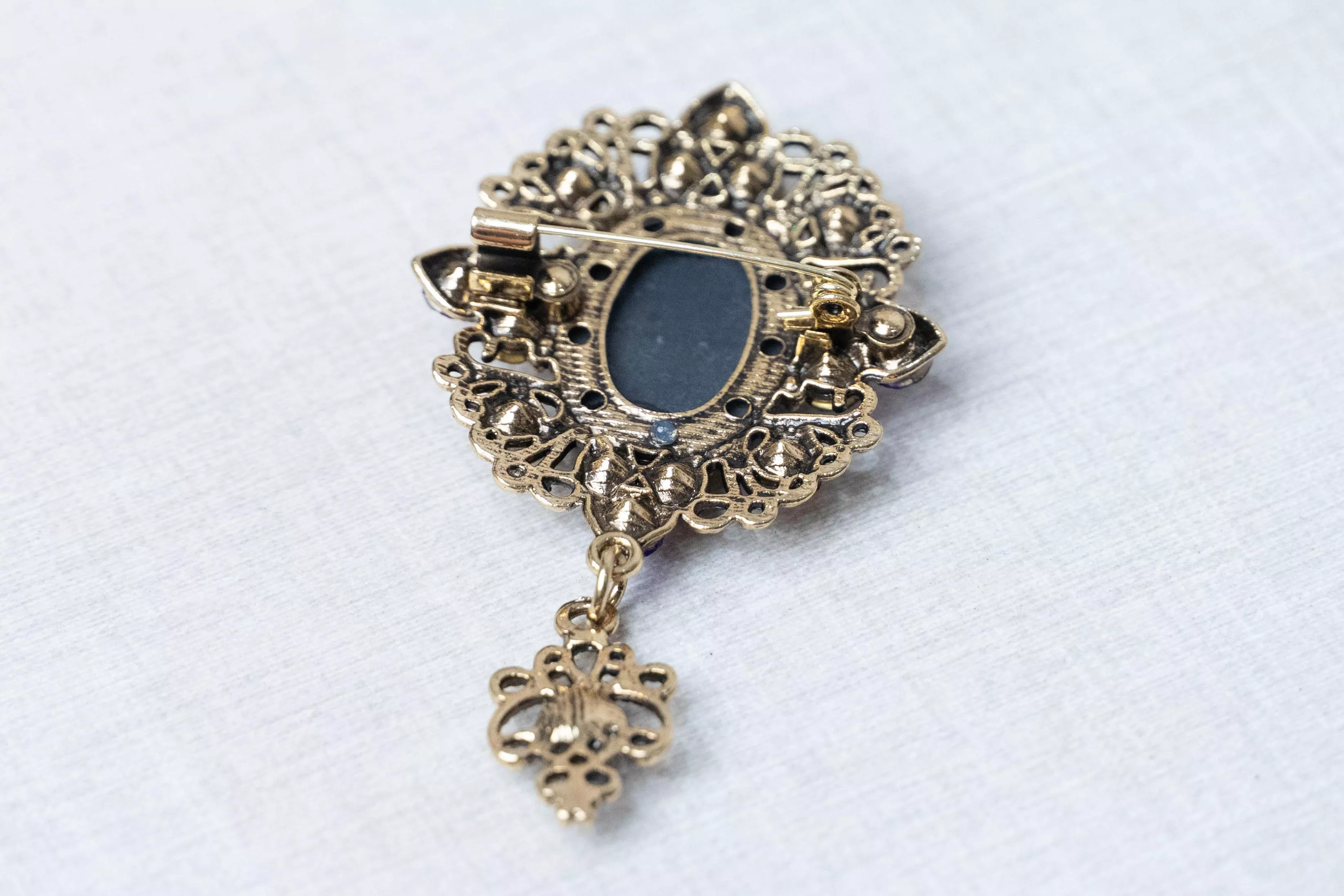 以復古肖像為核心結合鏤空金屬雕花與環繞水鑽形成穩定而精緻的視覺結構
