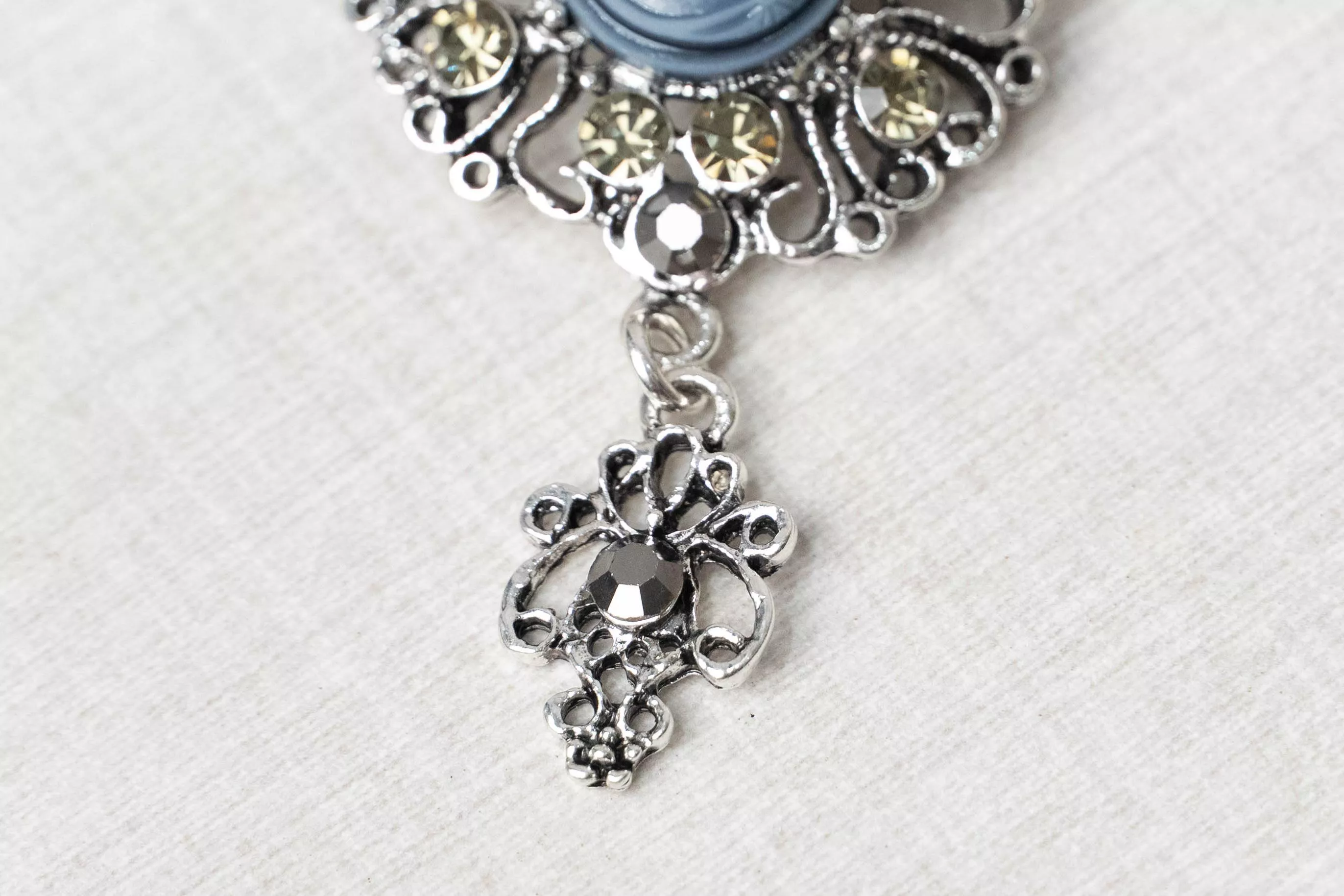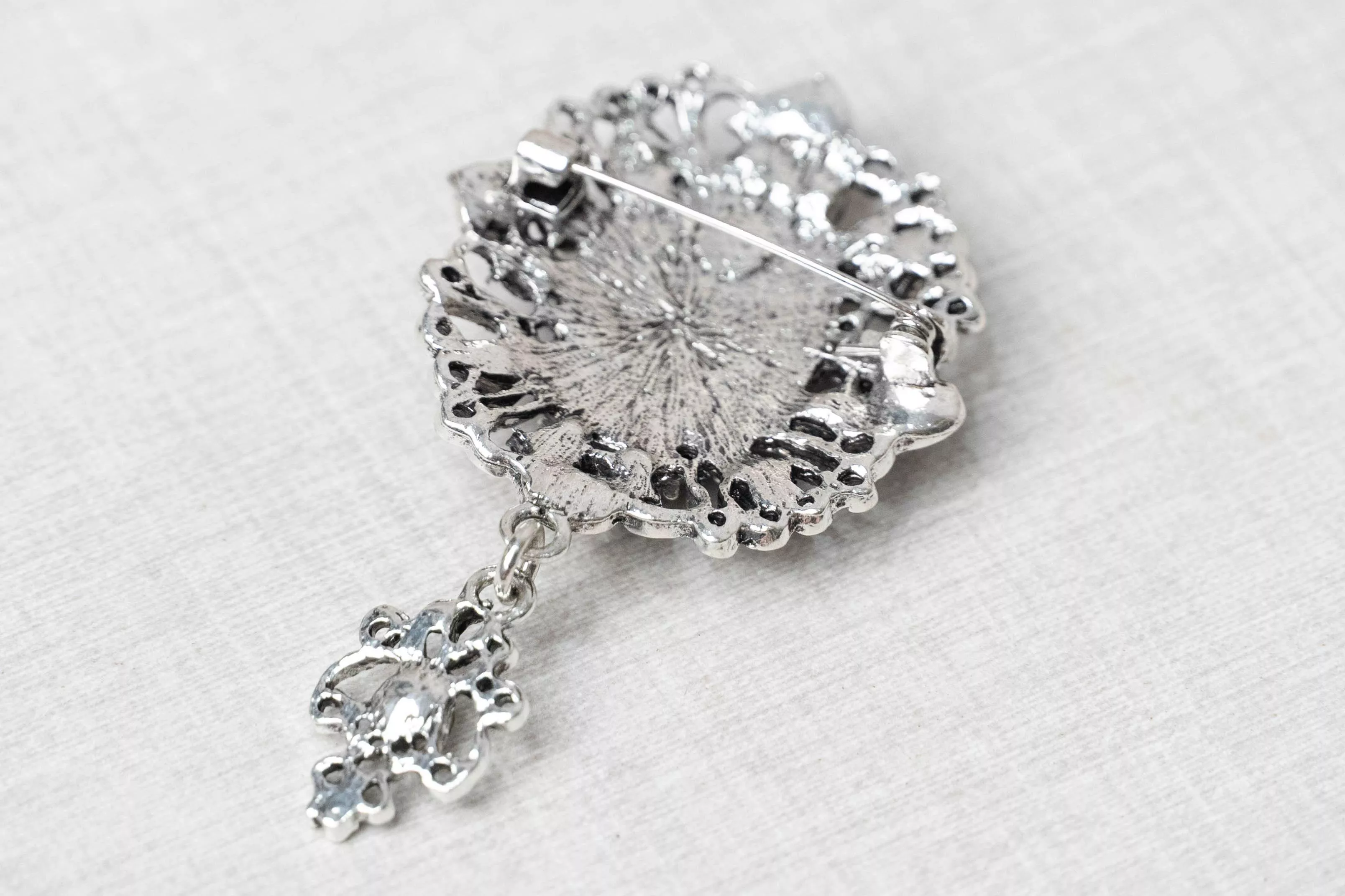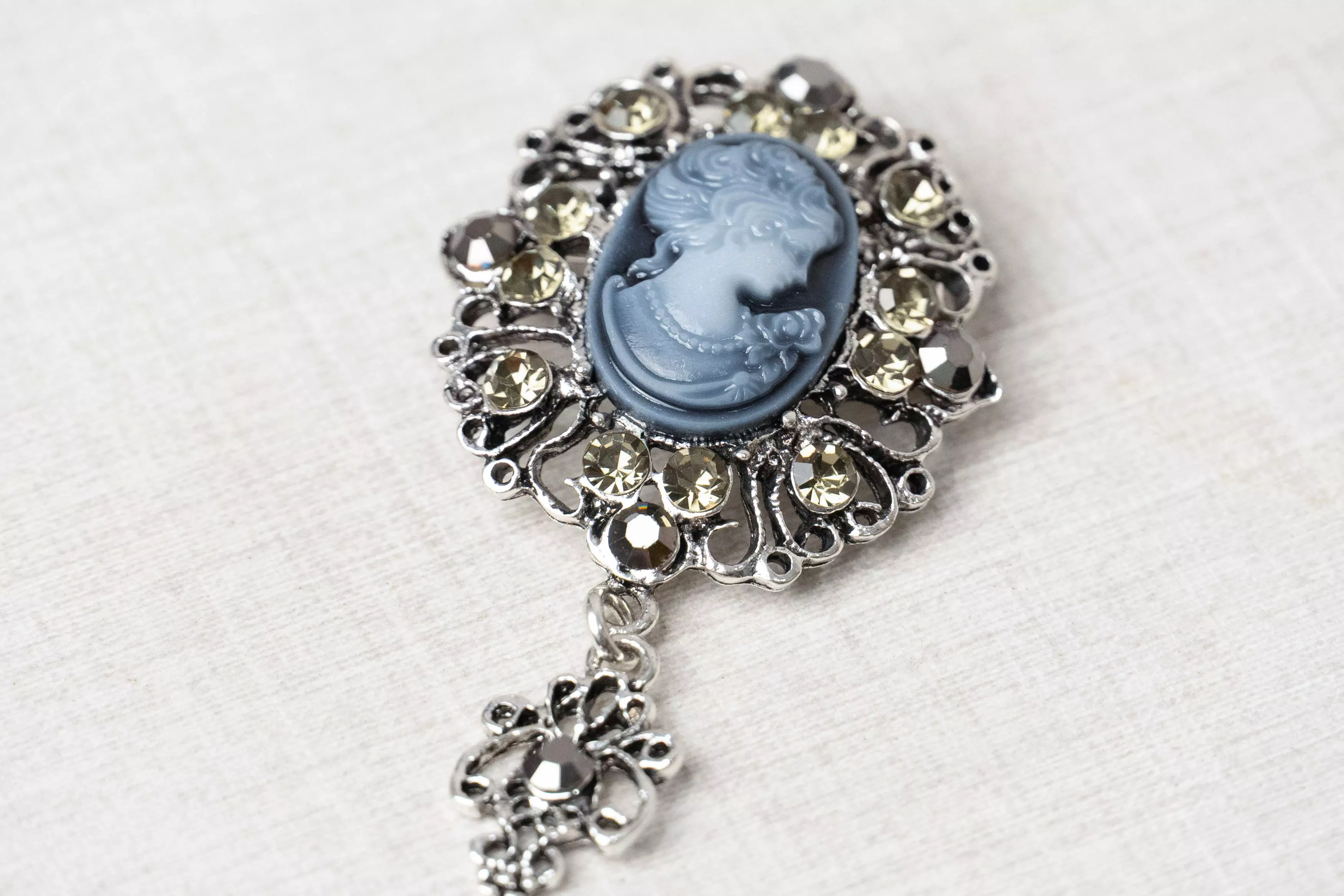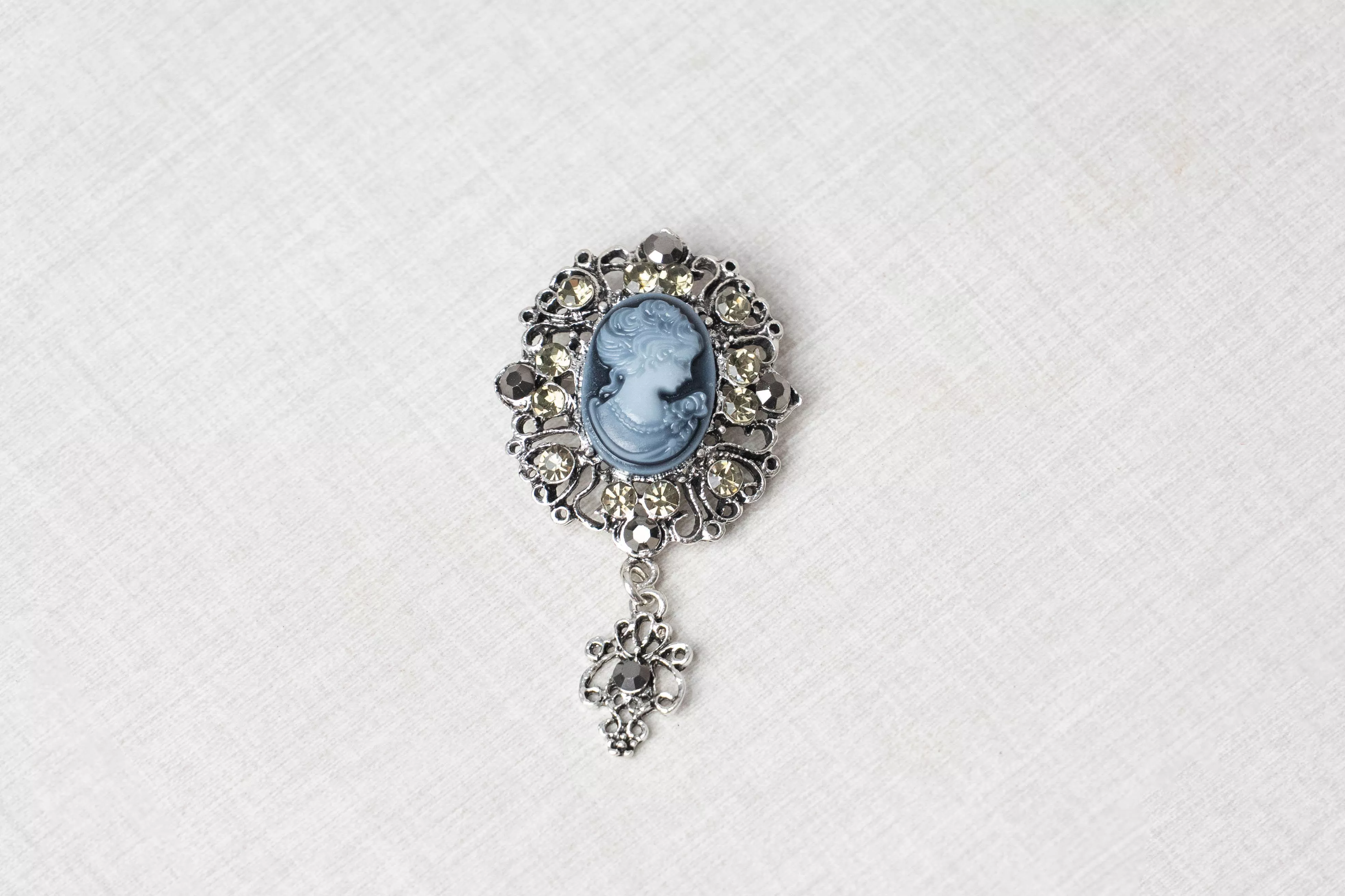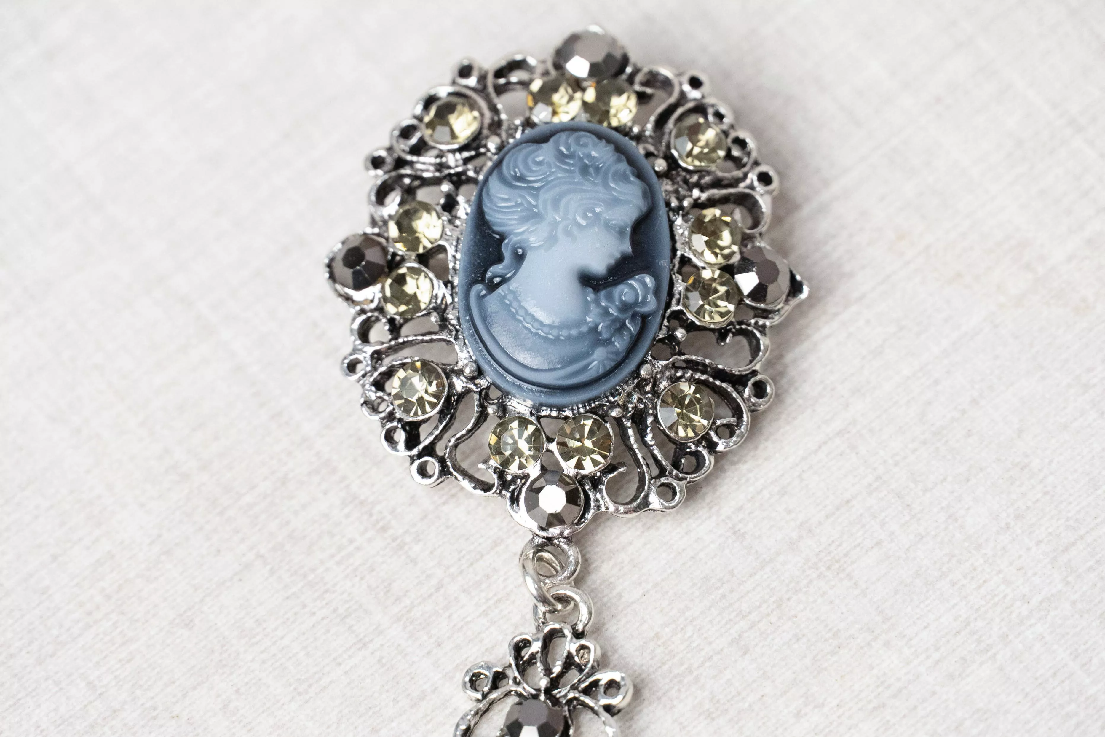 以復古肖像為核心結合鏤空金屬雕花與環繞水鑽形成穩定而精緻的視覺結構