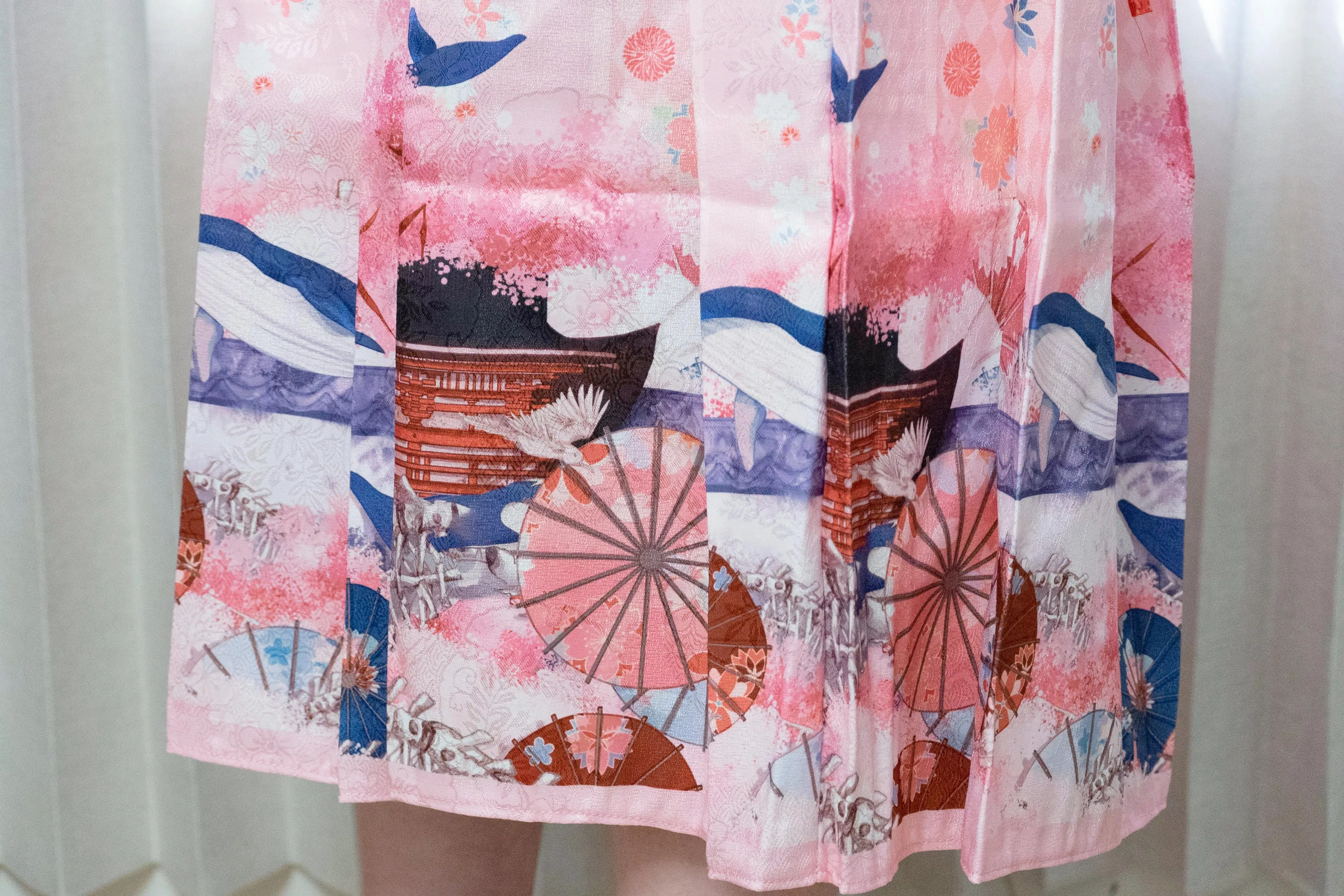 整件裙子以一片式結構呈現,穿著時可依個人腰圍調整包覆位置,相較固定腰圍裙款更具彈性,但同時也因結構特性,對腰圍仍有實際配戴範圍限制。裙長線條俐落,適合搭配各式 Lolita 上衣、襯衫或外搭單品,能呈現清楚的百褶層次與印花視覺。