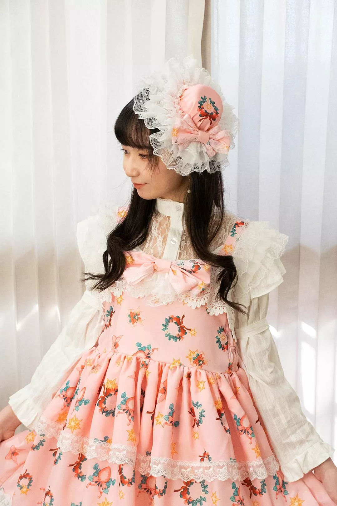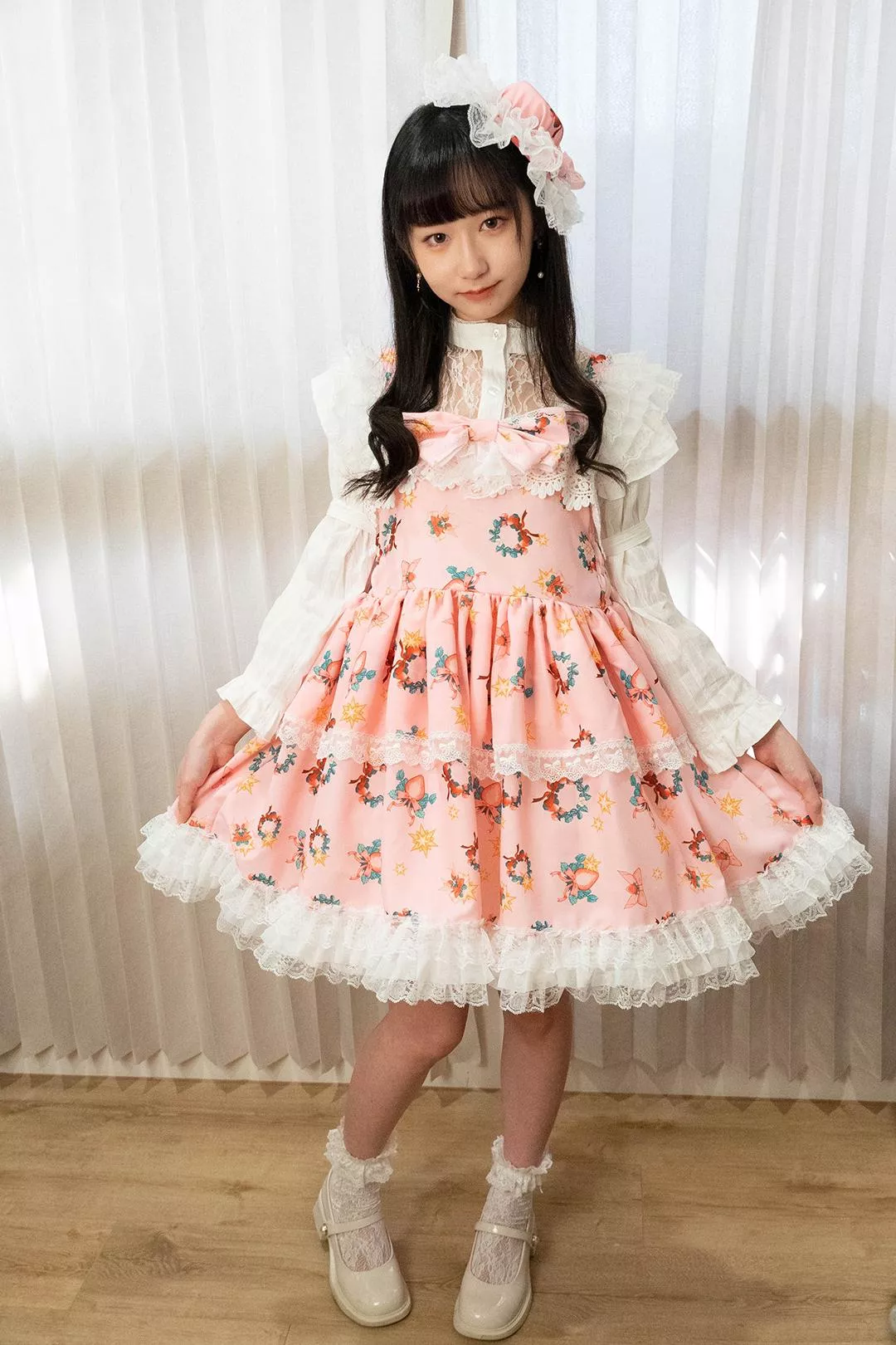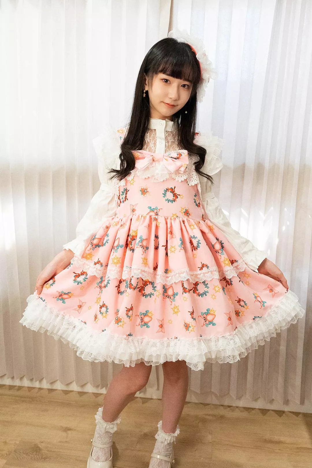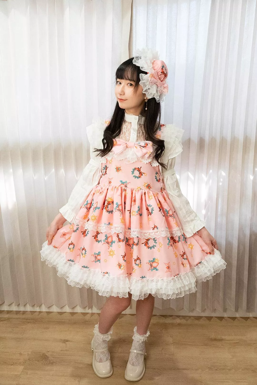 以闆闆珍藏並喜愛的粉色印花布料為主體,將柔和的粉紅色調與細緻圖樣轉化為帶有節慶氣息的「粉紅聖誕」氛圍。裙身以澎度與層次為重點設計,搭配蕾絲與裝飾細節,呈現溫柔中帶有份量感的經典蘿莉塔輪廓。