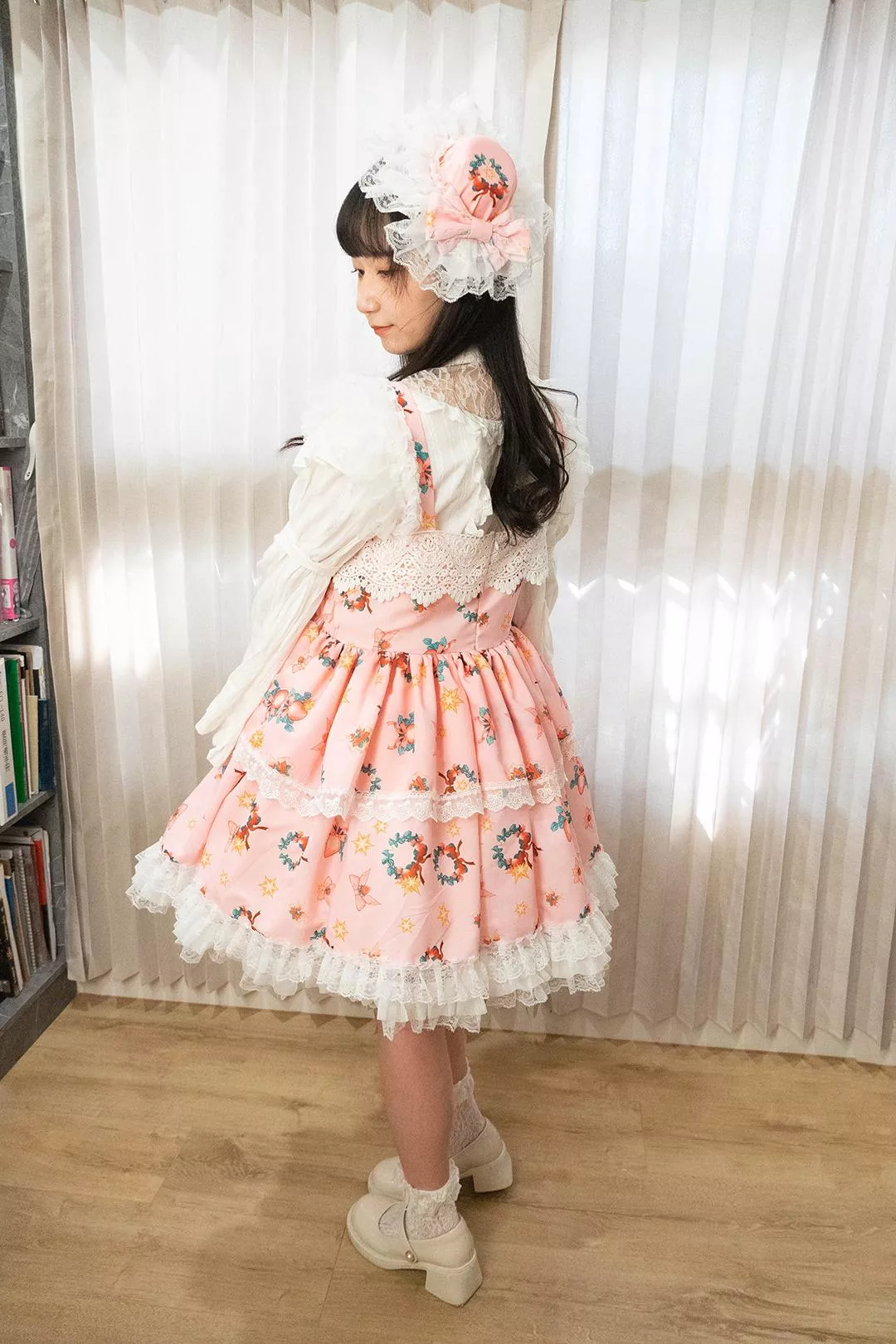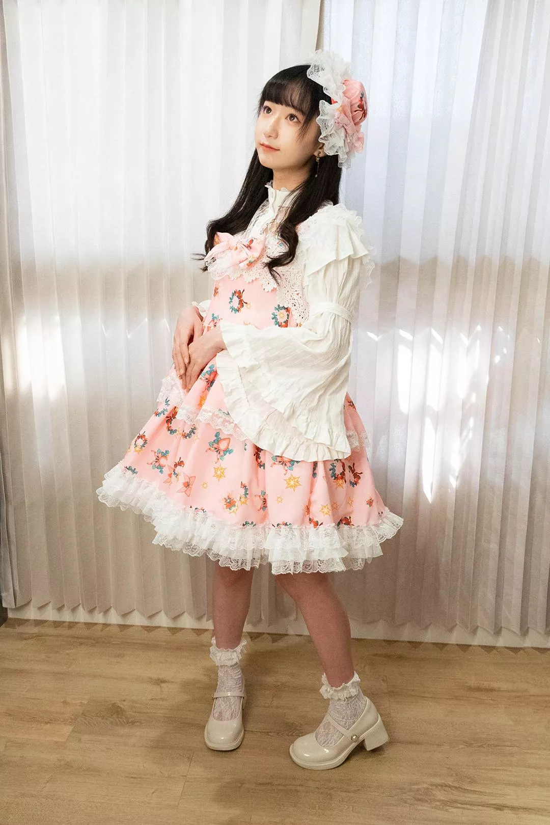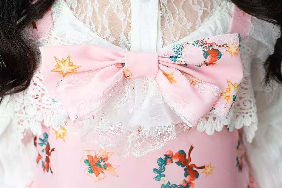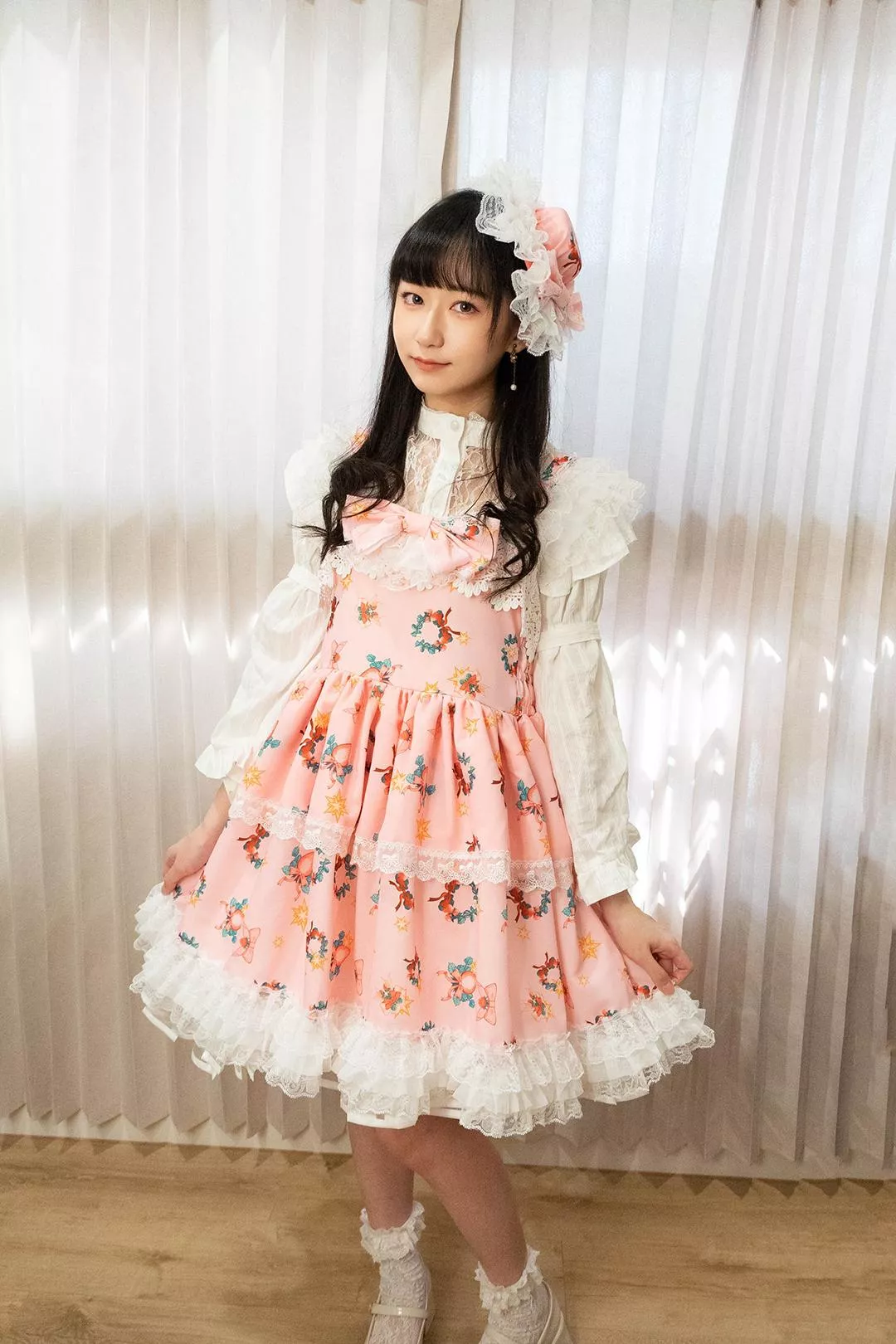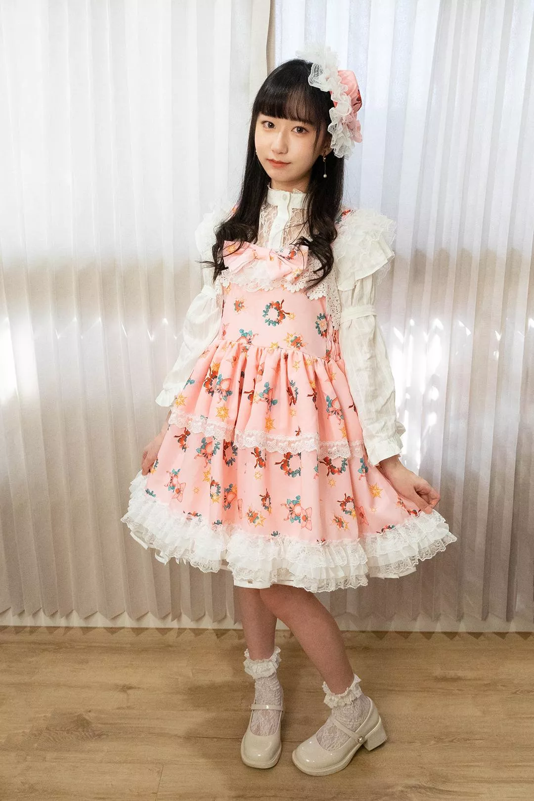 以闆闆珍藏並喜愛的粉色印花布料為主體,將柔和的粉紅色調與細緻圖樣轉化為帶有節慶氣息的「粉紅聖誕」氛圍。裙身以澎度與層次為重點設計,搭配蕾絲與裝飾細節,呈現溫柔中帶有份量感的經典蘿莉塔輪廓。