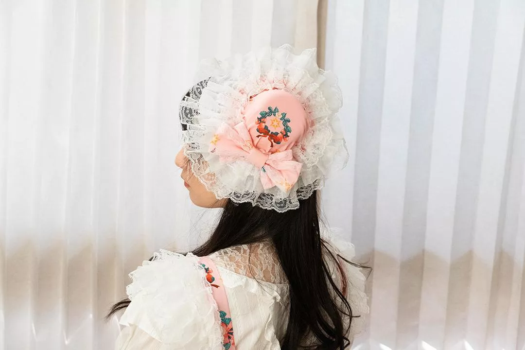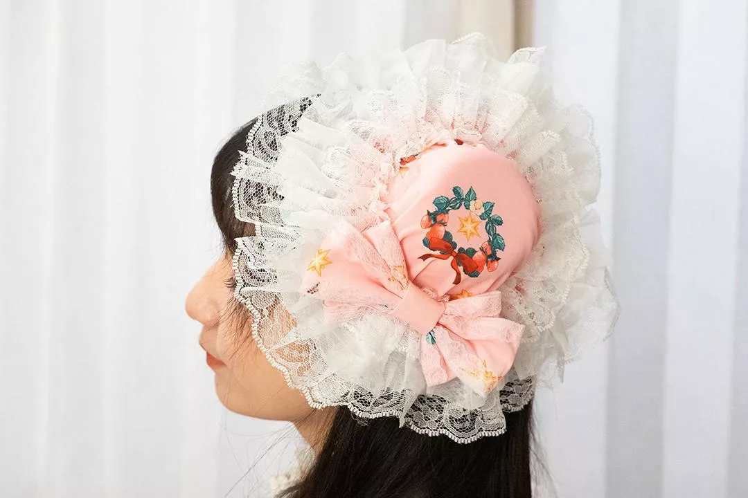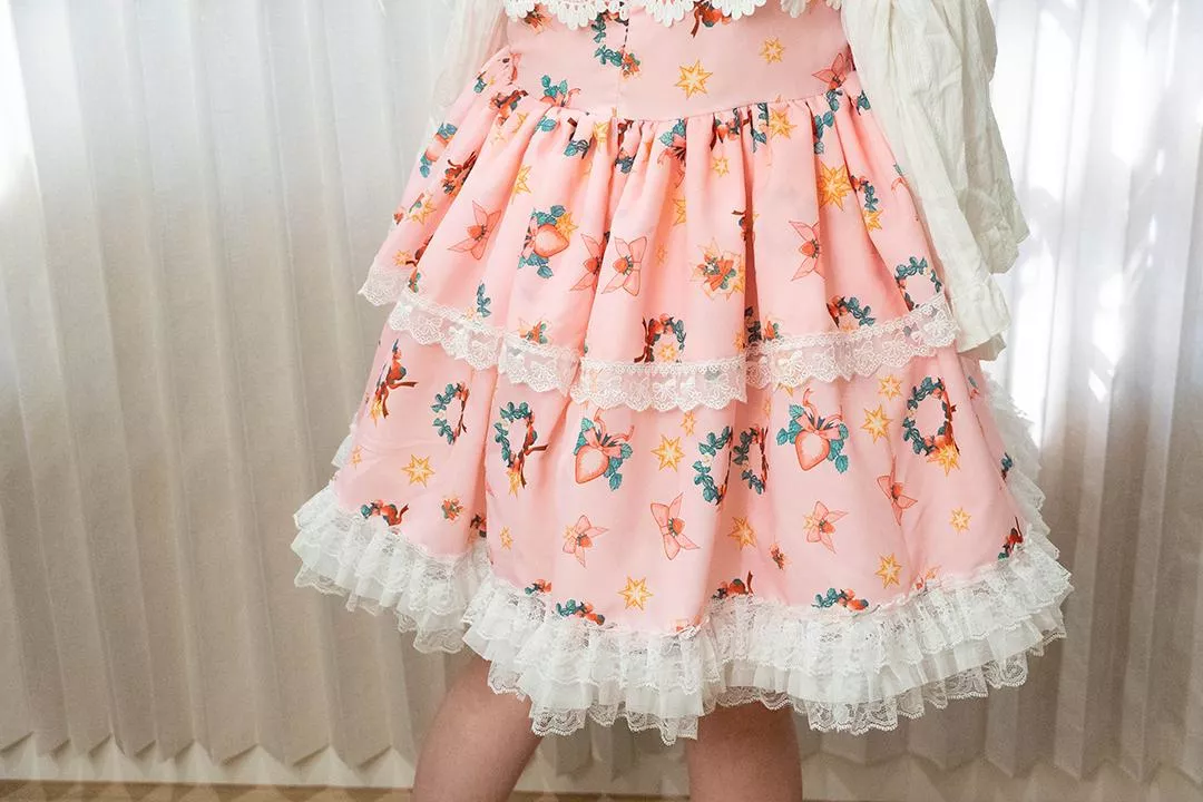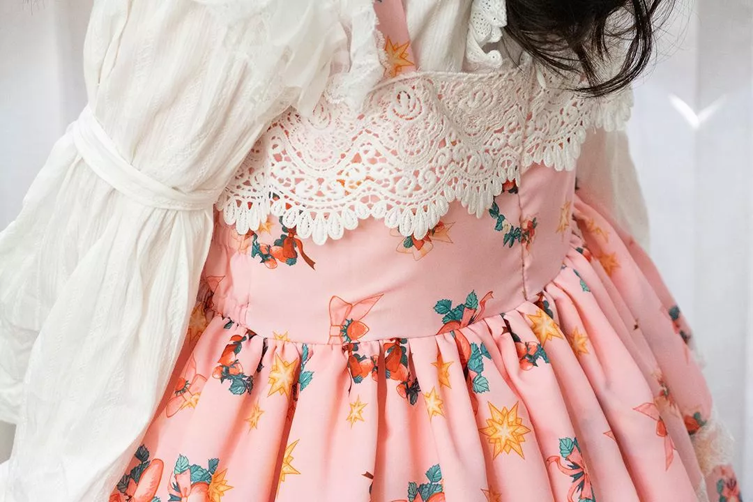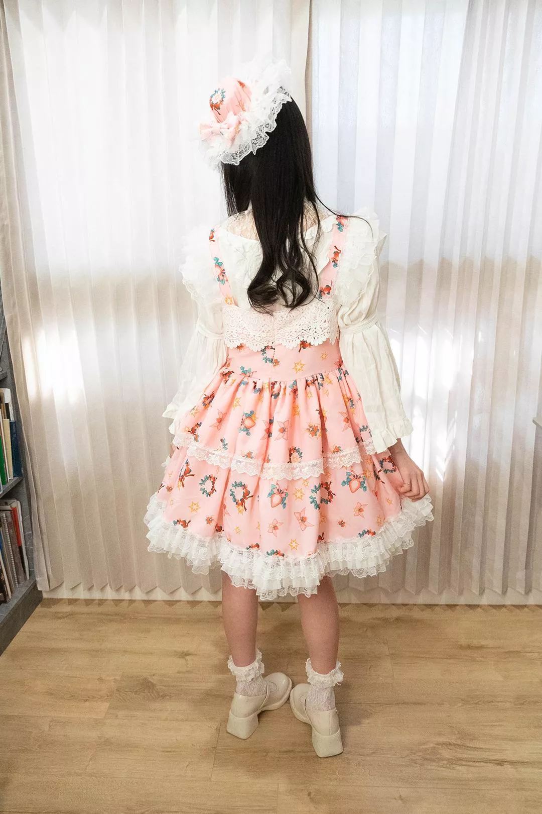 以闆闆珍藏並喜愛的粉色印花布料為主體,將柔和的粉紅色調與細緻圖樣轉化為帶有節慶氣息的「粉紅聖誕」氛圍。裙身以澎度與層次為重點設計,搭配蕾絲與裝飾細節,呈現溫柔中帶有份量感的經典蘿莉塔輪廓。