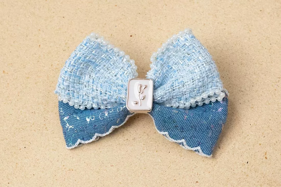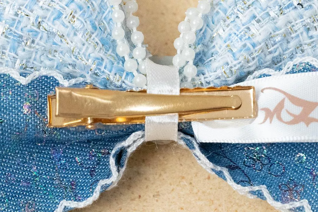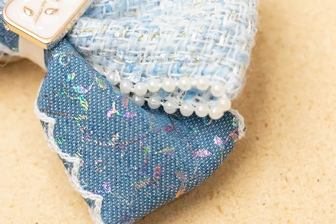 蝴蝶結布料有玫瑰花紋,布面具有立體織紋,搭配小珍珠裝飾增加層次感