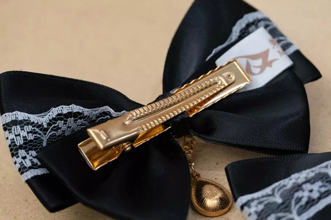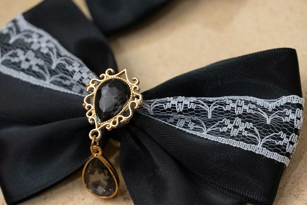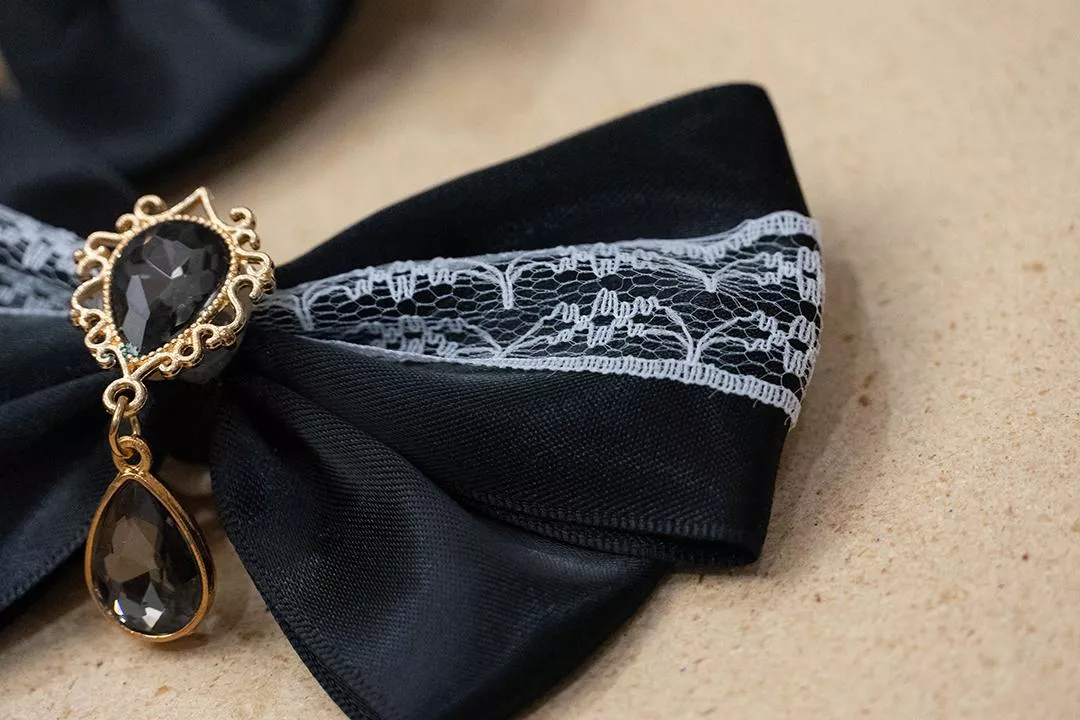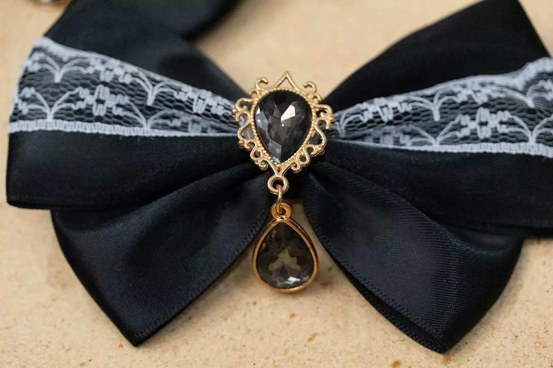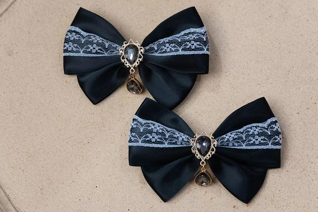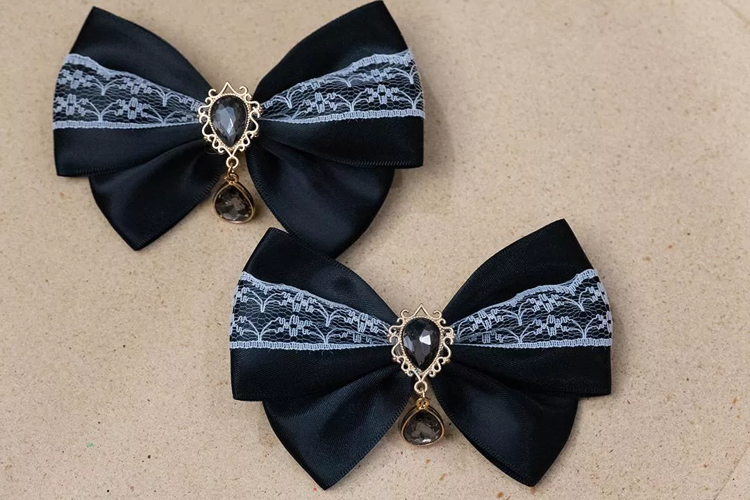 白蕾絲黑緞帶蝴蝶結X黑寶石垂墜吊飾