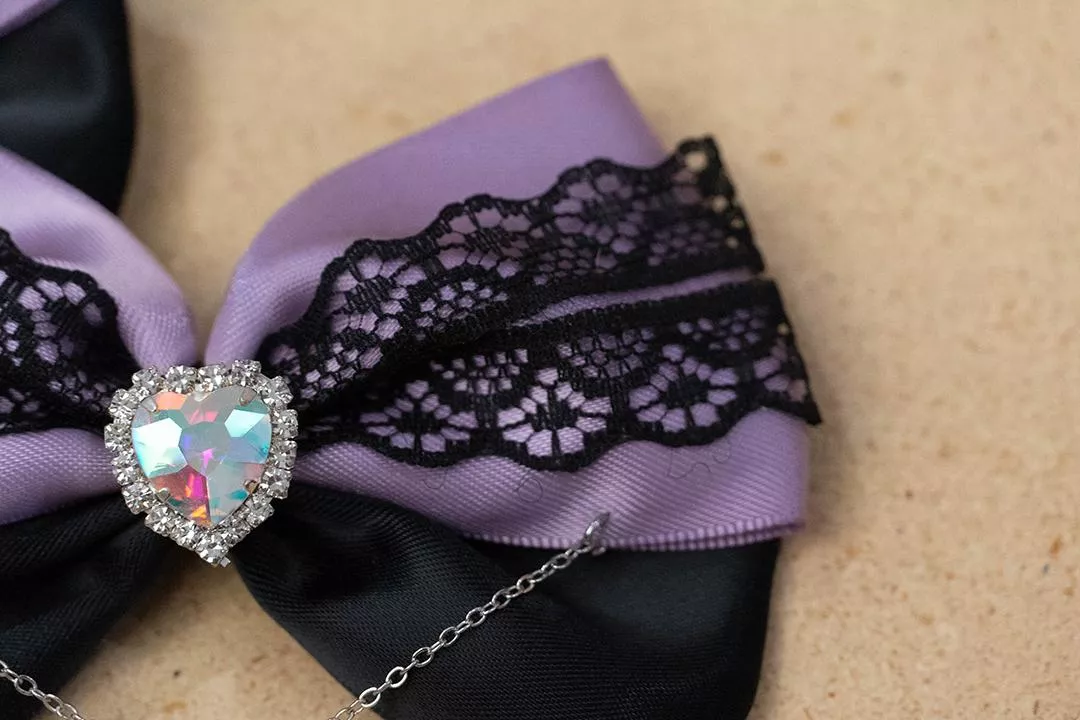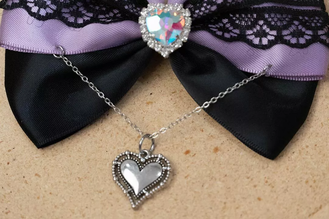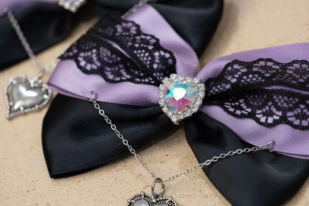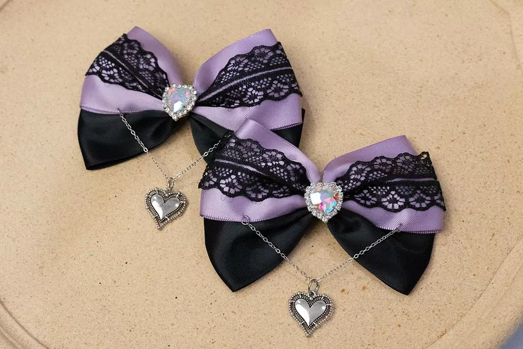 紫色緞帶X心型吊墜裝飾,呈現神秘且高貴氣質,金屬吊墜隨動作擺動,讓你的造型更加靈動