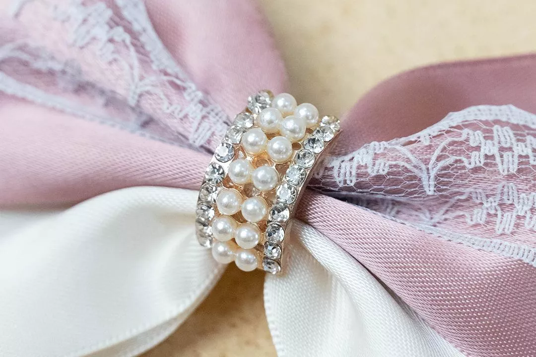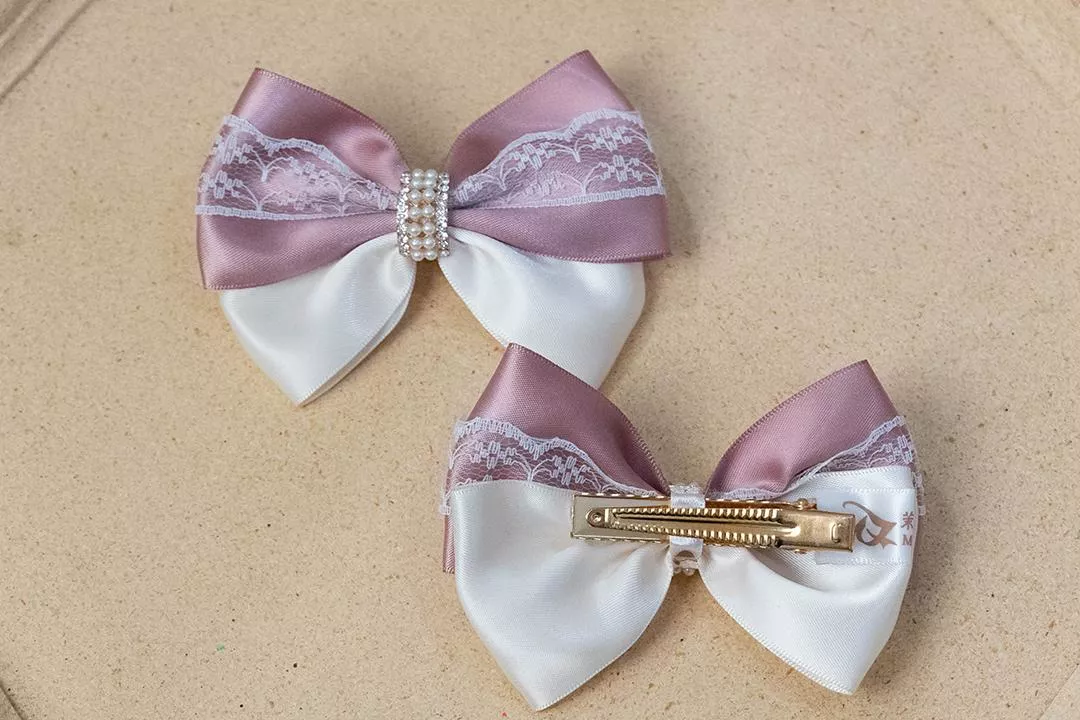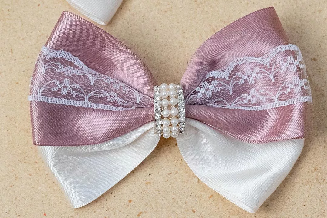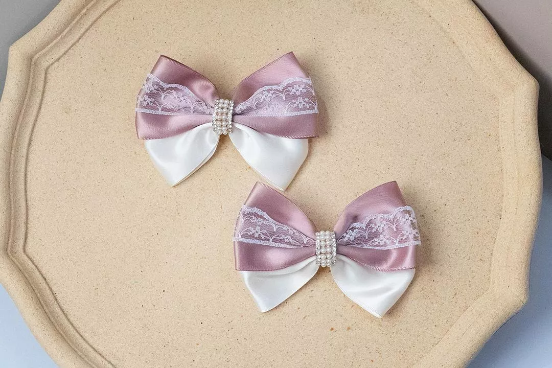 雙層蝴蝶結設計,藕粉色和白色緞帶搭配,中央搭配小珍珠呈現溫柔優雅公主感