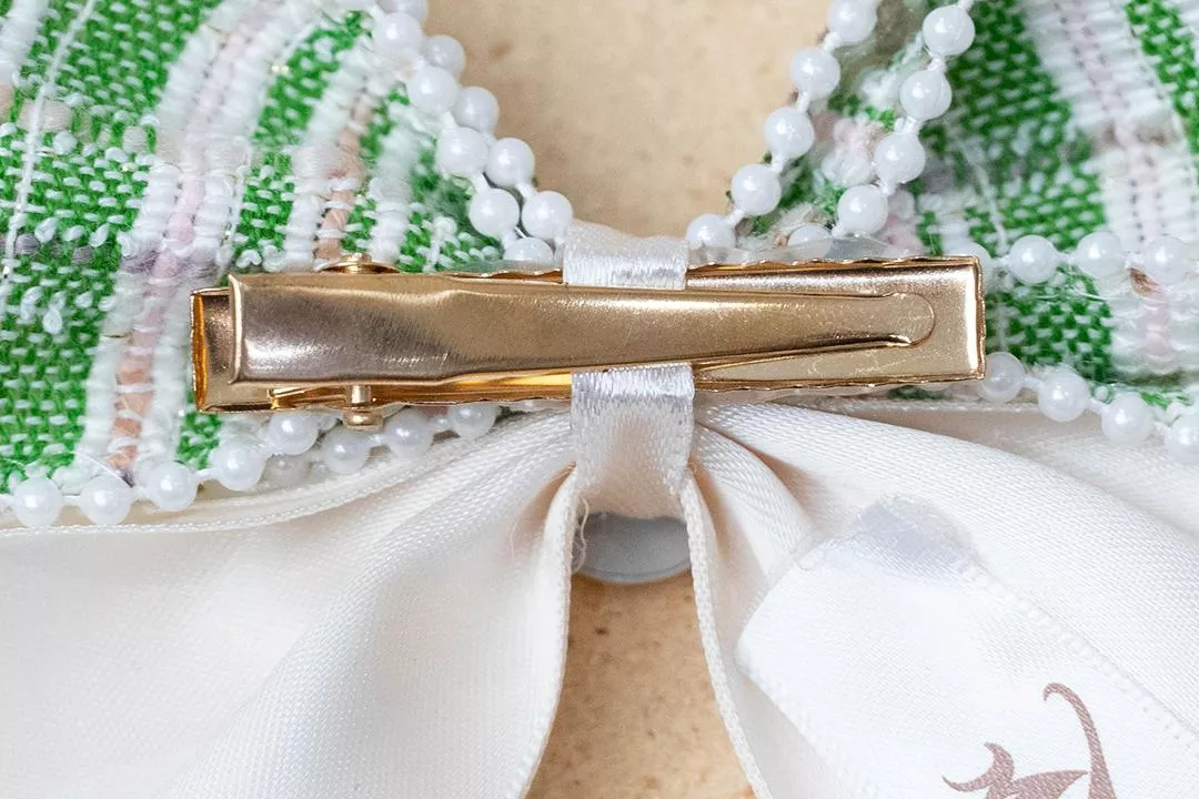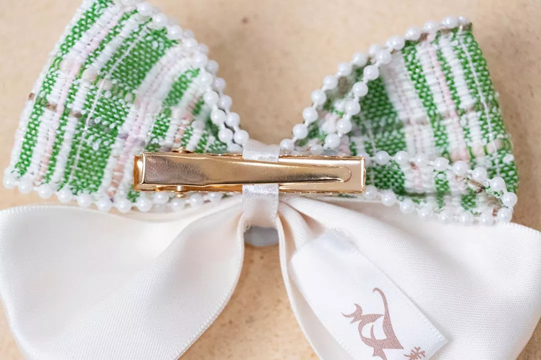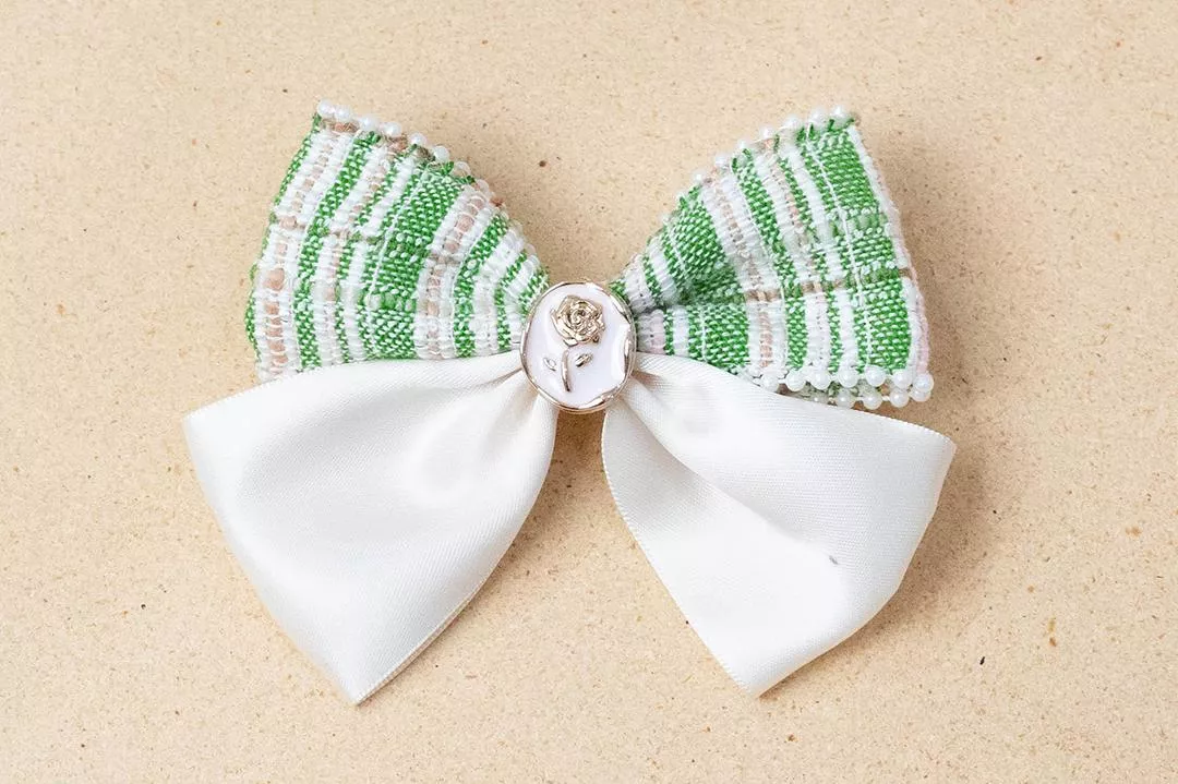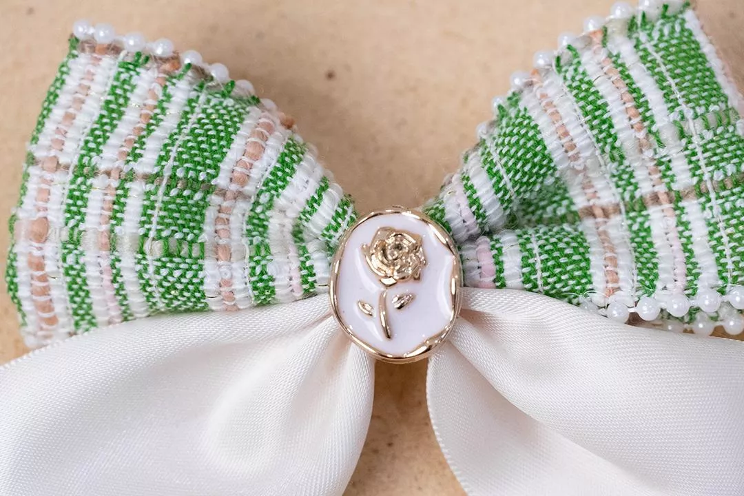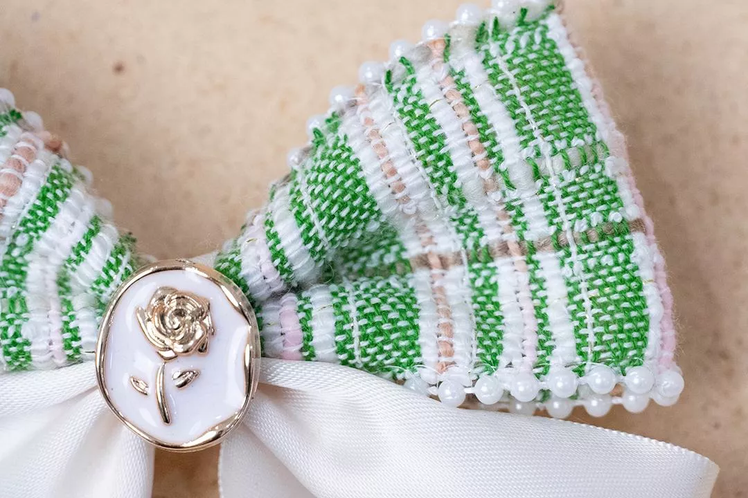 綠色紋理織物,邊緣搭配小珍珠,蝴蝶結中央經紙玫瑰小物