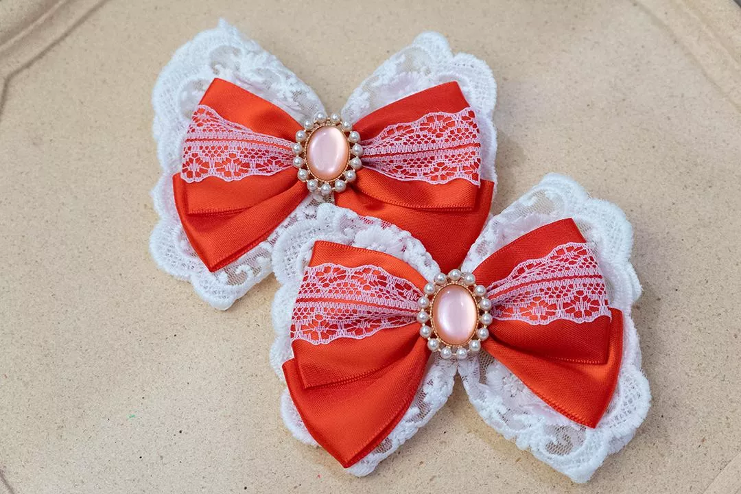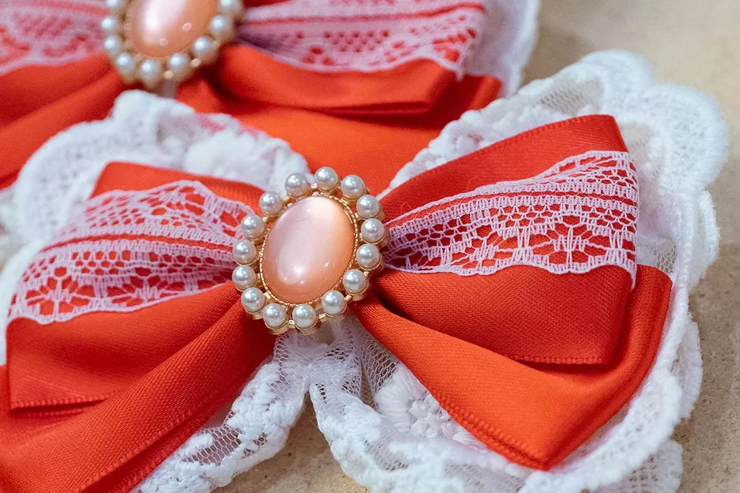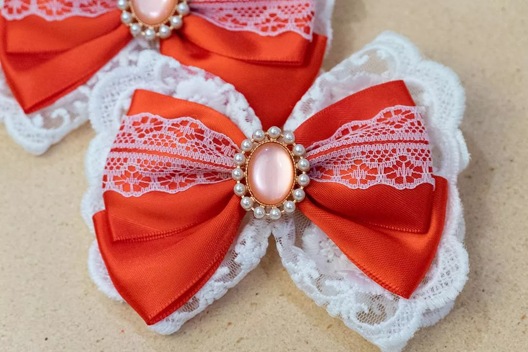 由紅色緞帶、白色蕾絲和鑲有珍珠邊框寶石