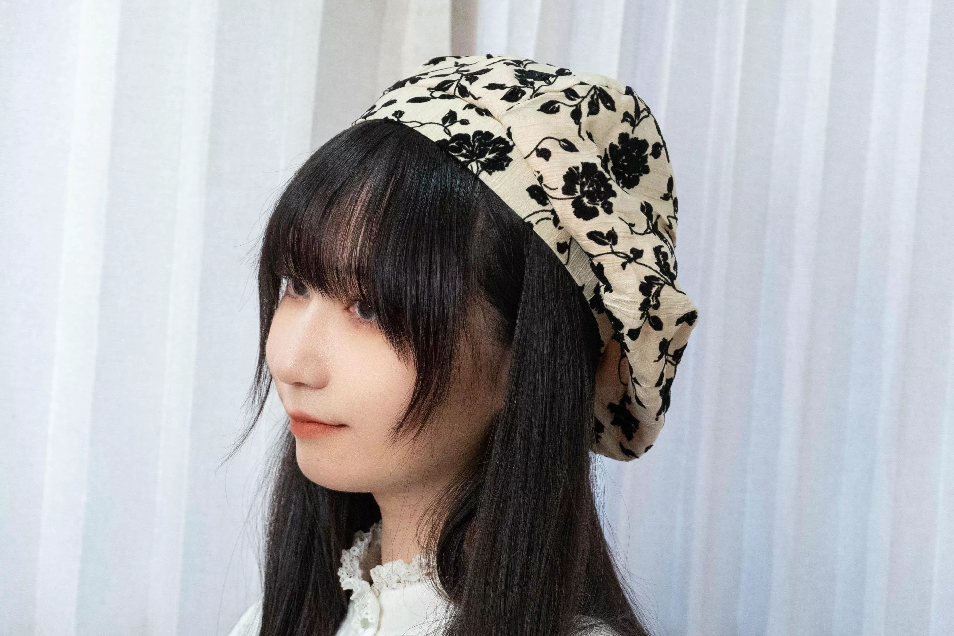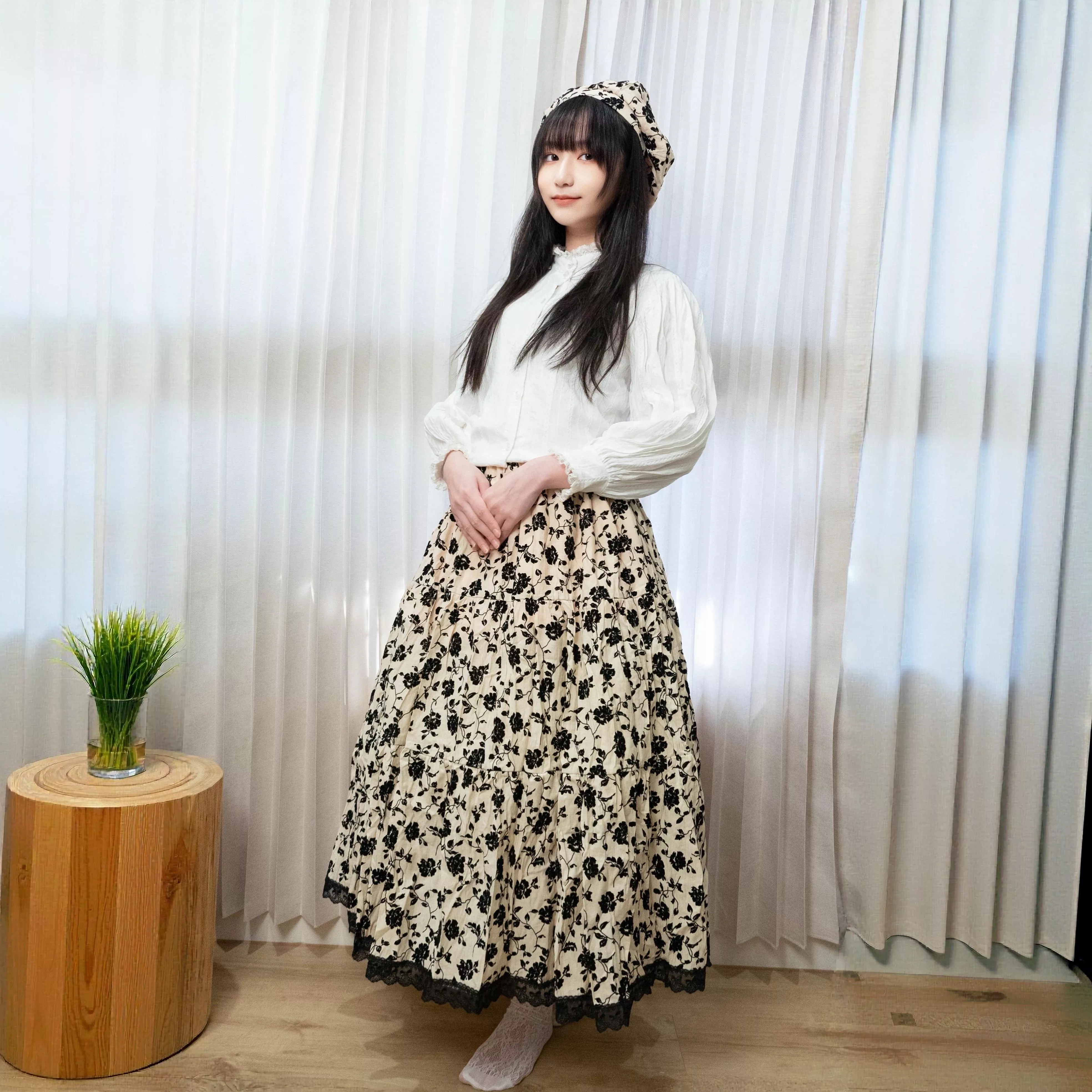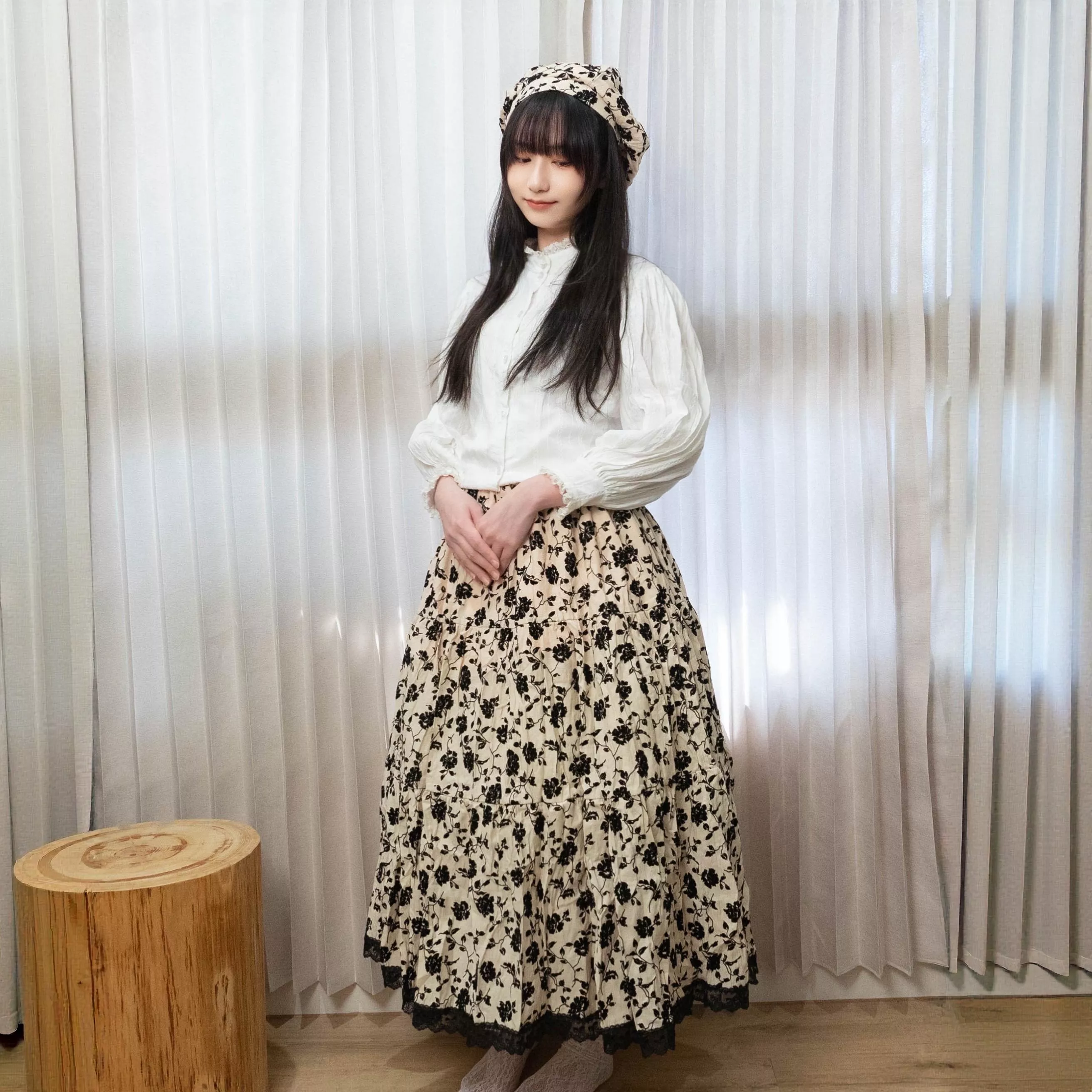 貝雷帽採經典六片式剪裁,帽型挺立優雅;三層蛋糕裙為鬆緊腰設計,裙擺層層堆疊並飾以同色蕾絲滾邊,展現細膩與輕盈。帽子與裙子皆內襯粉嫩里布,低調隱藏浪漫氣息。