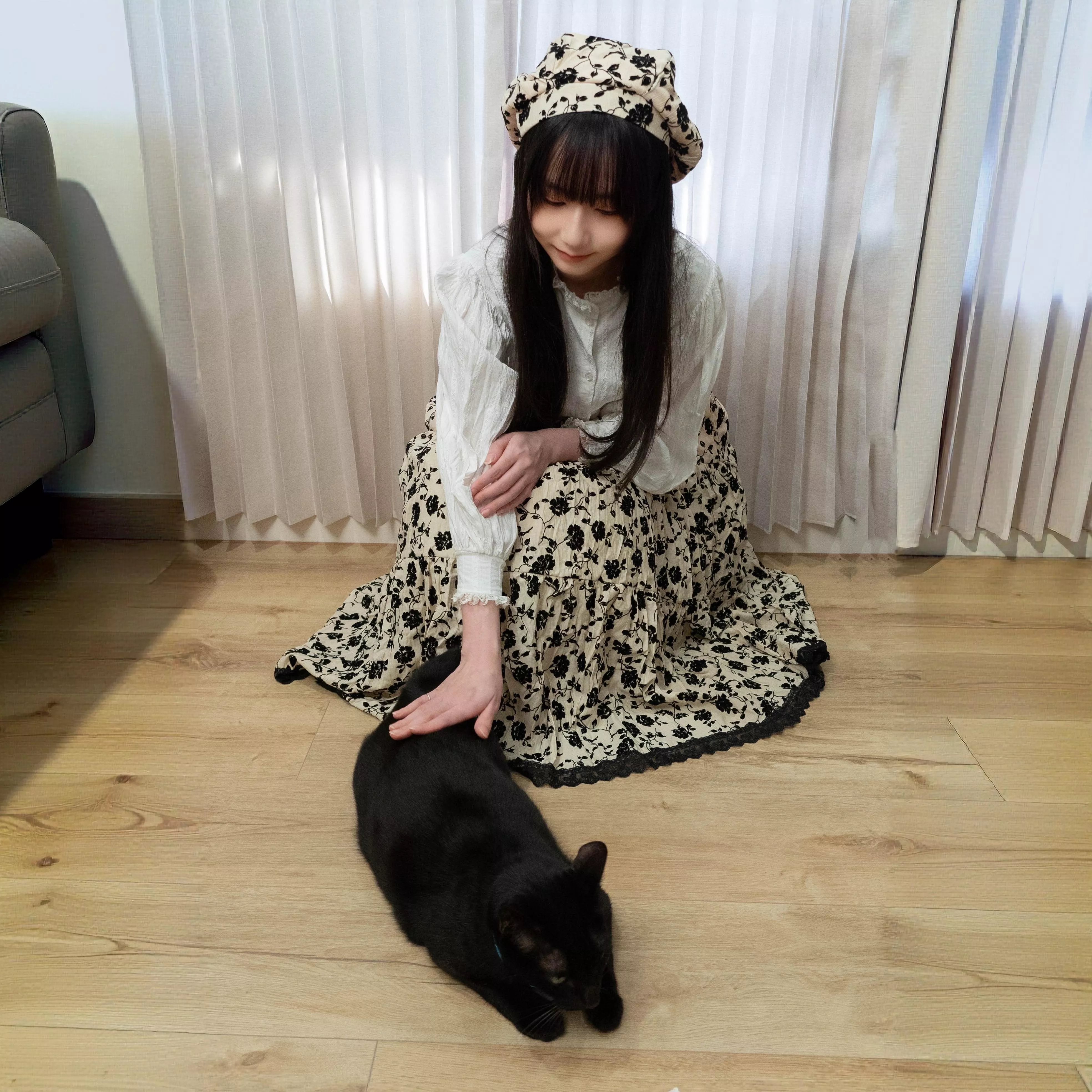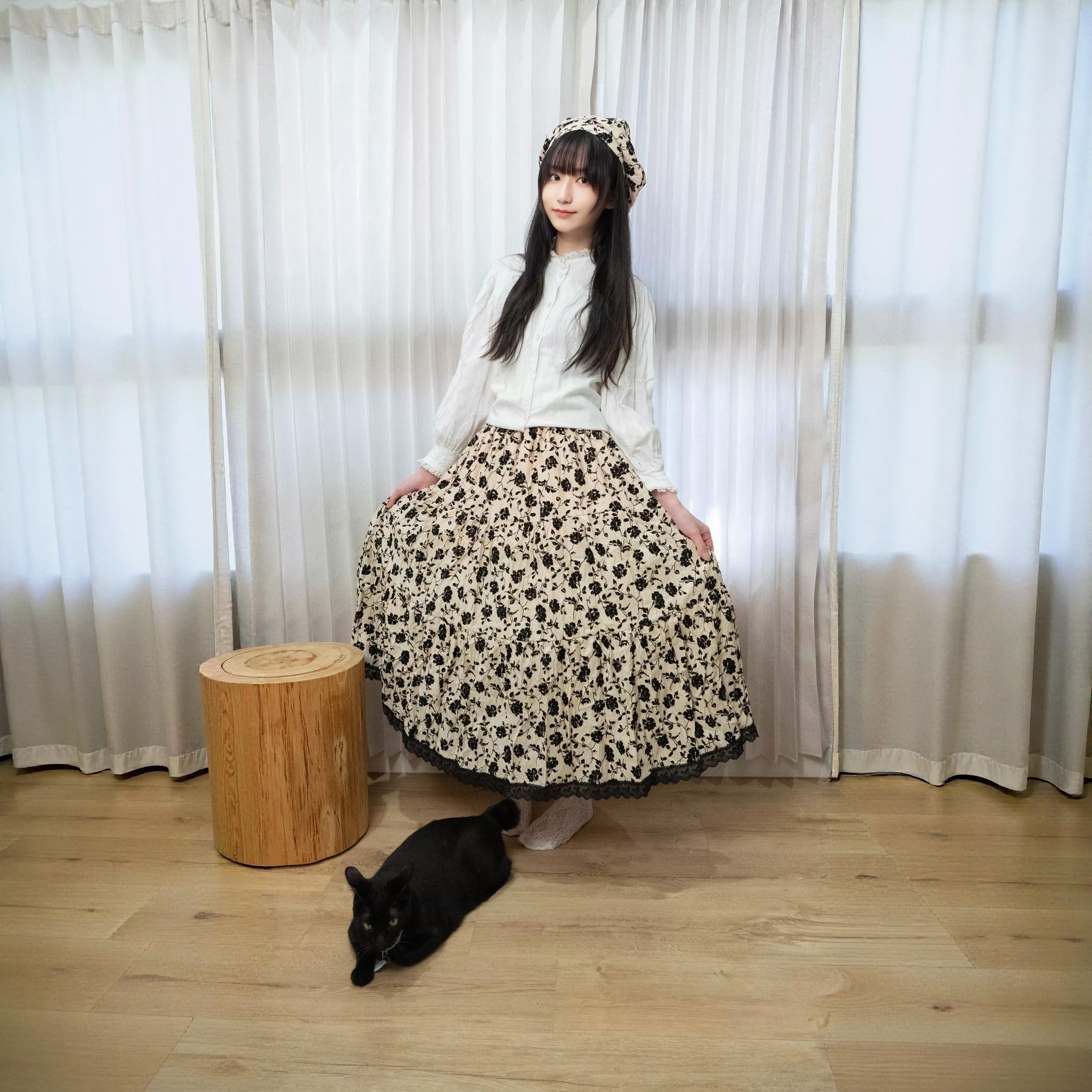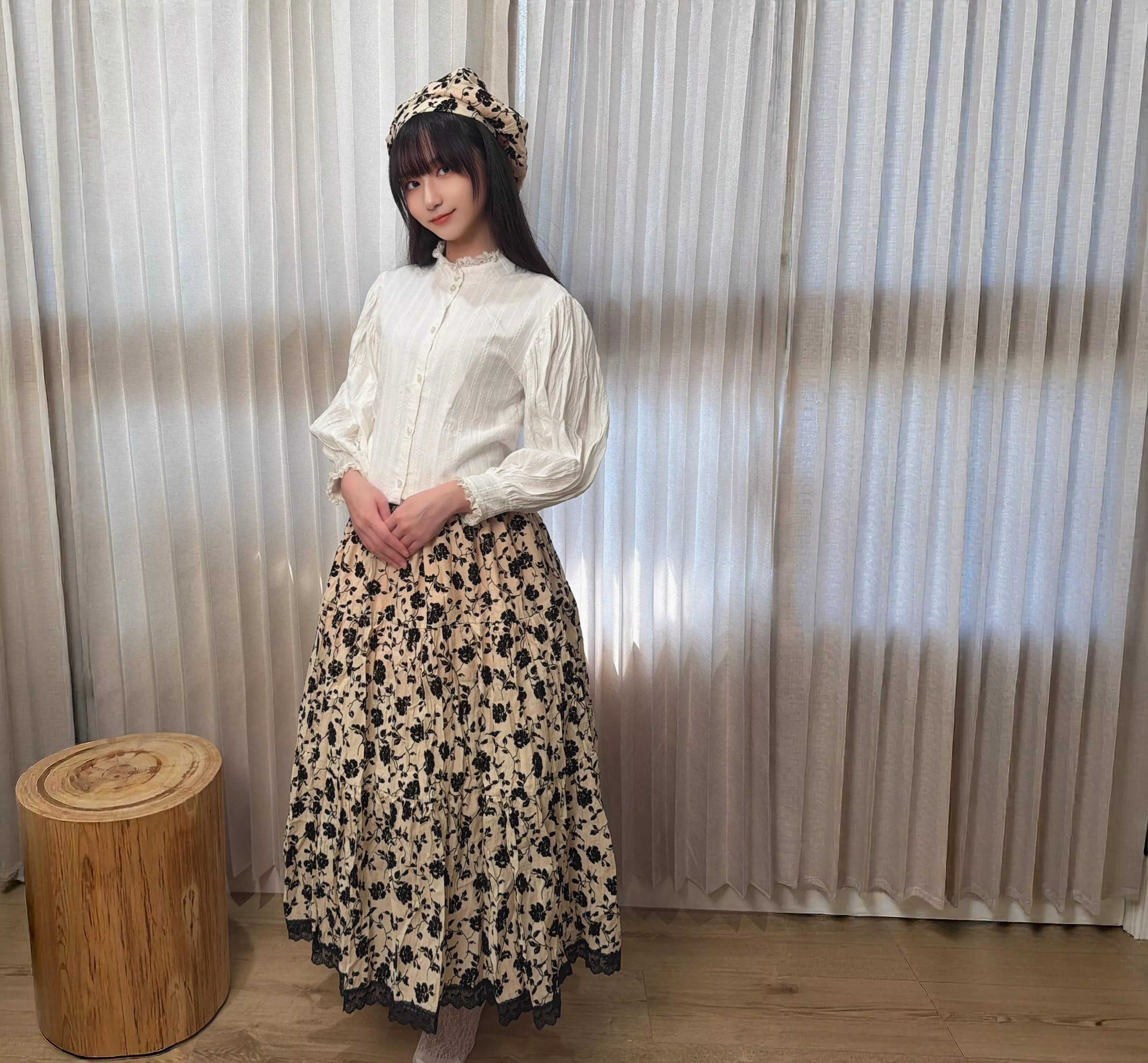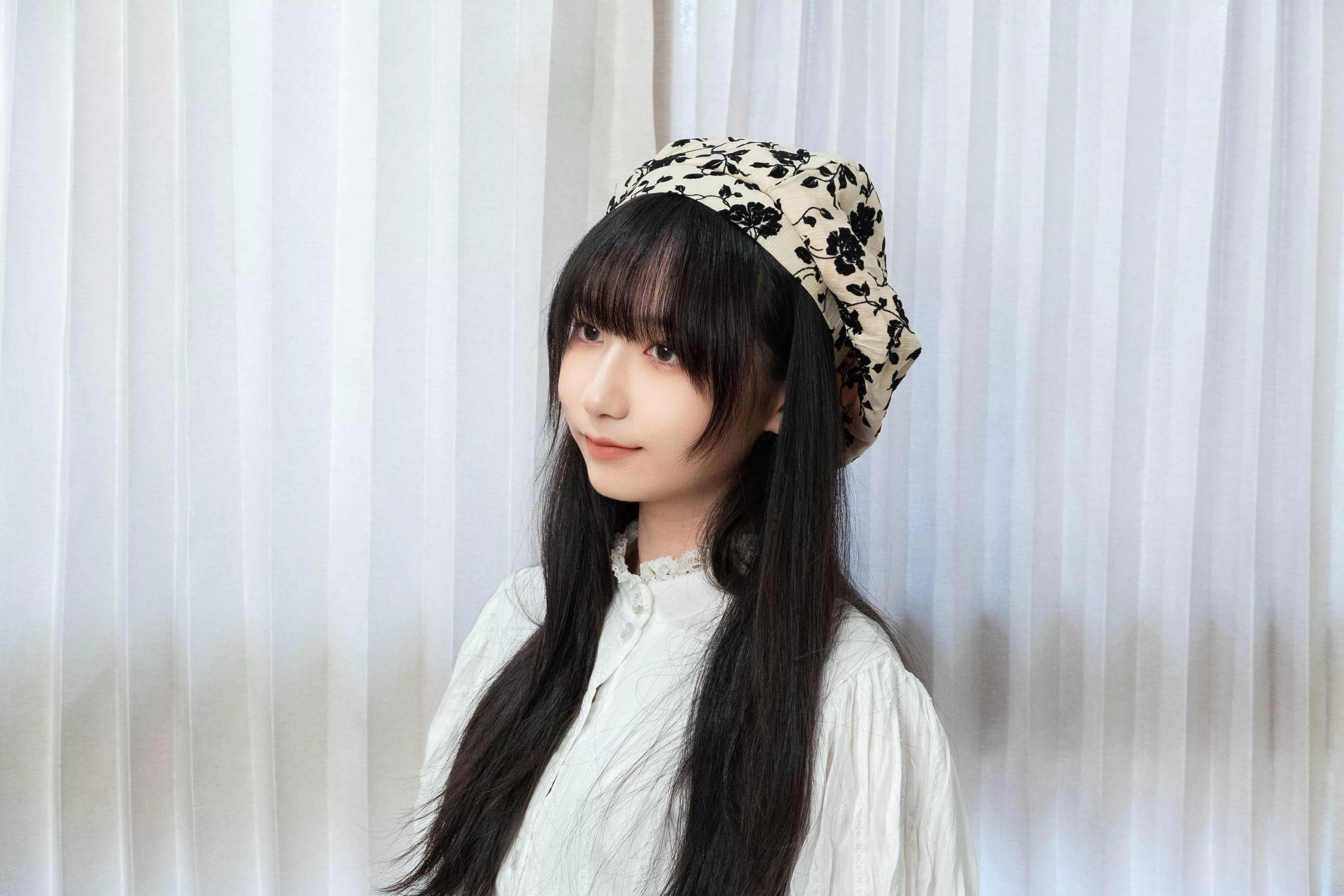 貝雷帽採經典六片式剪裁,帽型挺立優雅;三層蛋糕裙為鬆緊腰設計,裙擺層層堆疊並飾以同色蕾絲滾邊,展現細膩與輕盈。帽子與裙子皆內襯粉嫩里布,低調隱藏浪漫氣息。