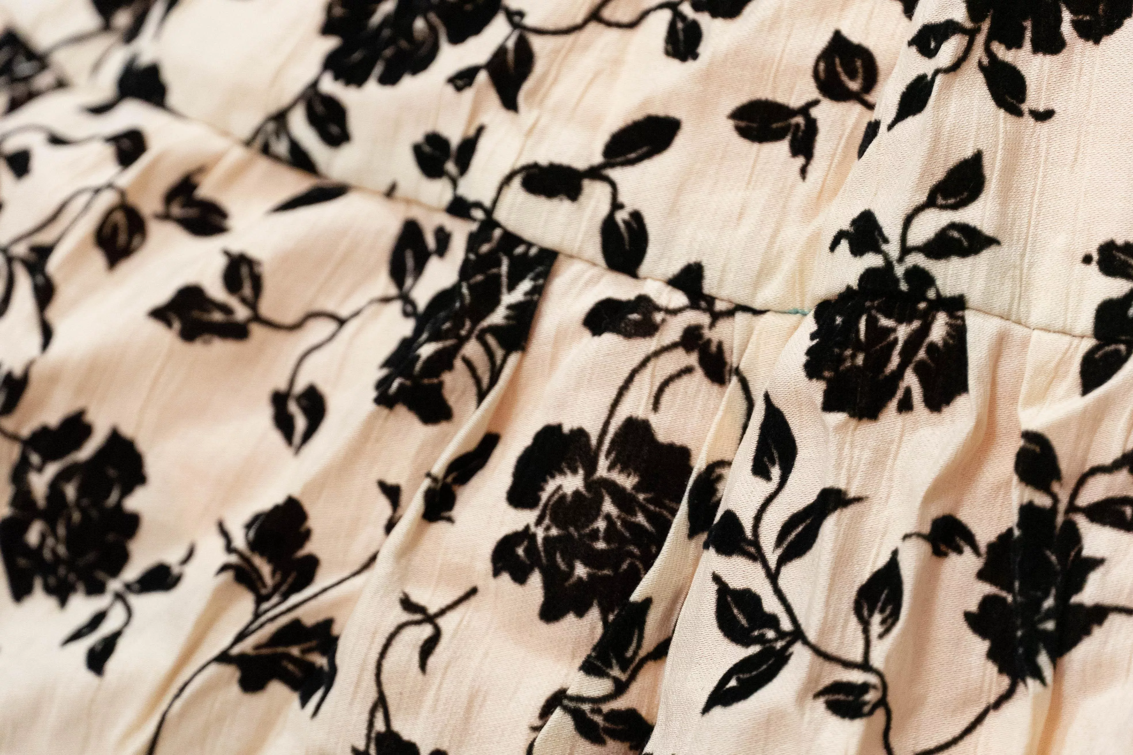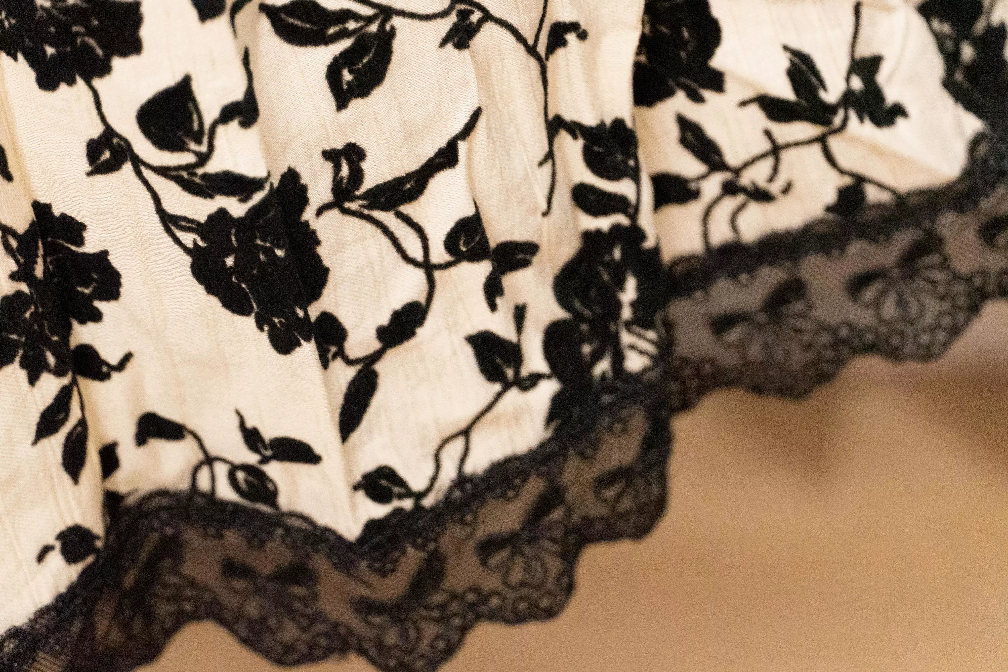 本套裝選用植絨刺繡布料,表面為米白色直條紋中透出細緻花草紋樣,溫柔中帶著質感的立體層次。